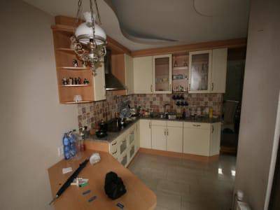 Woonkeuken van 17 m2 met geslepen natuursteenlook vloertegels. Roomwitte keuken met beuken details en veel kastruimte, graniet aanrechtblad, getrommelde tegel achterwand en de navolgende inbouwapparatuur: combimagnetron, vaatwasser, keramische kookplaat en rvs afzuigschouw.