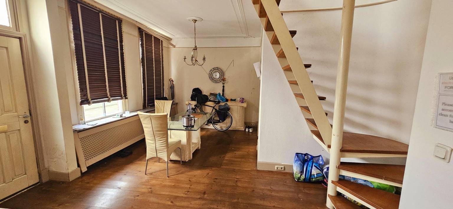 Entree. Woonkamer van totaal 40 m2 met authentiek gerestaureerd gestuukt plafond, open haard, granieten vensterbanken, grenen vloerdelen vloer, structuur wandafwerking. Hoge plafonds van 3.20 cm, vaste kast met geslepen glas en open trap in woonkamer.
