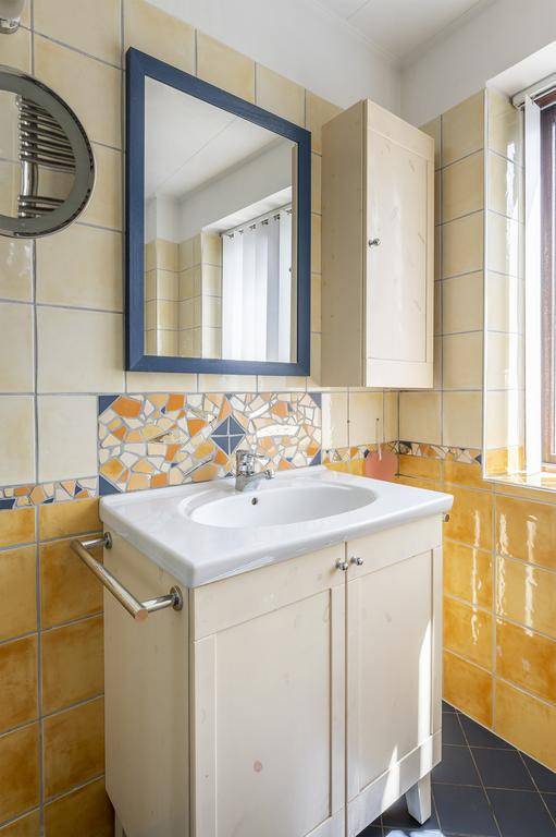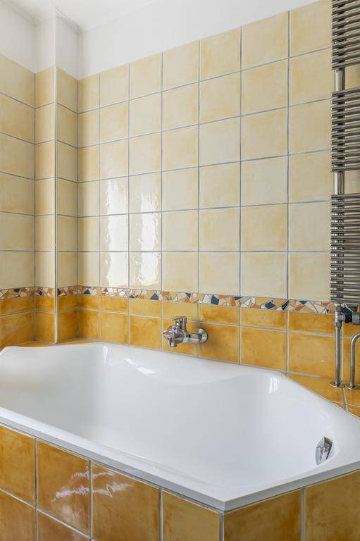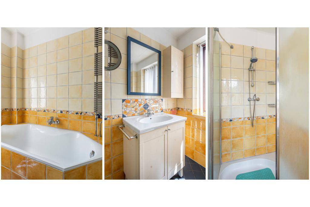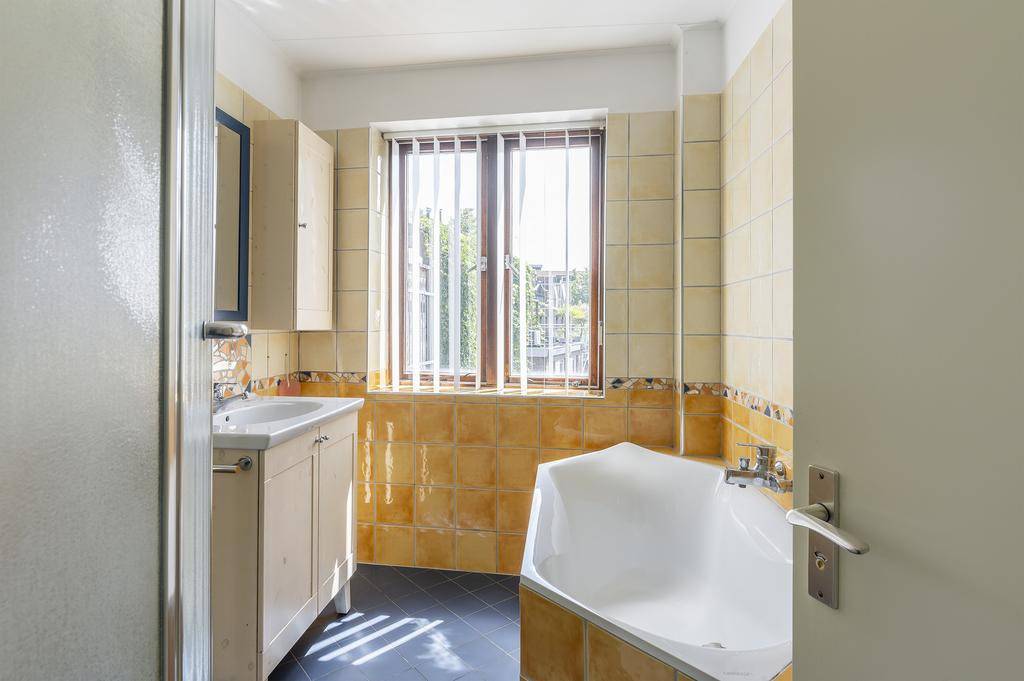 De overloop biedt toegang tot een ruime woonkamer, badkamer en trapopgang naar de tweede verdieping. De woonkamer heeft grote ramen en de badkamer is uitgerust met een ligbad, douchecabine, wastafel met meubel, inbouwspots en een raam.