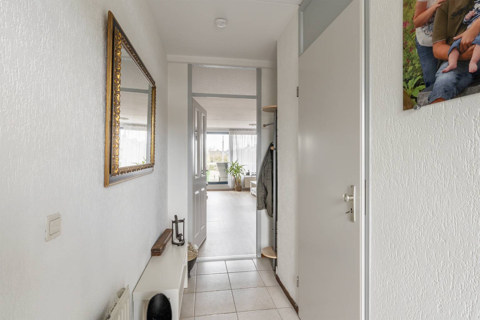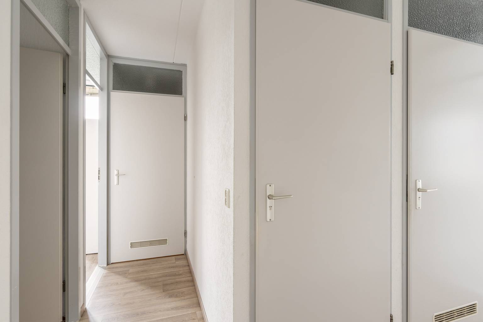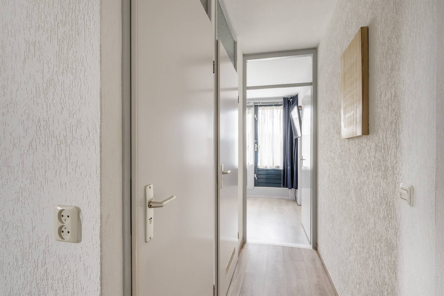 De tussen gelegen hal maakt de verbinding naar de drie slaapkamers, de badkamer, het toilet en de vaste kast met de aansluiting voor de wasmachine en de droger. Ook hier is de vloer, net als de woonkamer, voorzien van vinyl en zijn de wanden afgewerkt met granol.
