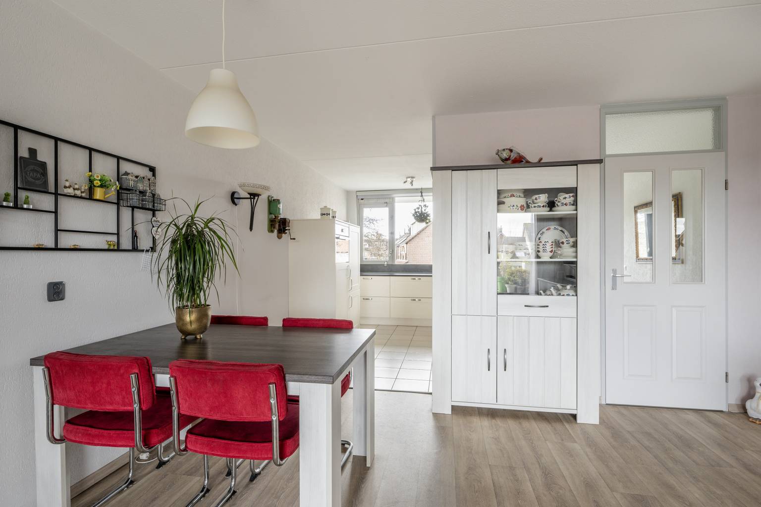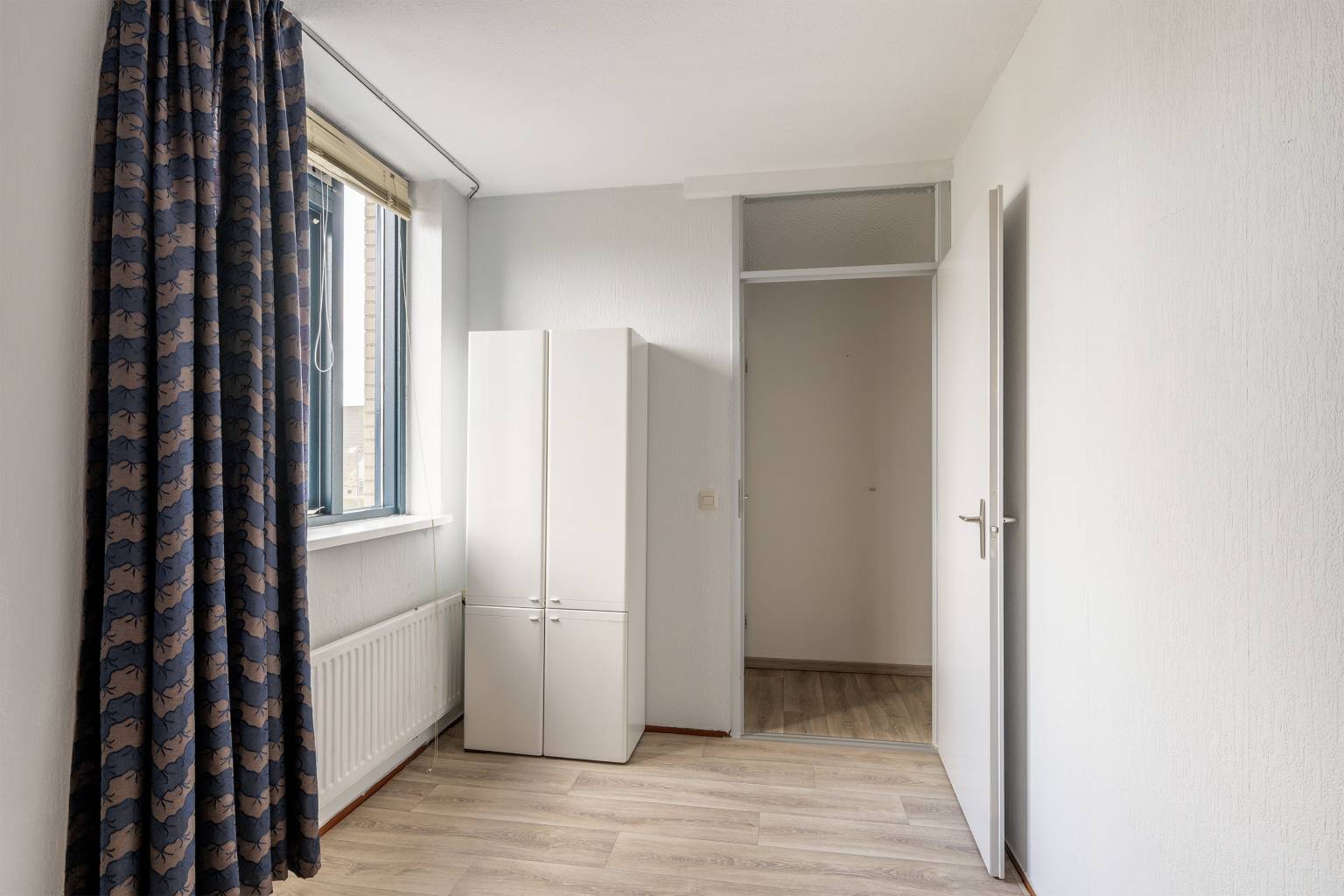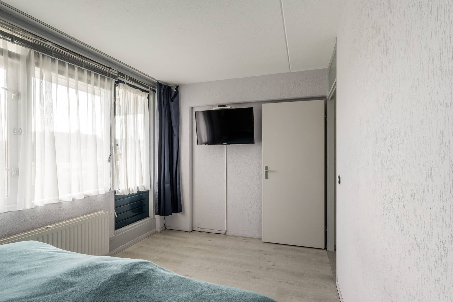 De tussen gelegen hal maakt de verbinding naar de drie slaapkamers, de badkamer, het toilet en de vaste kast met de aansluiting voor de wasmachine en de droger. Ook hier is de vloer, net als de woonkamer, voorzien van vinyl en zijn de wanden afgewerkt met granol.