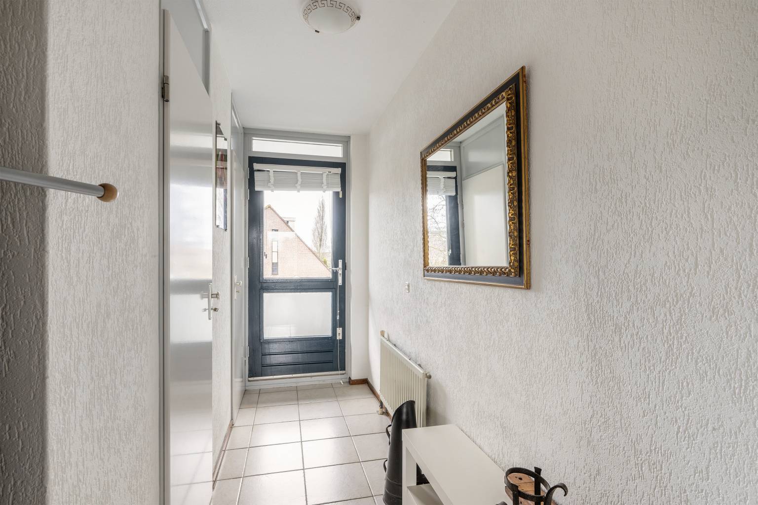 Entreehal is toegankelijk vanaf de galerij. Op de vloer liggen plavuizen en de wanden zijn afgewerkt met granol. In de hal bevinden zich de meterkast en een vaste kast met de opstelling van de Cv-ketel. Vanuit hier is er toegang tot de woonkamer.