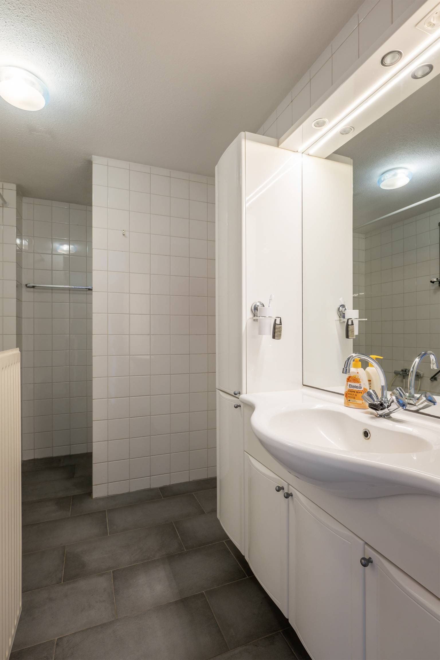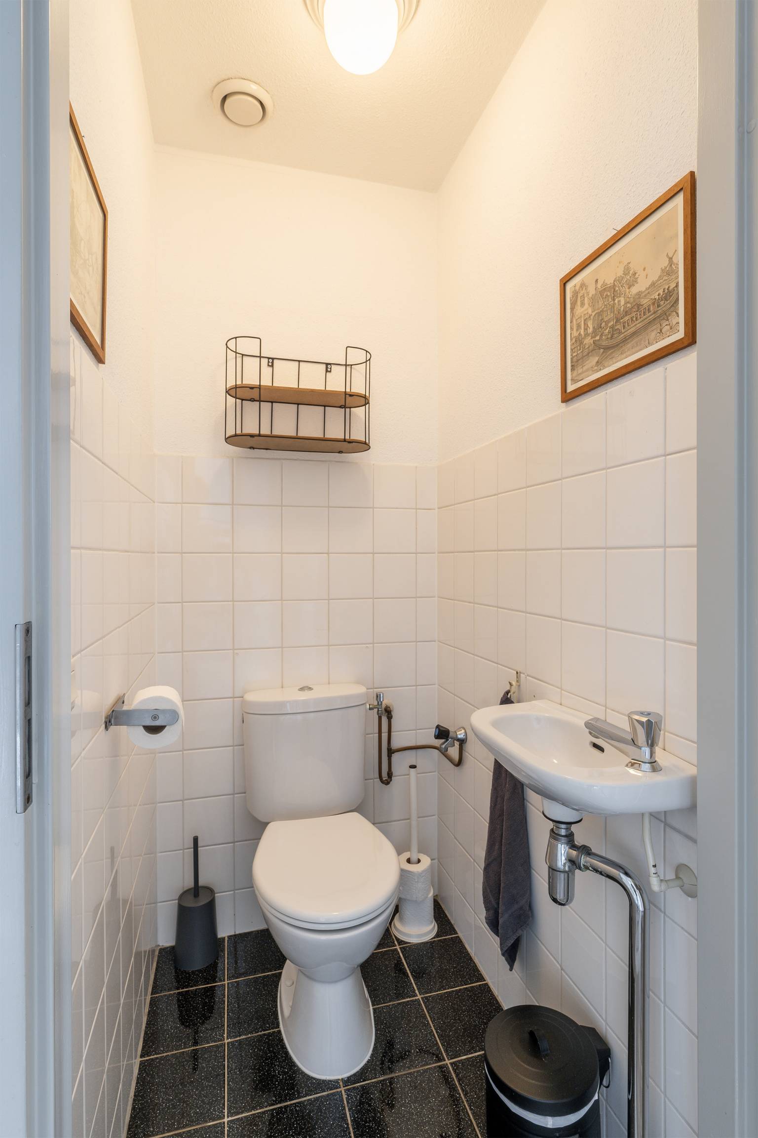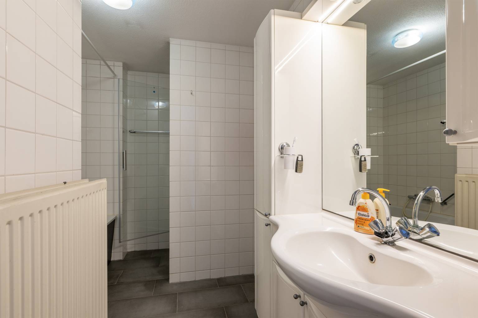 Het toilet is gedeeltelijk betegeld en voorzien van een staande toiletpot, een fonteintje en een afzuigpunt. De badkamer is volledig betegeld en beschikt over een douchecabine, een ligbad met een handdouche, een wastafelmeubel met daarboven een spiegel en verlichting en er is een radiator aanwezig.