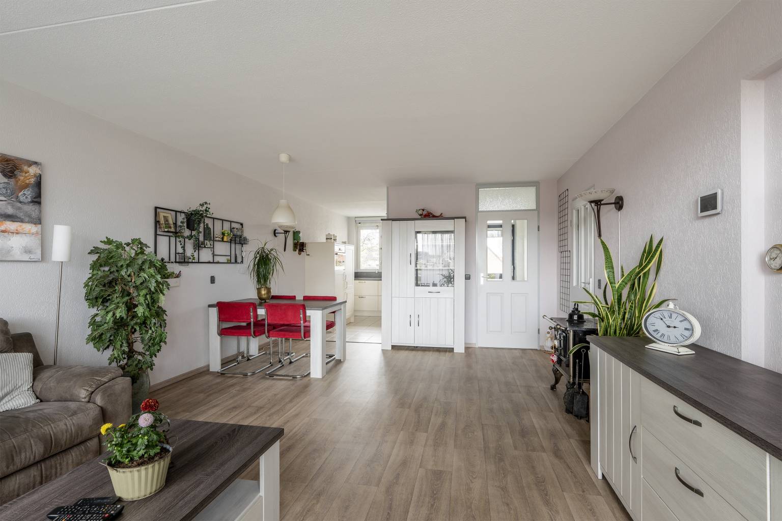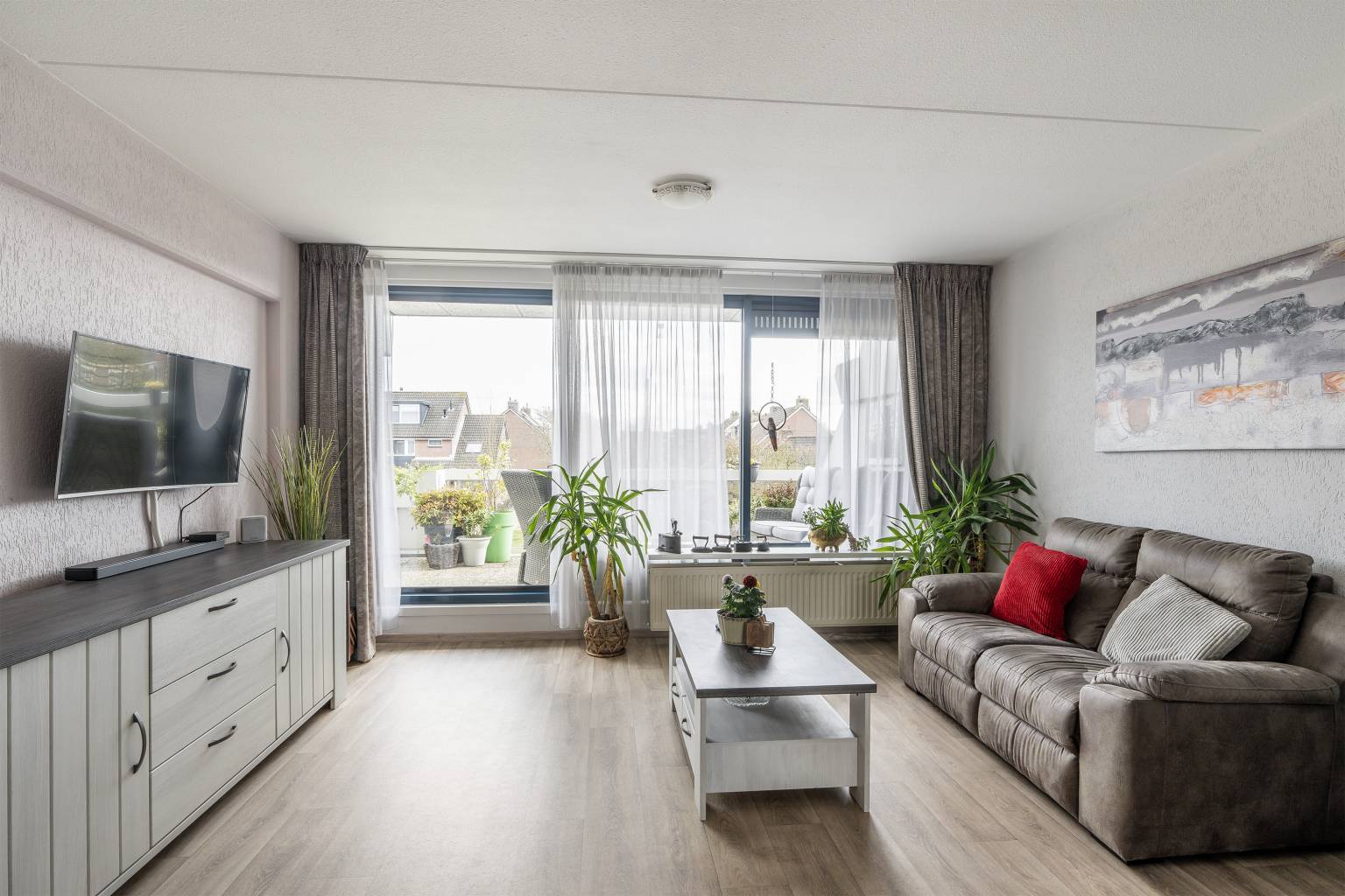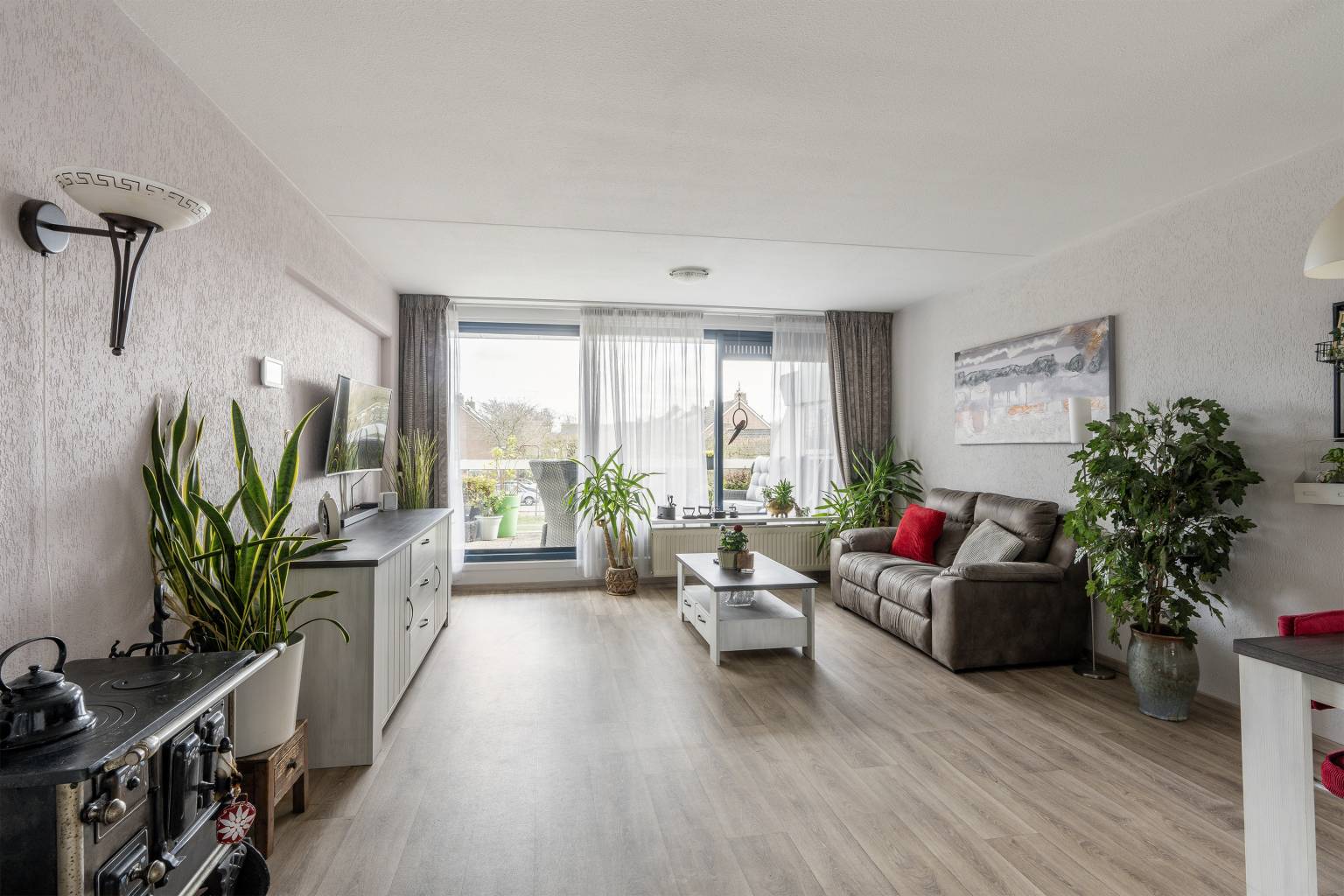 Lichte woonkamer met een grote aluminium schuifpui naar het aangrenzende terras aan de voorzijde. De vloer is voorzien van vinyl en de wanden zijn afgewerkt met granol. Vanuit hier is er toegang tot de half open keuken en een hal.