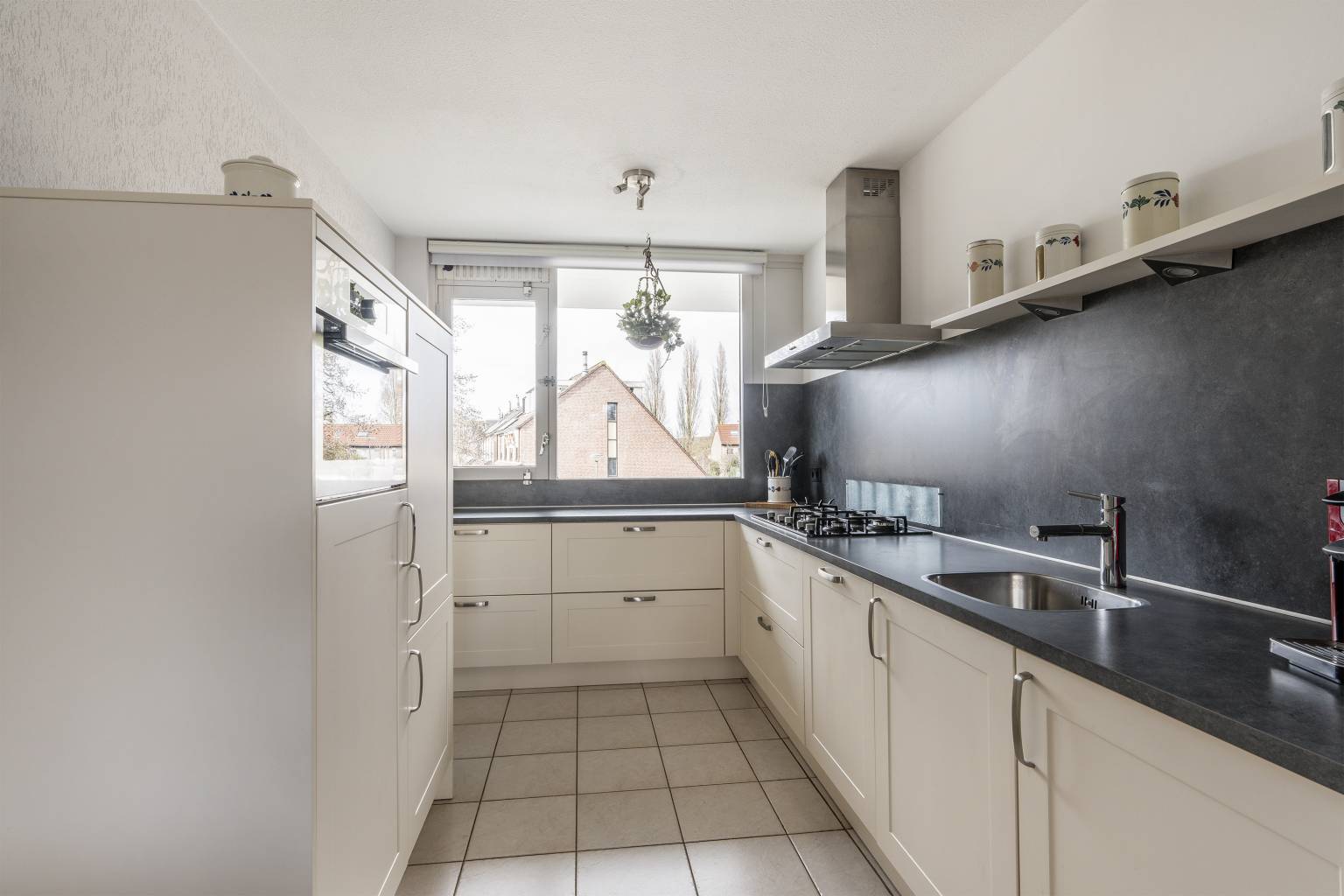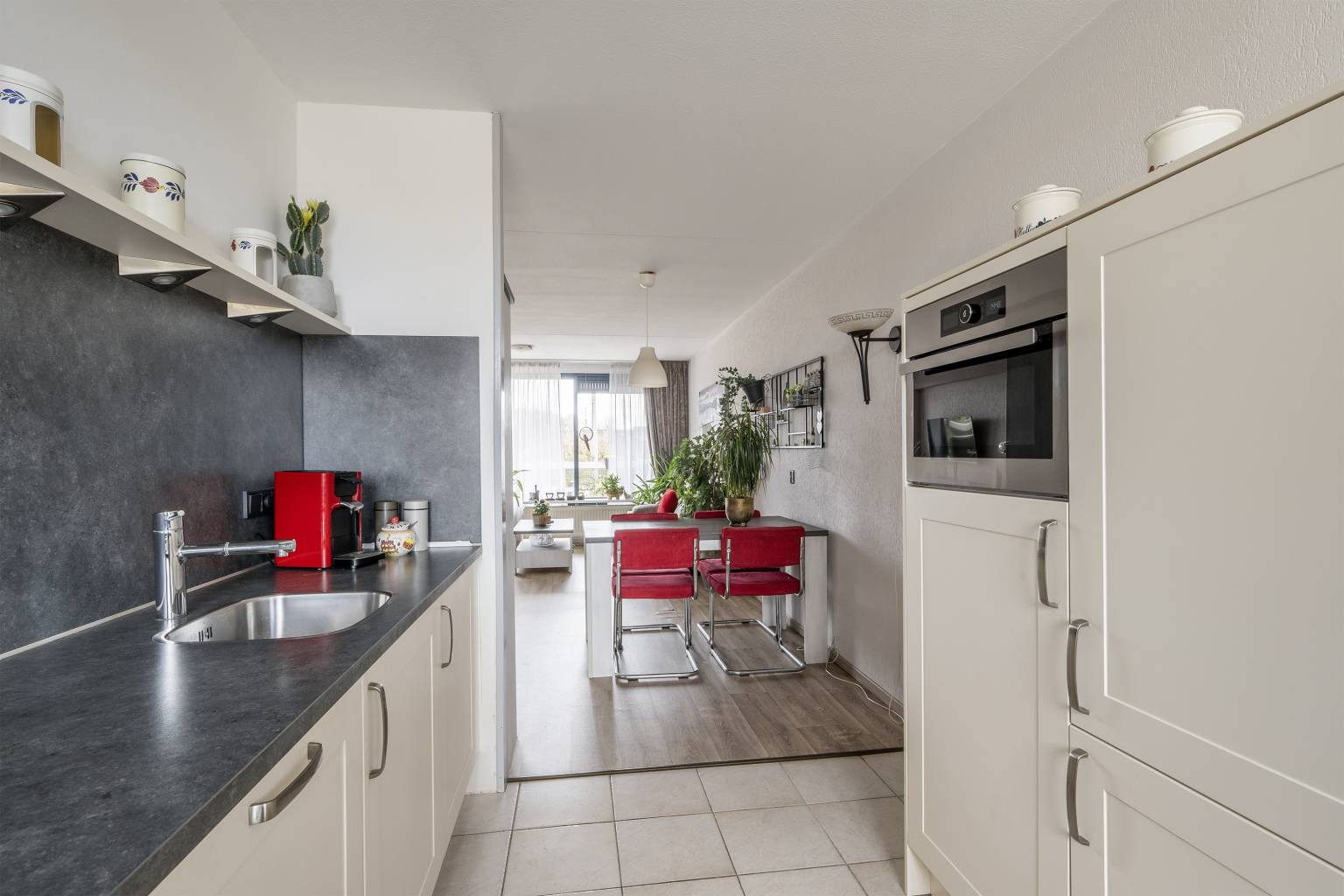 De keuken is geplaatst in een hoekopstelling en heeft een aparte kastenwand. De keuken is uitgevoerd in een lichte teint en voorzien van een donker gemêleerd aanrechtblad, die doorloopt naar de achterwand. Er is diverse inbouwapparatuur aanwezig, zoals een koelkast, een vriezer, een combi oven/magnetron, een vaatwasser, een 5-pits gaskookplaat en een afzuigkap met verlichting. De vloer is voorzien van dezelfde plavuizen als de entreehal en er is een te openen raam met zicht naar de galerij.