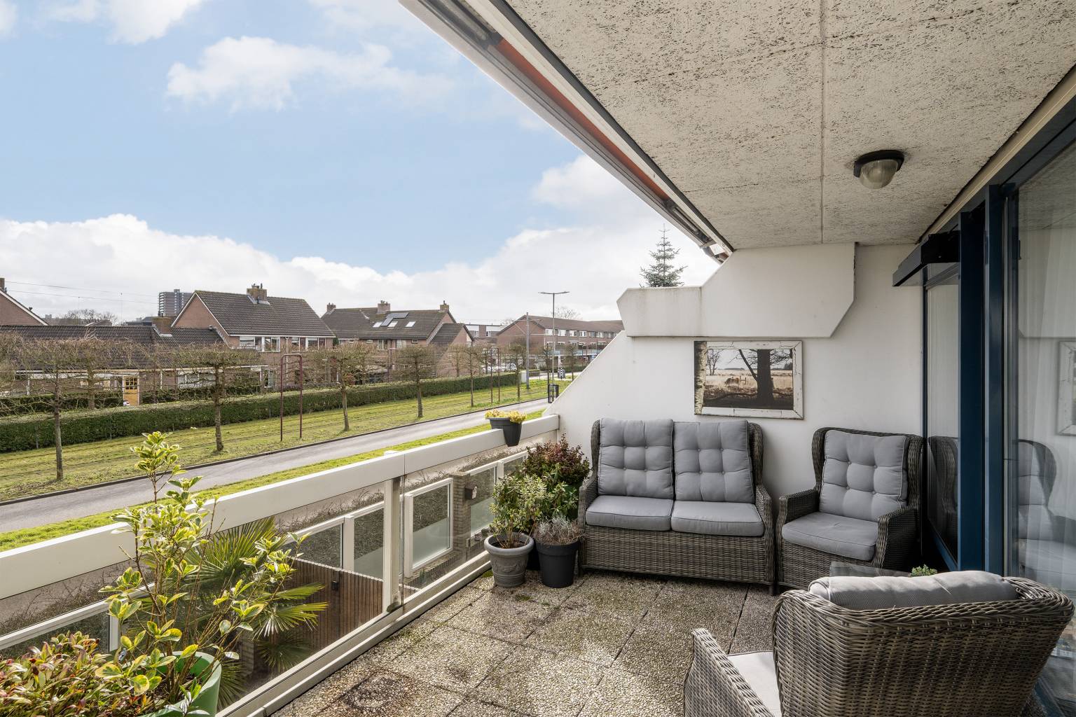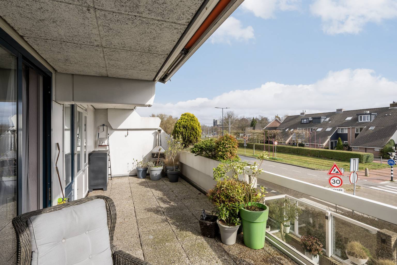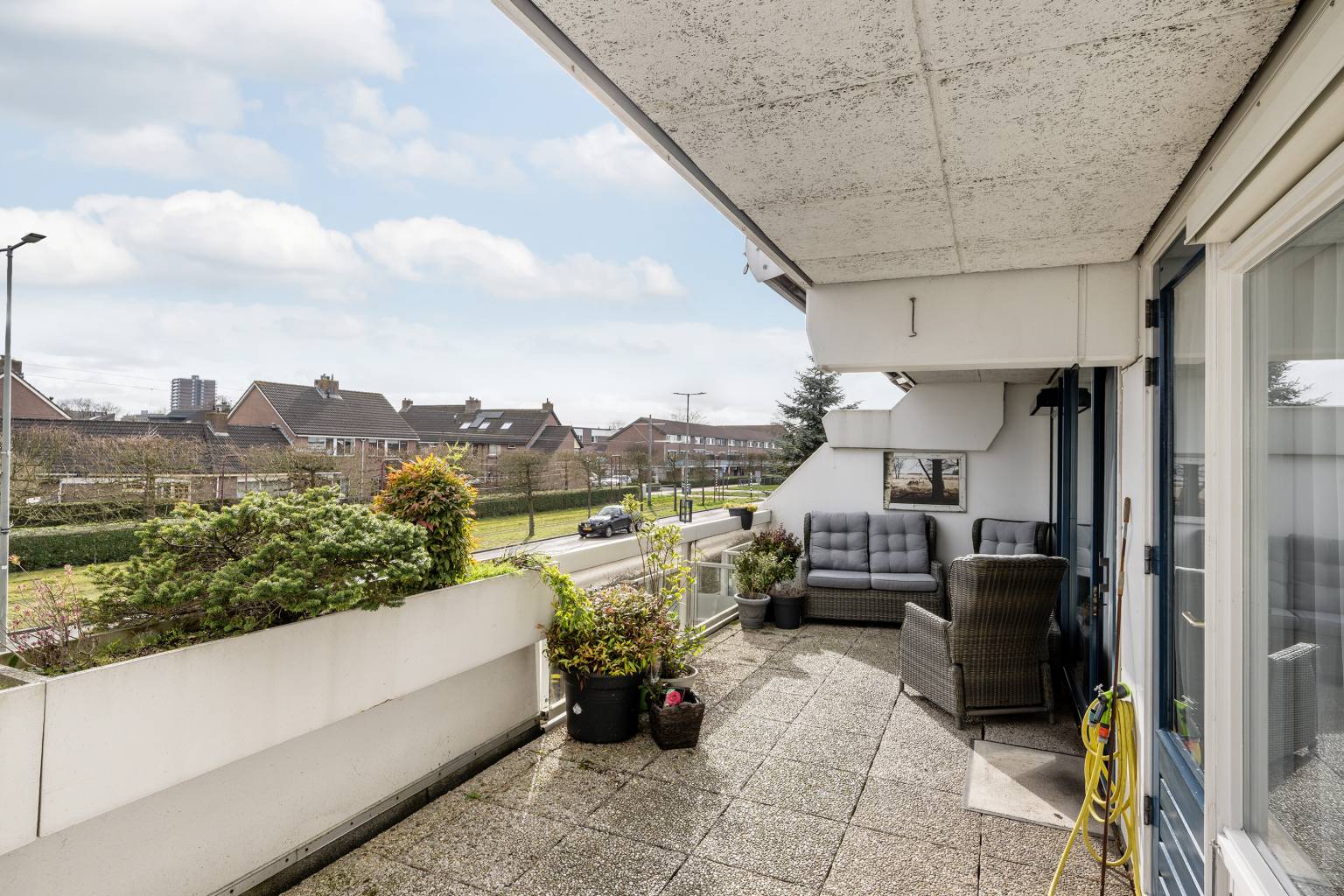 Het aan de voorzijde gelegen terras is een fijne plek met een levendig uitzicht. Het is gedeeltelijk overdekt door het bovengelegen balkon en ter afscheiding is er gedeeltelijk een glazen balustrade en een plantenbak met planten. Op de vloer liggen siergrind tegels en aan de gevel hangt een waterkraantje en een uitvalscherm (handbediend).