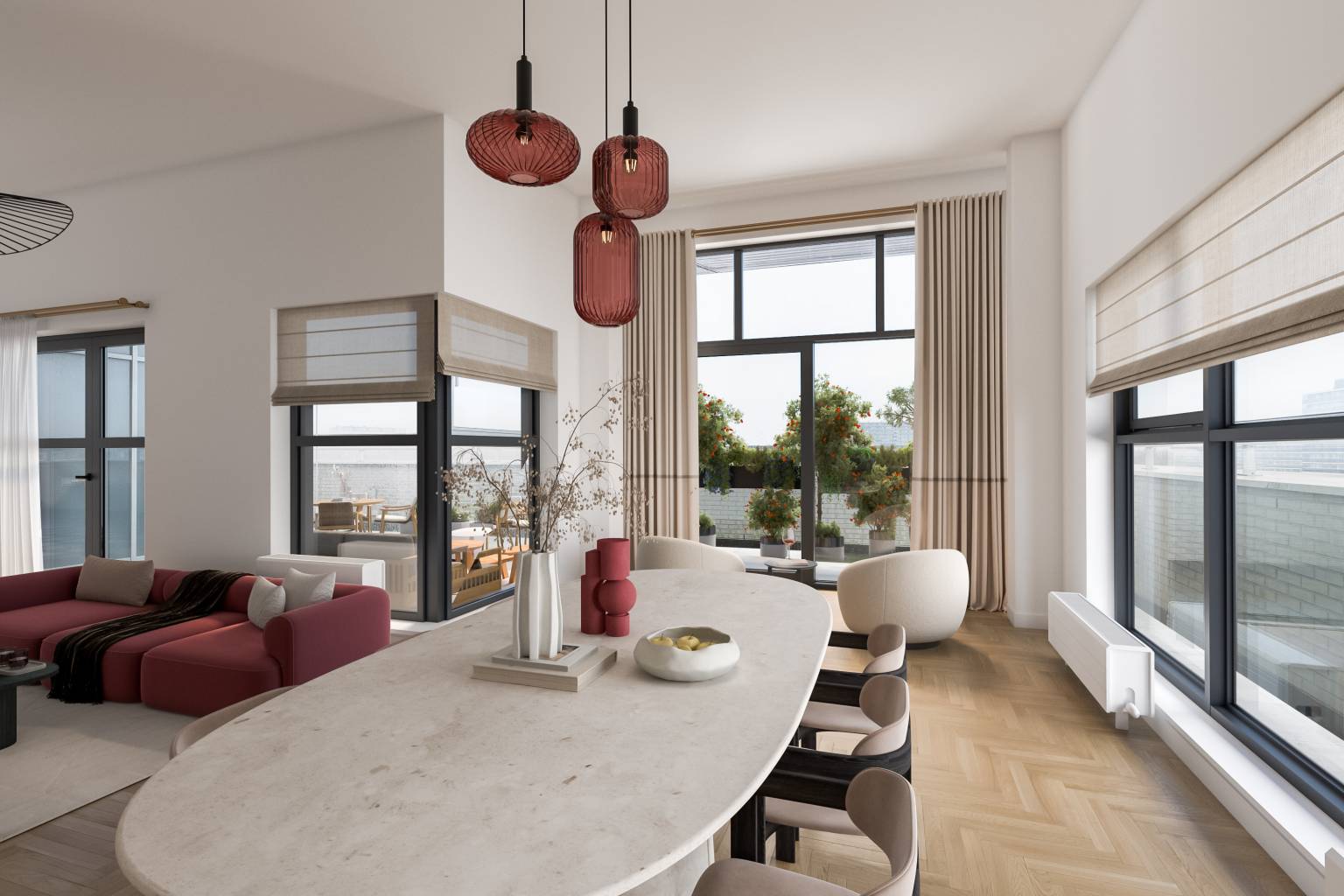 De woonkamer grenst aan het grote terras en heeft door de grote ramen veel lichtinval en een mooi uitzicht. Er is een aparte ruimte voor het zitgedeelte. Hier is een grote schuifpui die toegang geeft tot het terras. Daarnaast is er een aparte ruimte voor de eethoek en ook hier is er een toegangsdeur naar het terras.