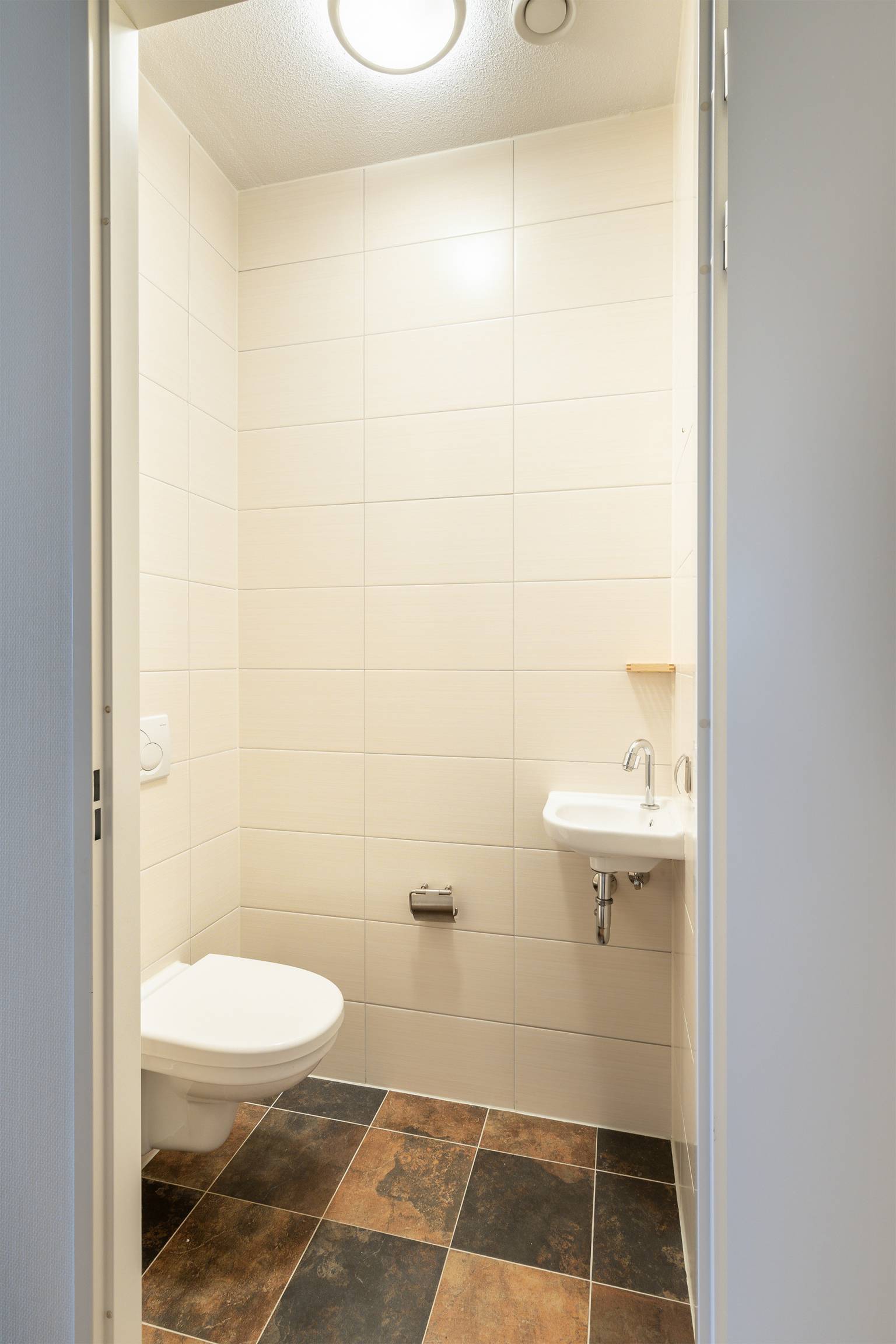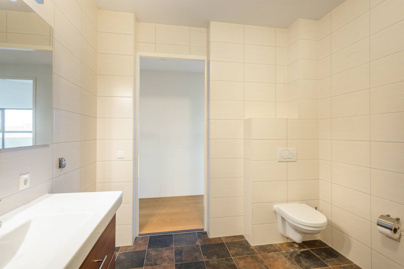 De riante badkamer is geheel betegeld in dezelfde stijl als het toilet en uitgerust met een inloopdouche, een wastafelmeubel met een daarboven een spiegel met verlichting, een zwevend toilet en een design radiator. Daarnaast is het gespoten plafond voorzien van een afzuigpunt.