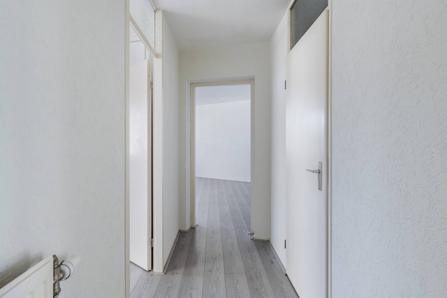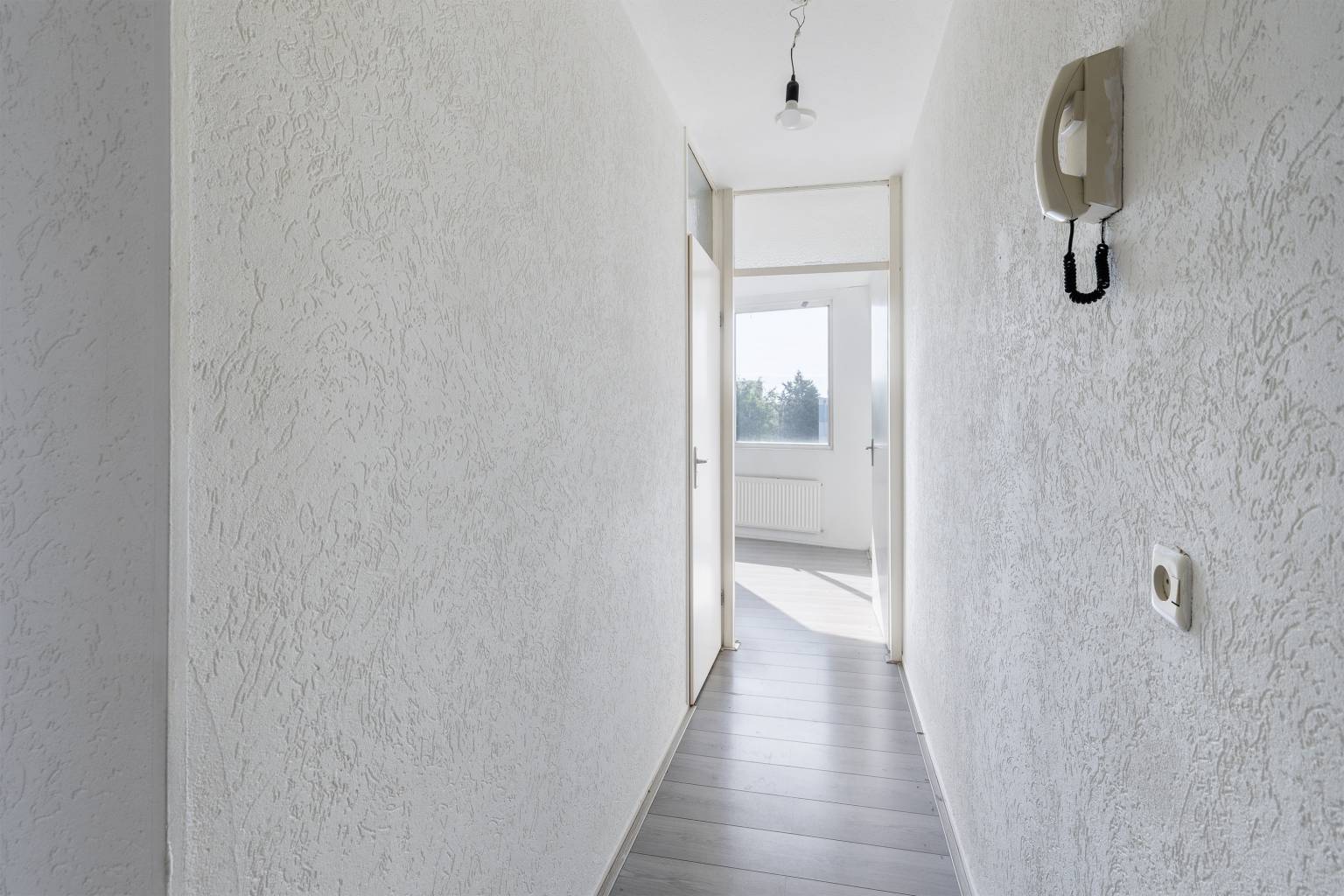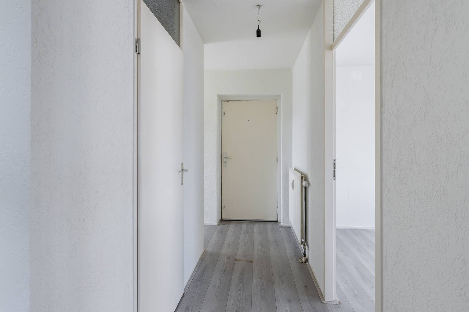 Binnenkomst in de entreehal die is voorzien van een laminaatvloer die terug te vinden is in het gehele appartement, met uitzondering van het toilet en de badkamer. De wanden zijn afgewerkt met granol en vanuit hier is er toegang tot twee slaapkamers, de woonkamer, de badkamer en het gedeeltelijk betegelde toilet met een fonteintje. De badkamer is eveneens gedeeltelijk betegeld en voorzien van een douche, een wastafel en de aansluiting voor de wasmachine.