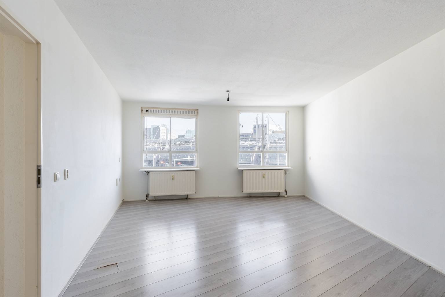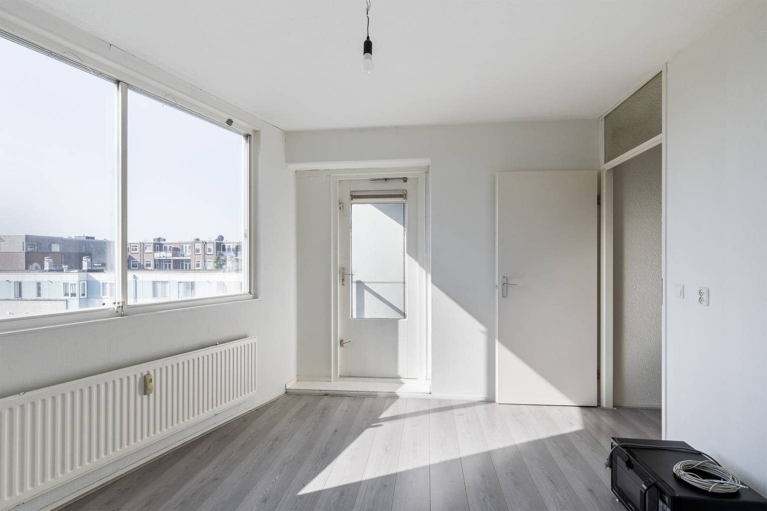 Wonen op een unieke plek in het hart van Schiedam? Dit speels ingedeelde “waaier” appartement ligt op de derde woonlaag in het ronde gedeelte van een markant appartementencomplex. Vanuit je woonkamer kijk je levendig uit over de stad, terwijl je aan de achterzijde juist geniet van rust en groen. De ligging is top: op loopafstand van station Schiedam Centrum, dus trein, metro, tram of bus zijn altijd binnen handbereik. Ook het sfeervolle historische centrum van Schiedam met leuke winkels, gezellige restaurants en barretjes ligt om de hoek. En met de auto zit je binnen een paar minuten op de snelweg – handig toch? Ook het Beatrixpark ligt vlakbij voor een ontspannen wandeling en de uitvalswegen richting Rotterdam en Den Haag zijn snel te bereiken. Binnenin het appartement vind je een praktische indeling met twee slaapkamers, een lichte woonkamer en een open keuken. De laminaatvloer loopt mooi door in bijna alle ruimtes en zorgt voor een verzorgde uitstraling. Zowel het toilet als de badkamer zijn deels betegeld, waarbij de badkamer is uitgerust met een douche, een wastafel en een wasmachineaansluiting. De slaapkamer aan de achterzijde heeft toegang tot een fijn, overdekt balkon met uitzicht op een kindvriendelijk binnenplein vol groen en een speeltuin. De aluminium kozijnen met schuiframen en dubbel glas zorgen voor comfort en geluiddemping. Met een actieve VvE en een energielabel E is dit een heerlijke plek voor wie centraal én comfortabel wil wonen. De oplevering is in overleg, maar kan snel!