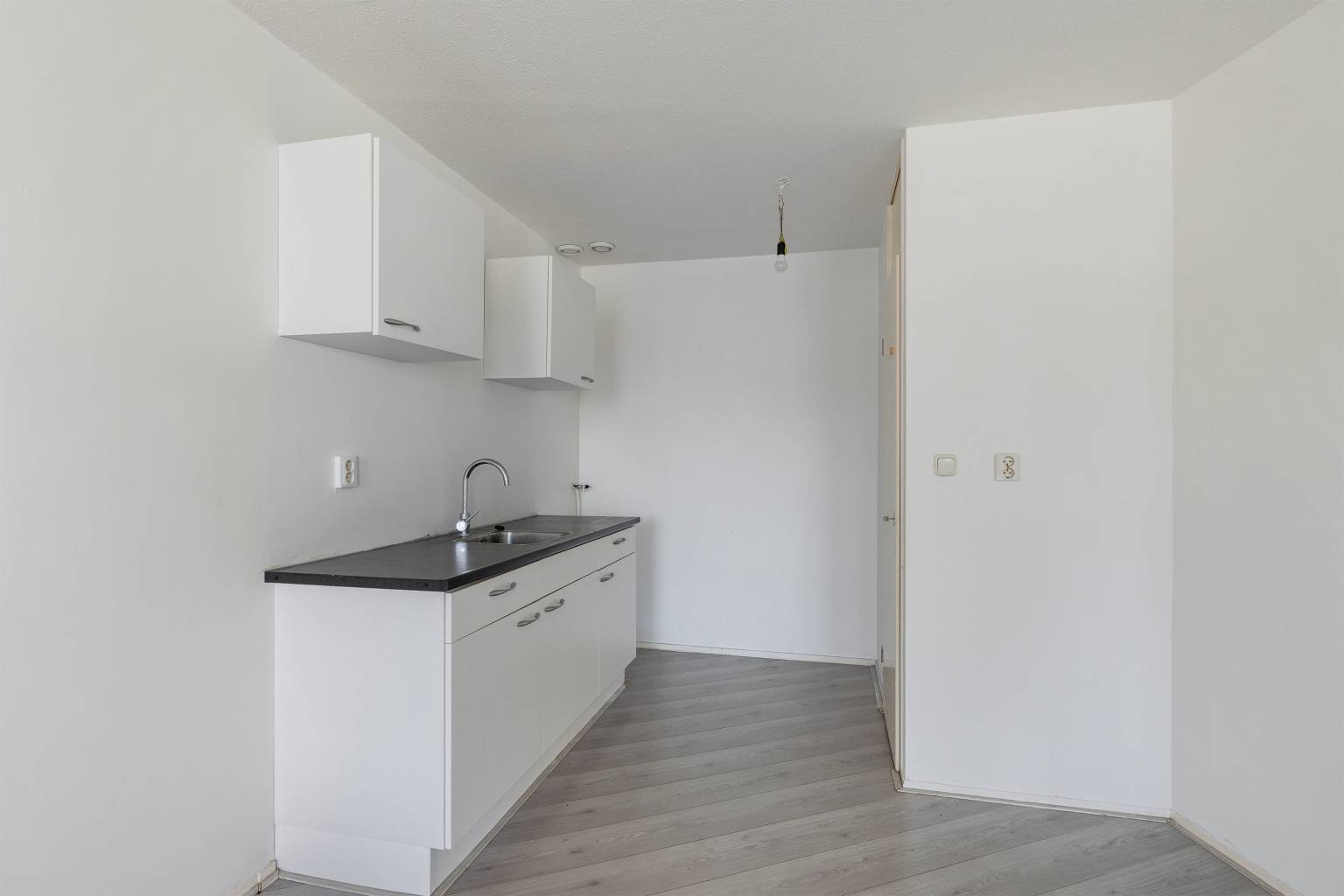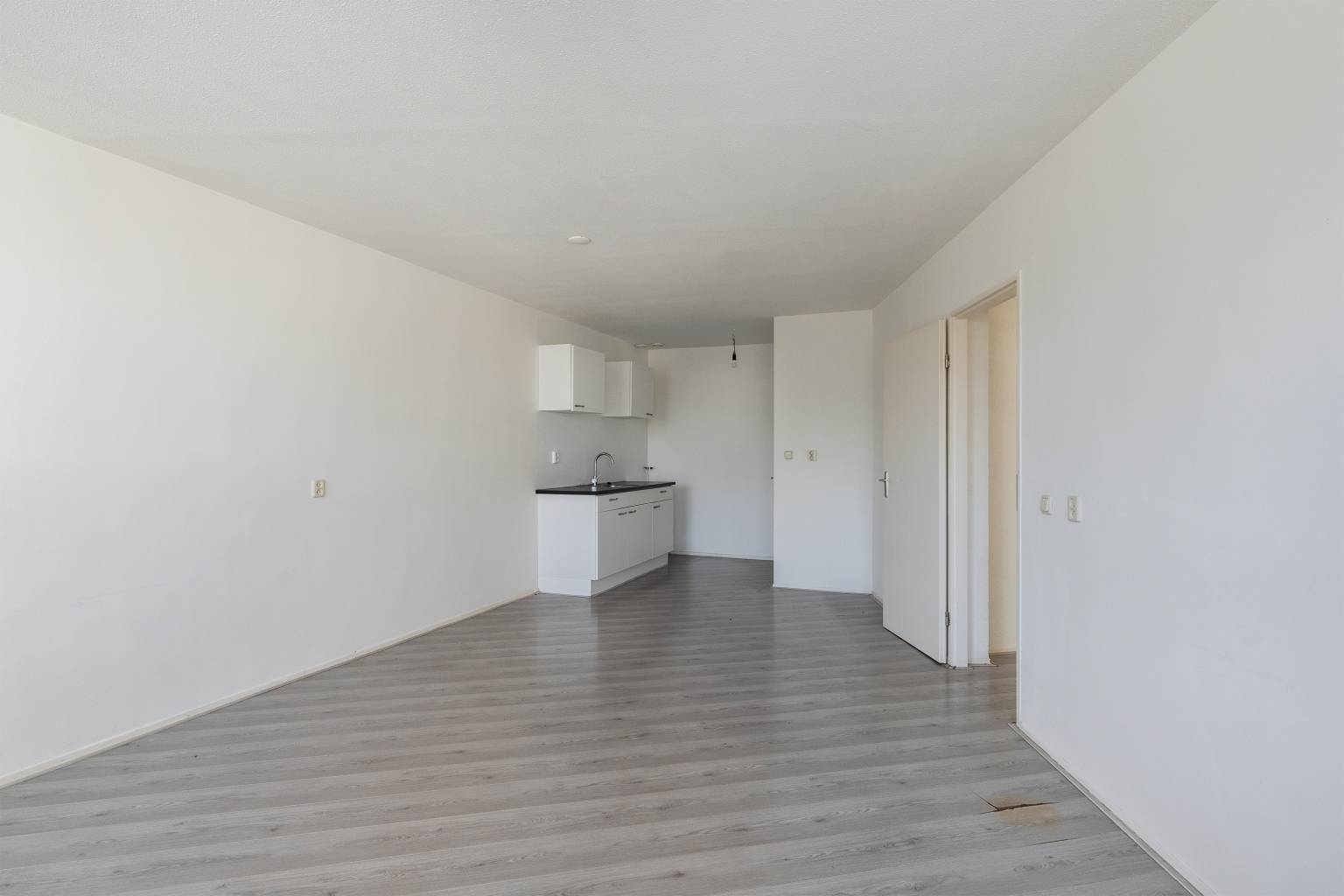 De woonkamer is gelegen aan de voorzijde en heeft een levendig uitzicht over de omgeving. De wanden zijn afgewerkt met granol en er is een direct verbinding met de open keuken. Deze is voorzien van een recht keukenblok met twee bovenkasten en een gasaansluiting. Tevens is hier een vaste kast aanwezig voor extra opbergmogelijkheden.