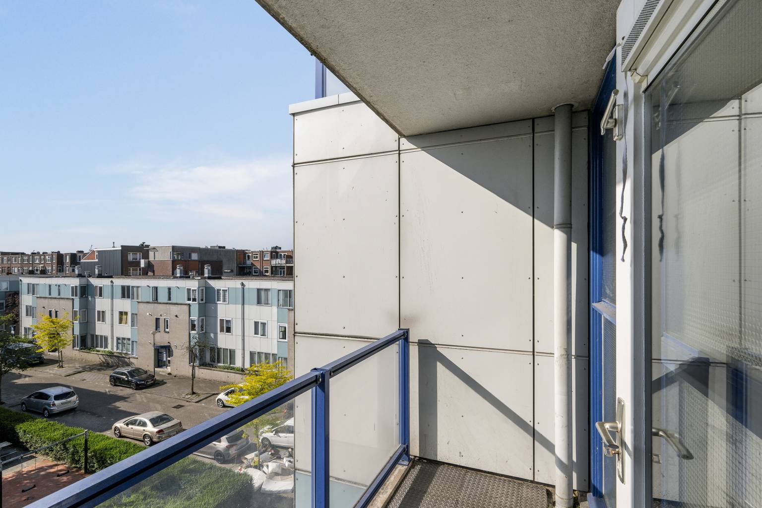 Het balkon is fijn overdekt en biedt hierdoor een beschut plekje om buiten te zitten. De glazen balustrade zorgt voor een ruimtelijk gevoel en er is uitzicht over het binnenplein met veel groen en een speeltuin.