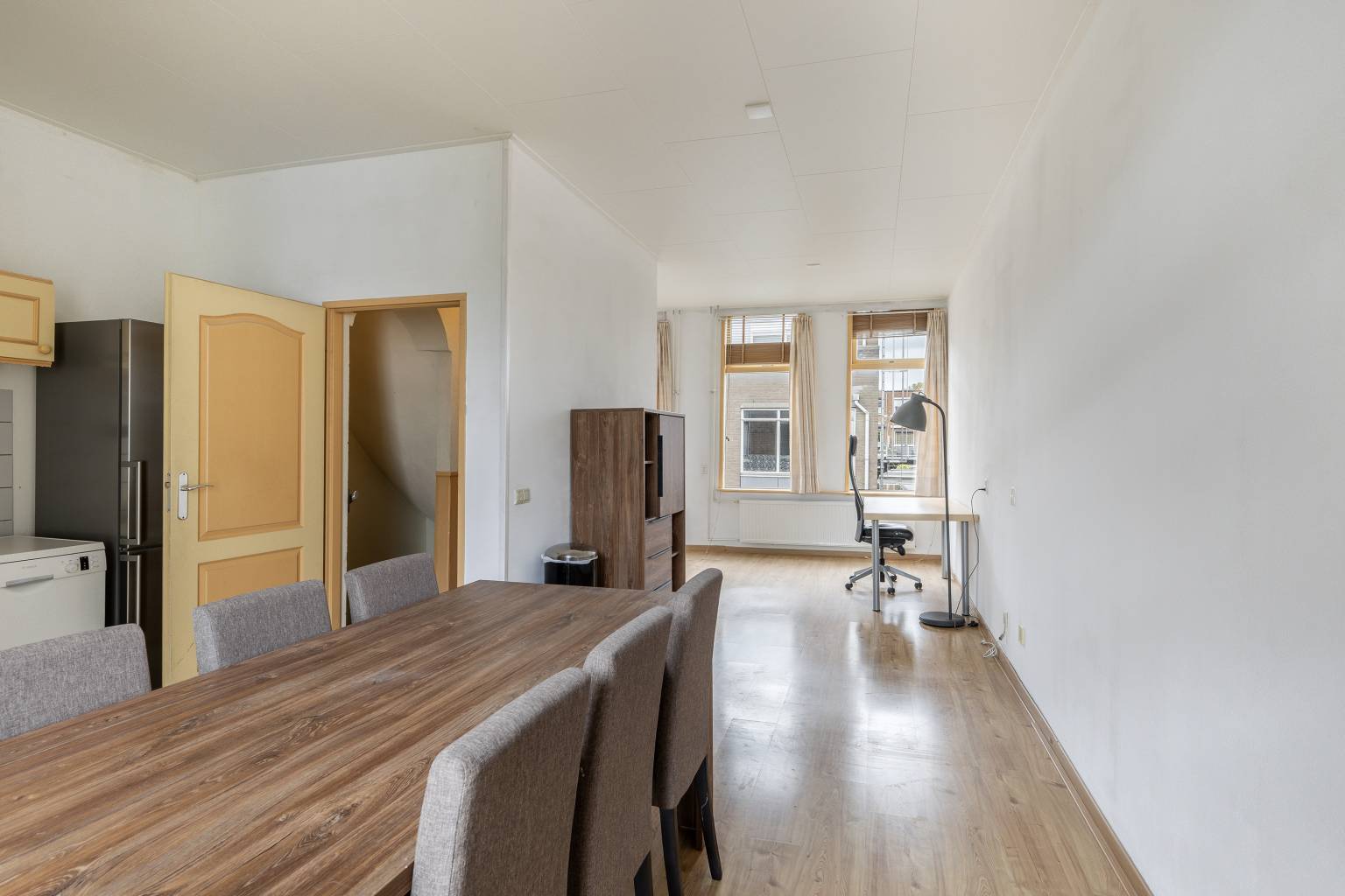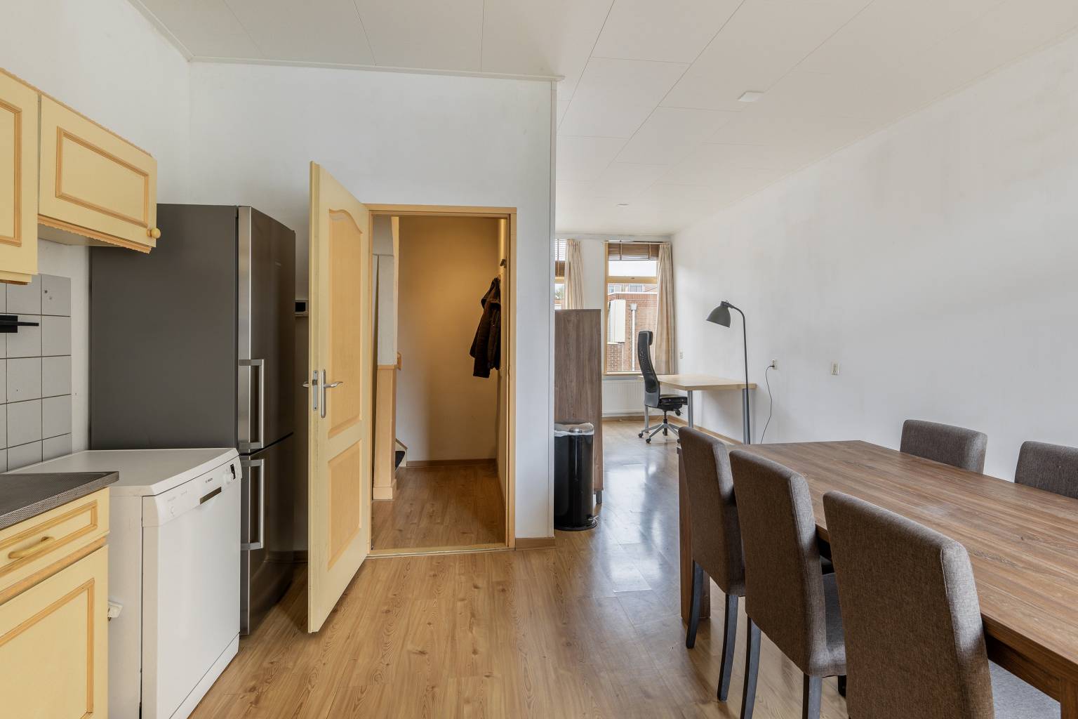 De keuken is gesitueerd aan de achterzijde en beschikt over een recht keukenblok met bovenkasten en een betegelde achterwand. De vloer is voorzien van laminaat en de wanden zijn afgewerkt met spachtelputz. De openslaande deuren geven toegang tot het balkon en er is voldoende ruimte voor een grote eettafel. Doorlopend naar de voorzijde bevindt zich de woonkamer. Deze heeft drie hoge ramen, die een fraai zicht geven over de straat.