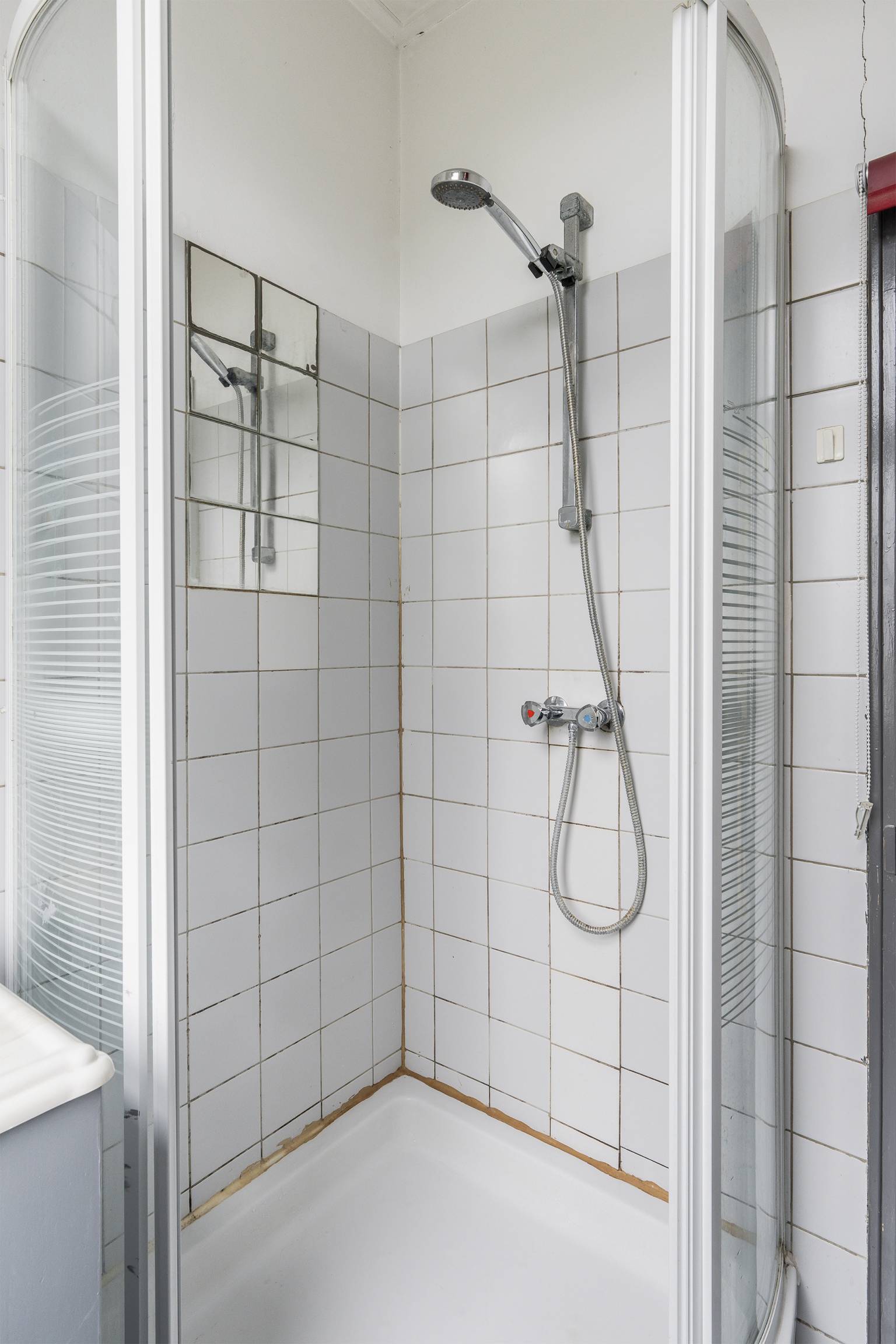 In het verlengde van de keuken is er een deur naar een klein halletje die is voorzien van een PVC vloer. Vanuit dit halletje is er een deur naar het balkon en het gedeeltelijk betegelde toilet. Daarnaast is er een open toegang tot de badkamer. Deze is grotendeels betegeld en uitgerust met een douchecabine, een wastafelmeubel en een wasmachine aansluiting. In deze ruimte bevindt zich ook de opstelling van de Cv-ketel, er hangt een radiator en er is een te openen raam voor natuurlijke ventilatie.