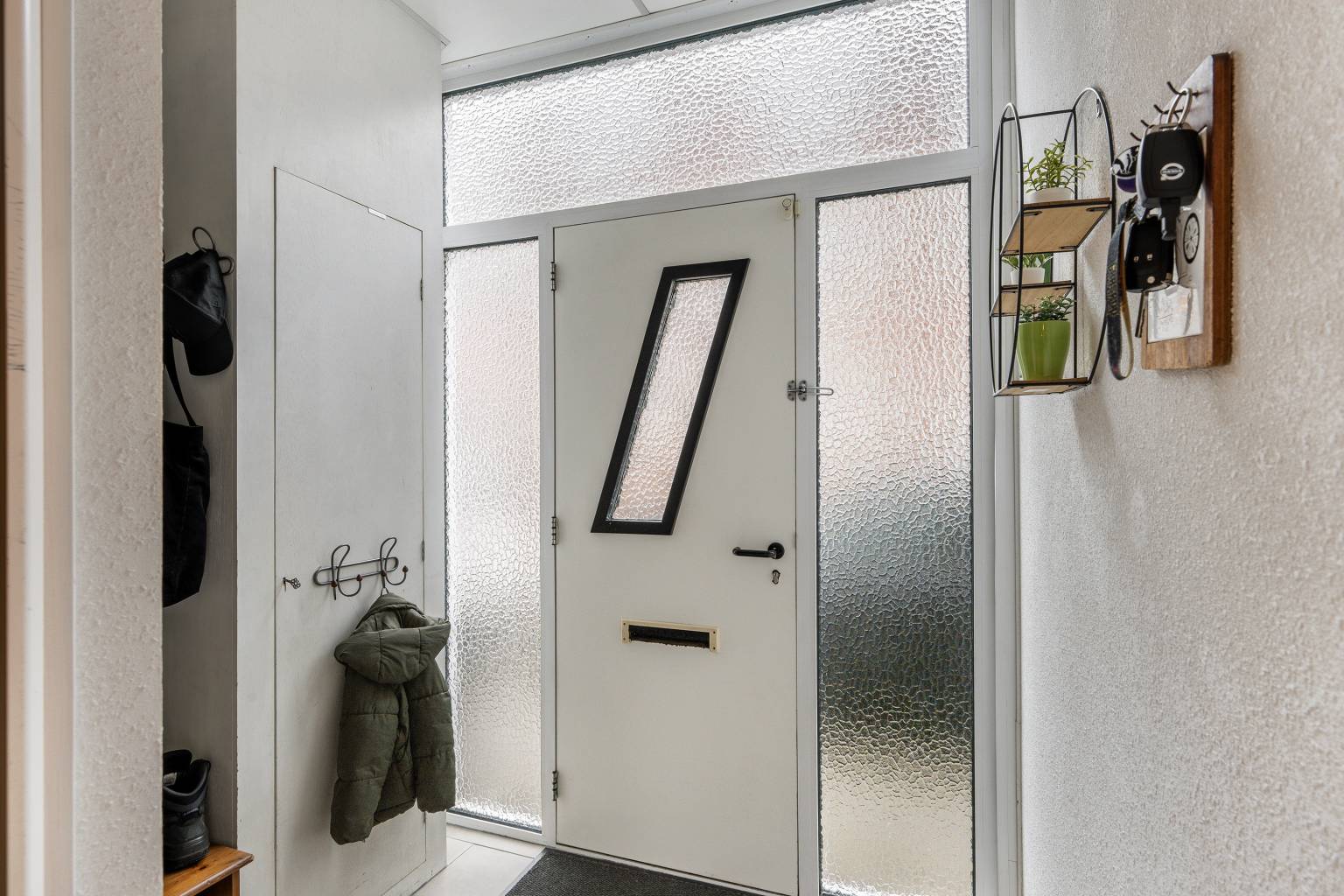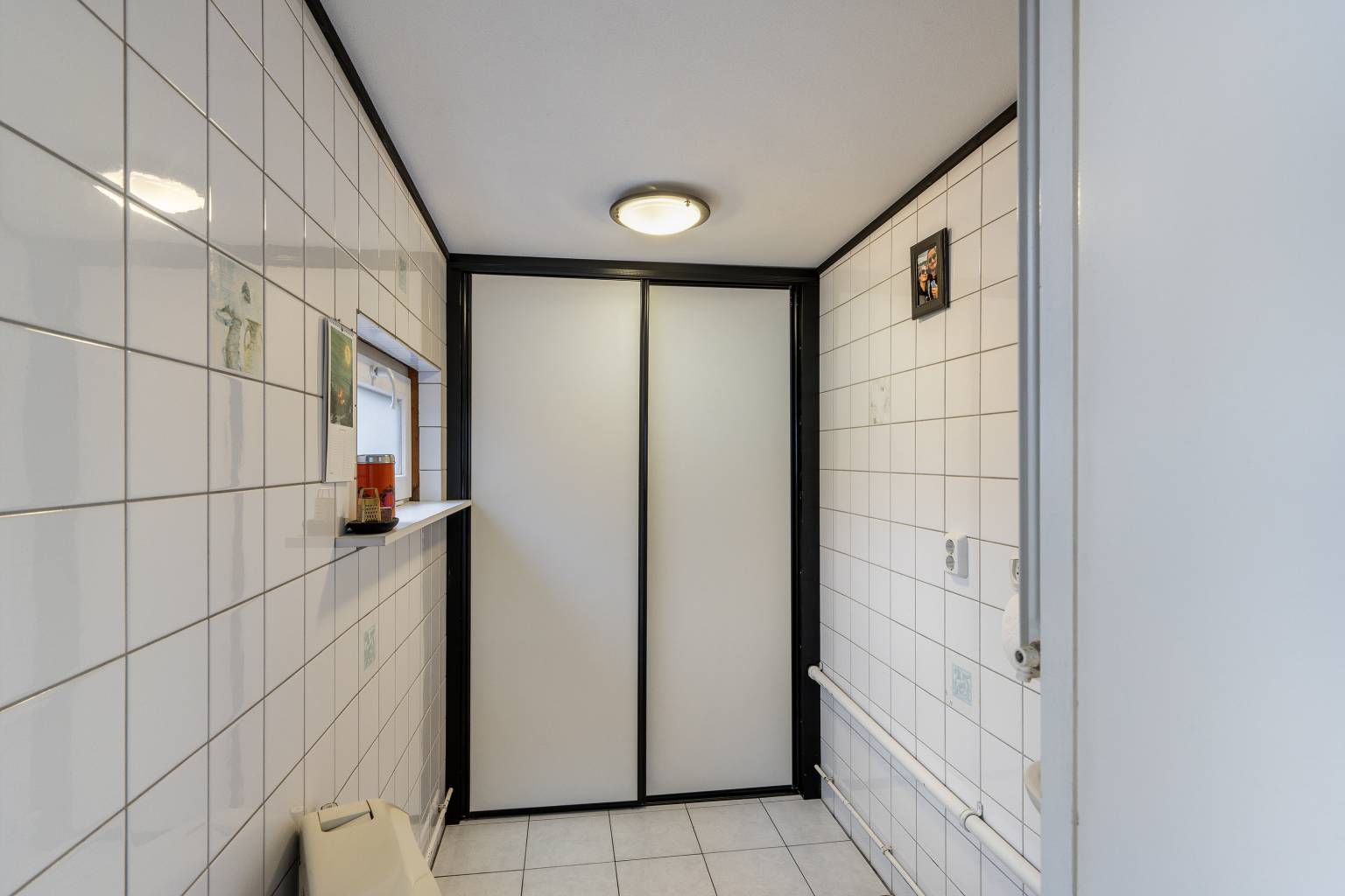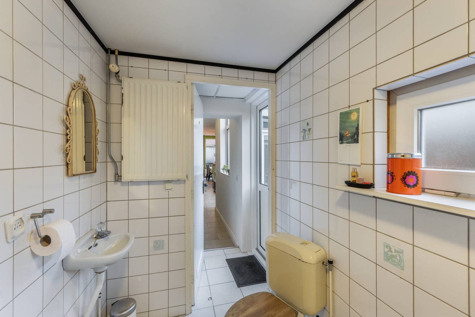 Het halletje heeft een aparte deur naar de achtertuin en geeft verder toegang tot een vaste kast en het ruime toilet. Er ligt een tegelvloer, die is doorgetrokken naar het toilet.