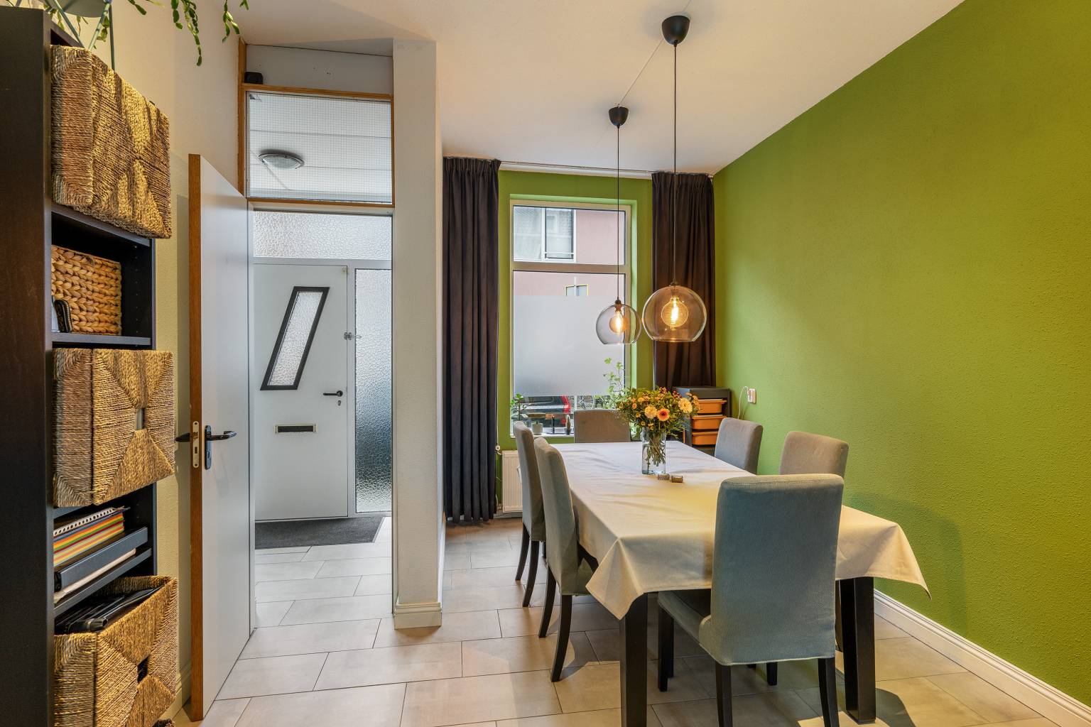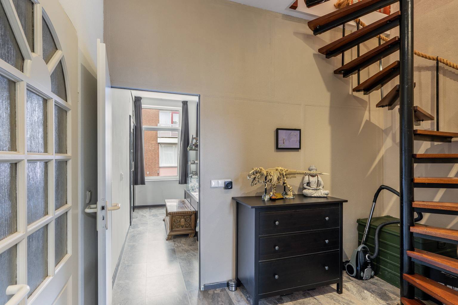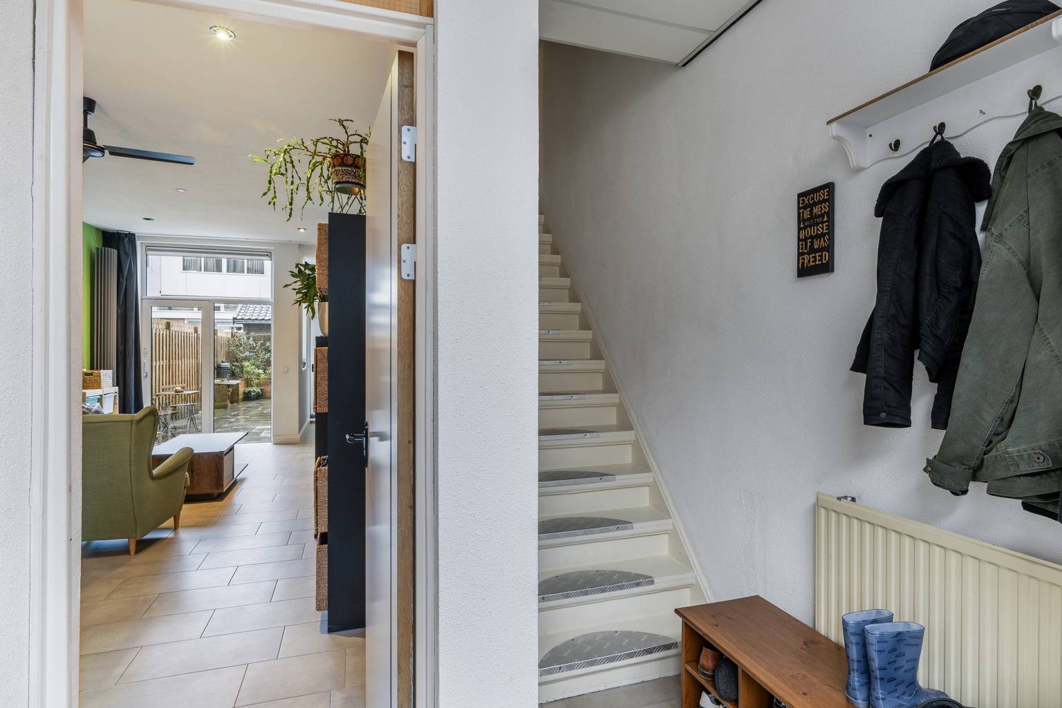 De voordeur is direct bereikbaar vanaf de straat en geeft toegang tot de entreehal. Deze is voorzien van de meterkast en de trap naar de verdieping. De wanden zijn afgewerkt met granol en er ligt een tegelvloer, die is doorgetrokken naar de woonkamer.