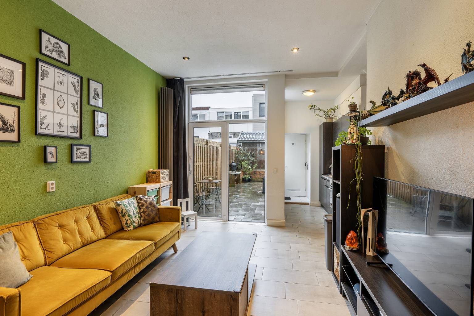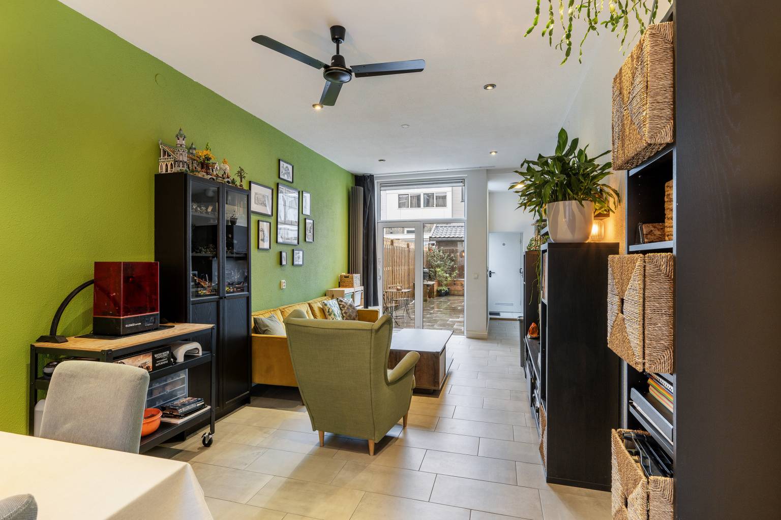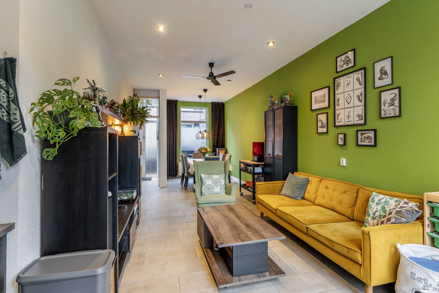 De woonkamer voorzien van vloerverwarming loopt geheel van de voorzijde naar de achterzijde en heeft hierdoor ruimte voor een aparte eet- en zithoek. Onder de trap bevindt zich een vaste kast en vanuit de woonkamer is er een open verbinding met de keuken. Tevens is er een schuifpui die toegang geeft tot de achtertuin. Ook hier zijn de wanden afgewerkt met granol en is het plafond voorzien van inbouw spots.