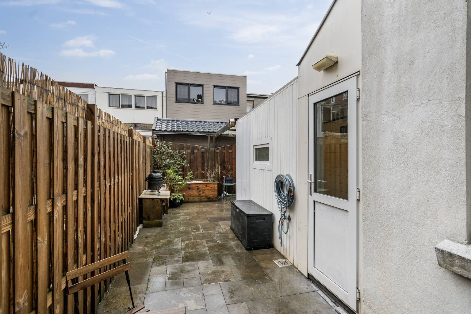 De achtertuin is een fijne buitenruimte die geheel is omheind door houten schuttingen. Het is nagenoeg onderhoudsvrij doordat het geheel betegeld is en de houten border is voorzien van beplanting. Achterin de tuin is een gedeelte overdekt en aan de gevel hangt een waterkraantje.
