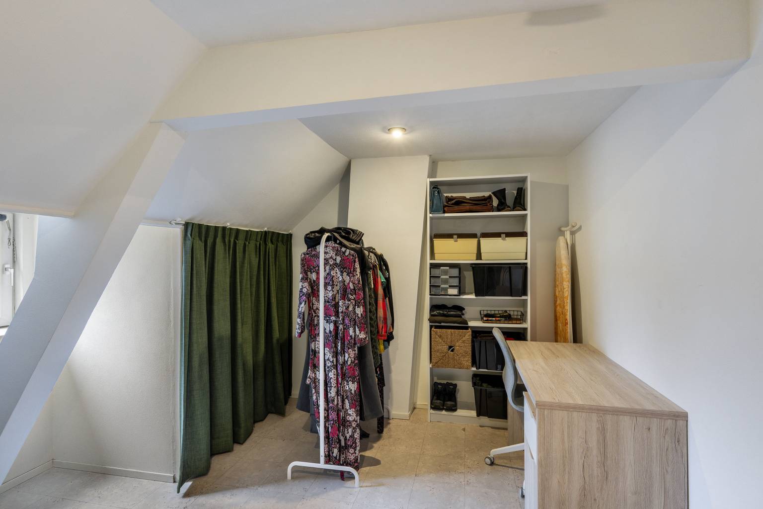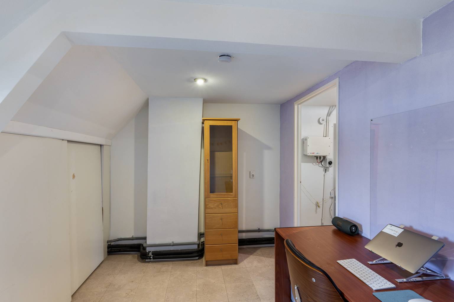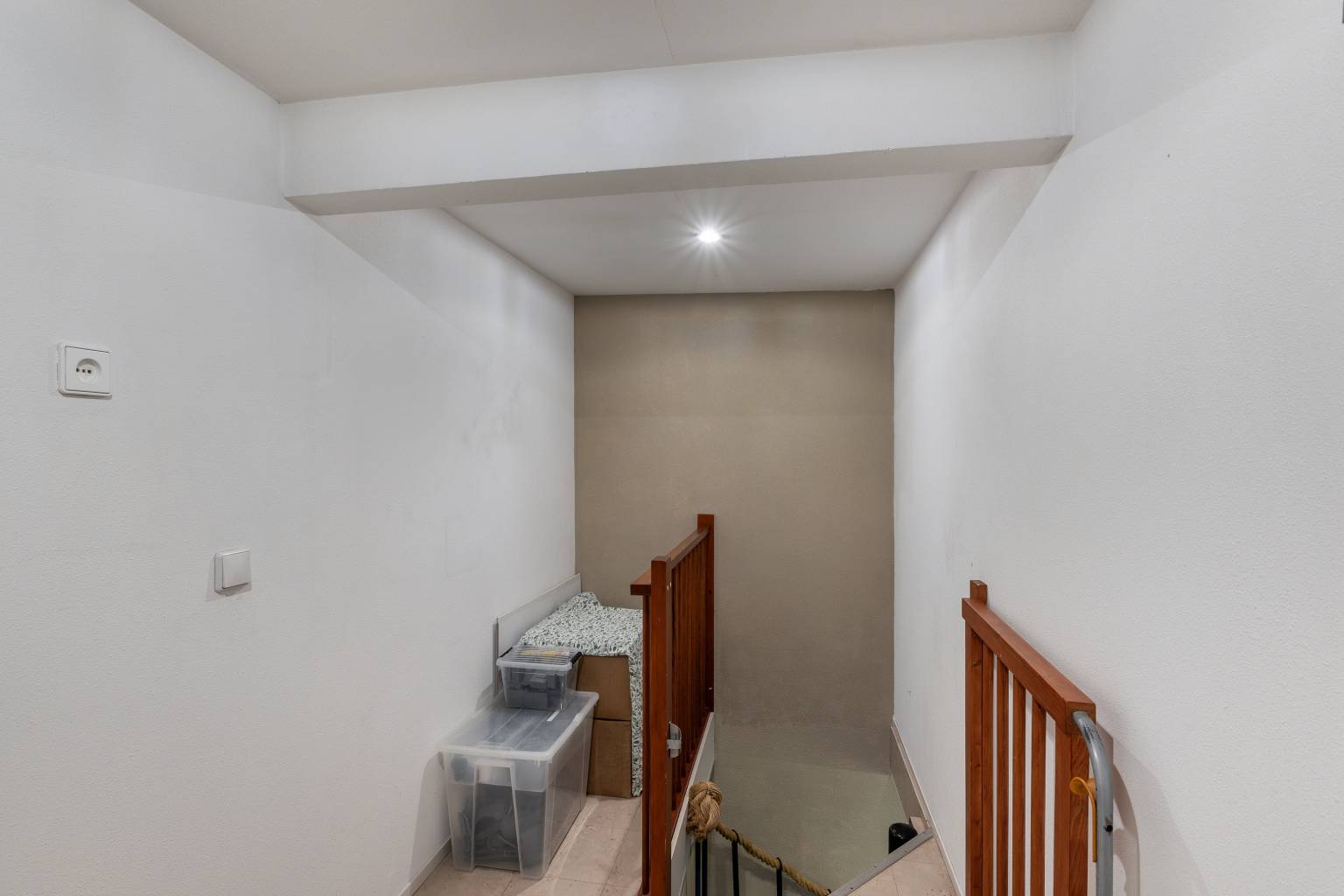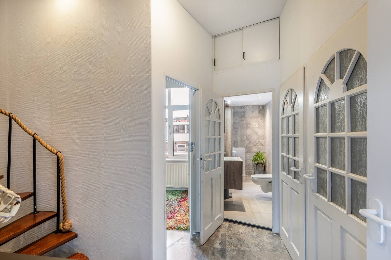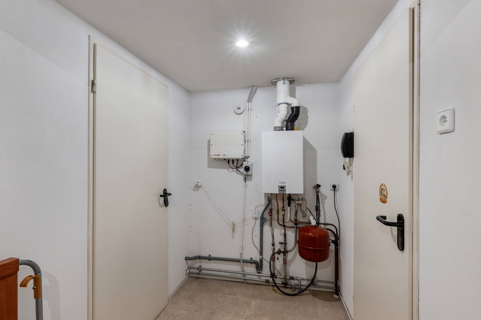 Bovenkomend op de overloop, waar de opstelling van de Cv-ketel zich bevindt. Vanaf hier is er toegang tot nog twee slaapkamers en is er voldoende ruimte voor het opbergen van spullen. De wanden zijn afgewerkt met structuurverf, de vloer is voorzien van vinyl en in het plafond zijn inbouw spots verwerkt.