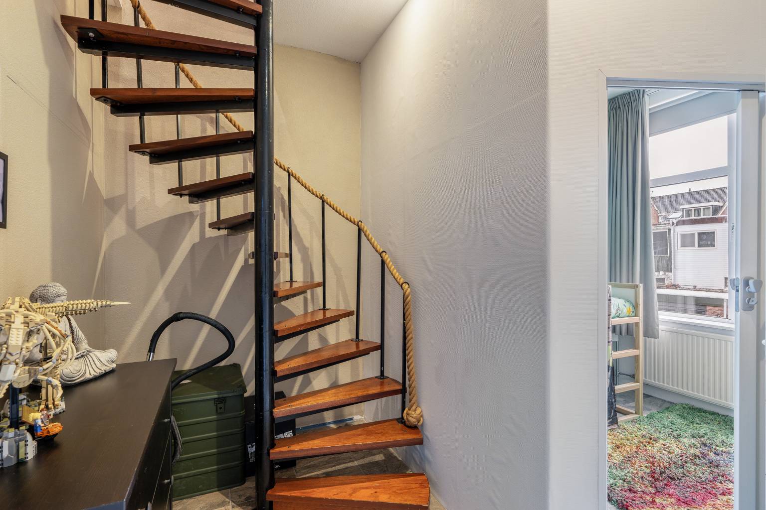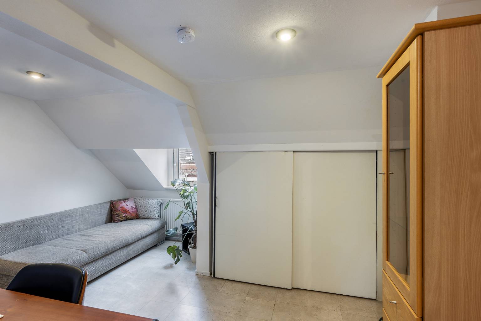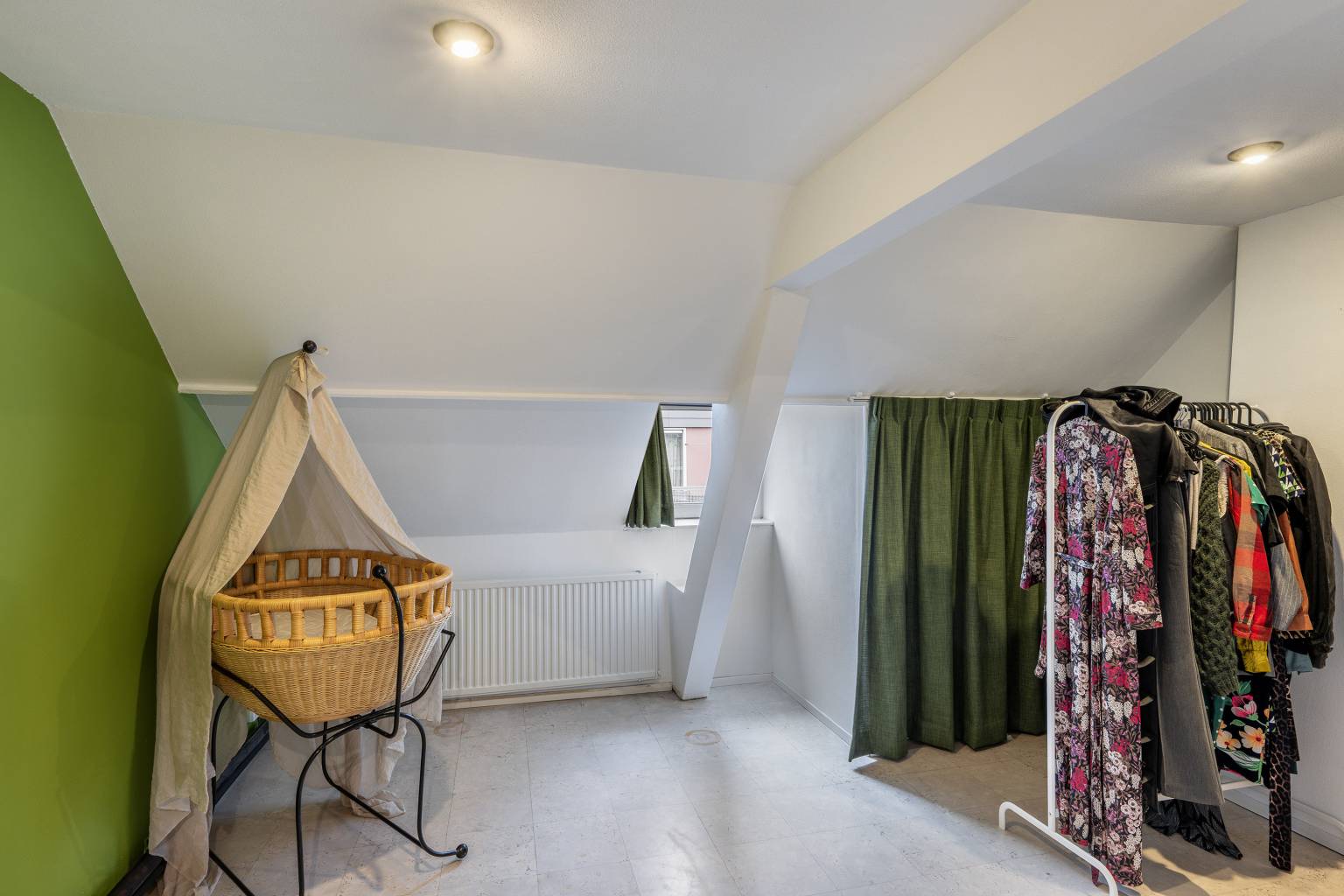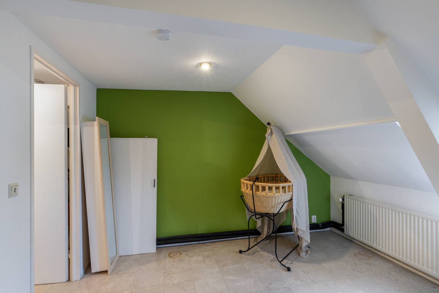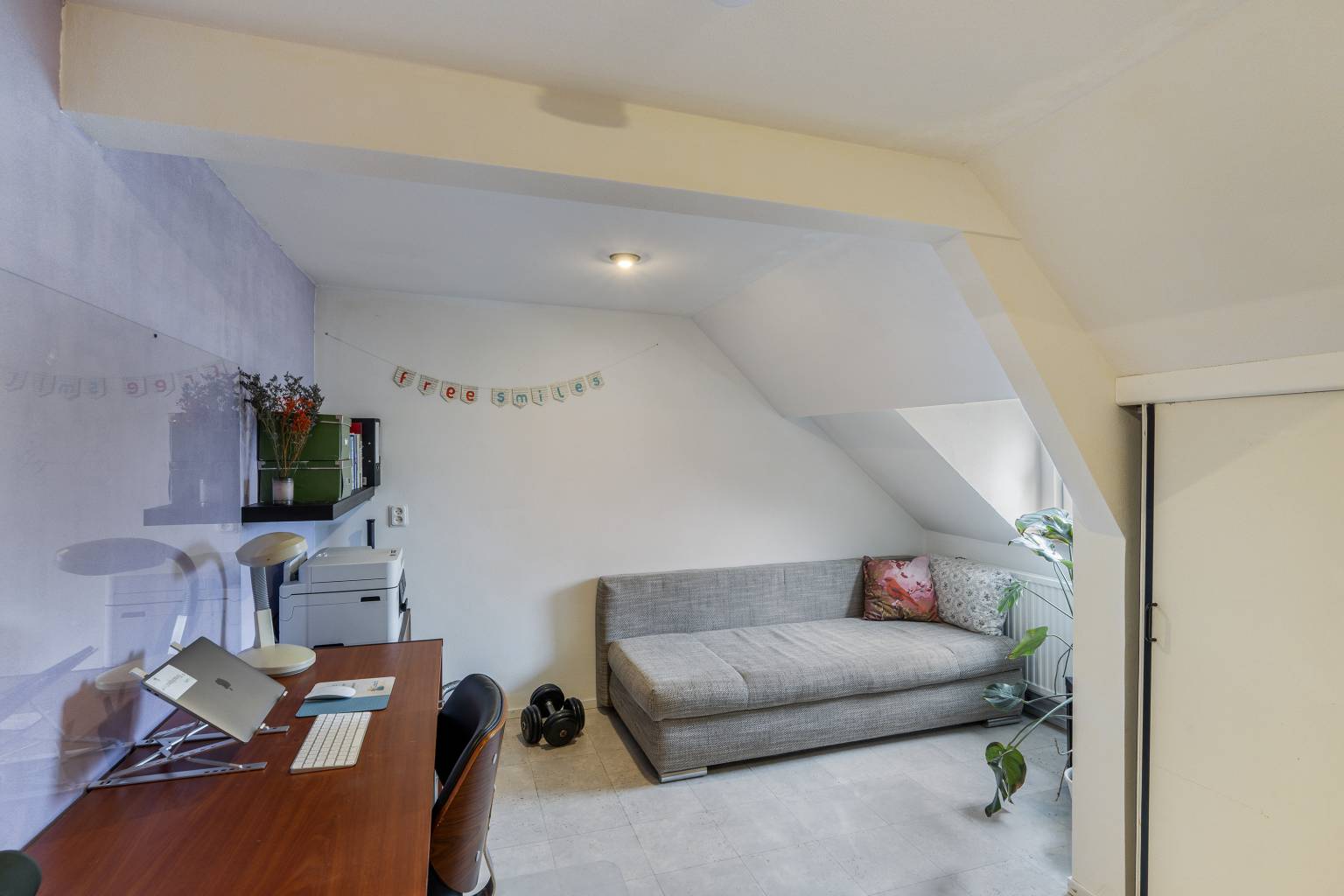 Bovenkomend op de overloop, waar de opstelling van de Cv-ketel zich bevindt. Vanaf hier is er toegang tot nog twee slaapkamers en is er voldoende ruimte voor het opbergen van spullen. De wanden zijn afgewerkt met structuurverf, de vloer is voorzien van vinyl en in het plafond zijn inbouw spots verwerkt.