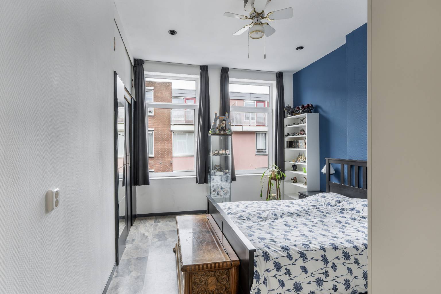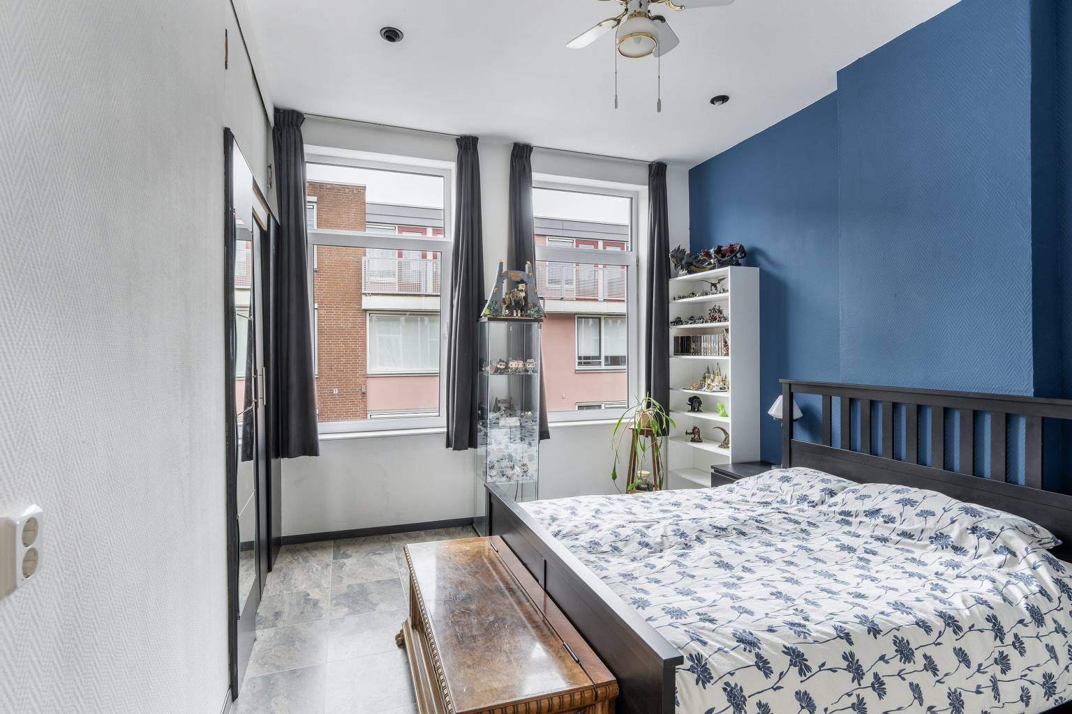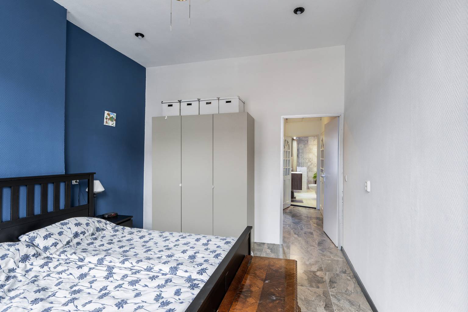 De hoofdslaapkamer is gelegen aan de voorzijde en heeft twee hoge ramen en een vaste, inbouwkast met schuifdeuren. De wanden zijn afgewerkt met glasweefselbehang en in het plafond zijn inbouw spots verwerkt. De tweede slaapkamer is gelegen aan de achterzijde, waarbij de vouwdeur zorgt voor ruimtebesparing. De wanden zijn hier deels behangen en deels voorzien van structuurverf.