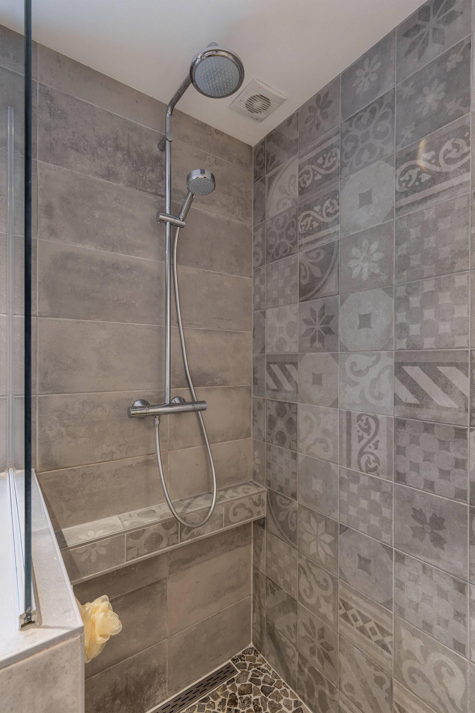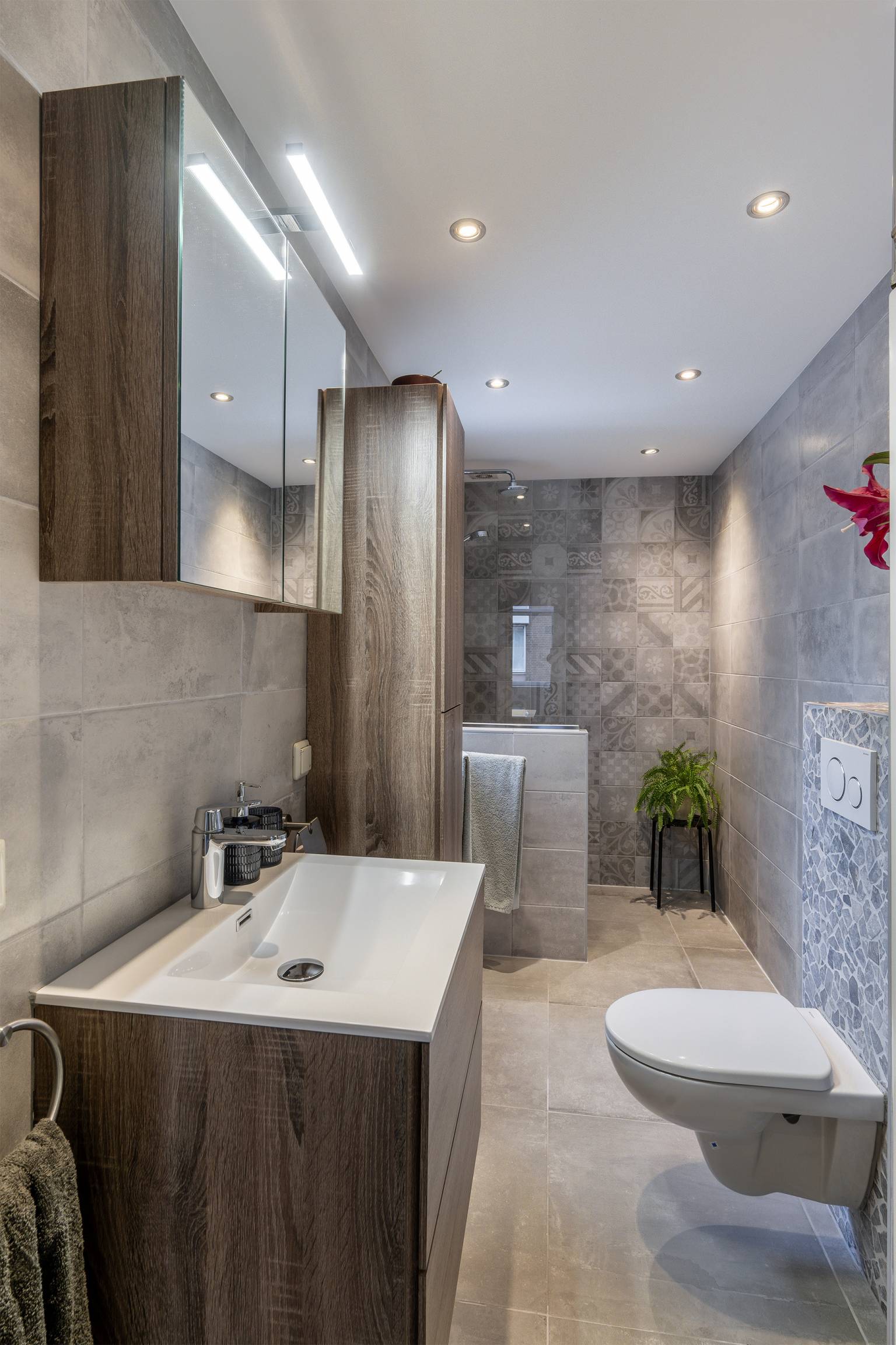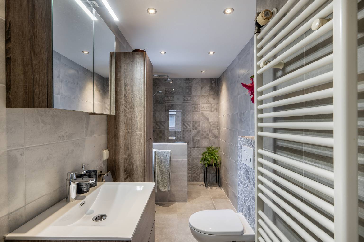 De strakke badkamer is volledig betegeld en uitgerust met een inloopdouche, een toilet, een handdoeken radiator en een wastafelmeubel met een hoge kast en een spiegelkast met verlichting. Tevens is er een te openen raam aanwezig voor natuurlijke ventilatie en hangt er een handdoeken ophang rek.
