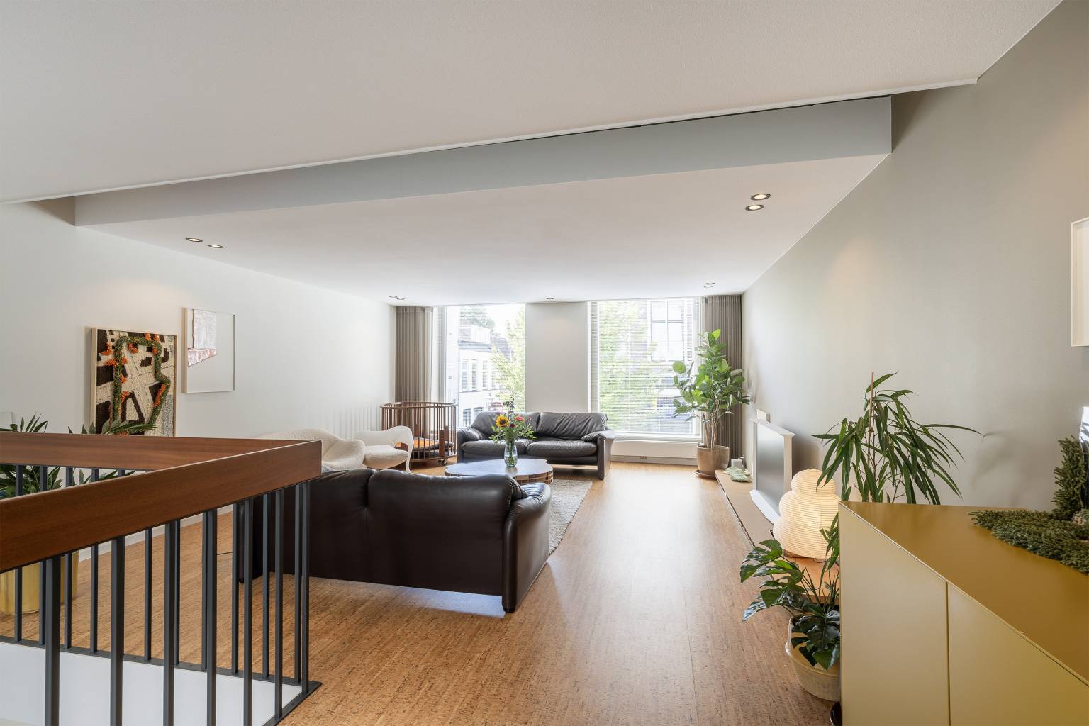 Na de trapopgang is de woonverdieping bereikbaar. Dit is een fijne zitruimte die is gesitueerd aan de voorzijde van de woning. Ook hier zorgen de hoge ramen voor een wijds uitzicht en de vide maakt dat er een goede connectie is met de woonkeuken. De vloer is voorzien van kurk, de wanden zijn gestuct en het verlaagde plafond is voorzien van inbouw spots (dimbaar). In het verlengde van de woonkamer is er aan de achterzijde een hal. Deze is iets lager gelegen en biedt toegang tot de trap naar de 2e verdieping, het tweede toilet en de eerste slaapkamer. Ook in de hal is het plafond voorzien van inbouw spots en zorgt het aanwezige raam voor het nodige daglicht.