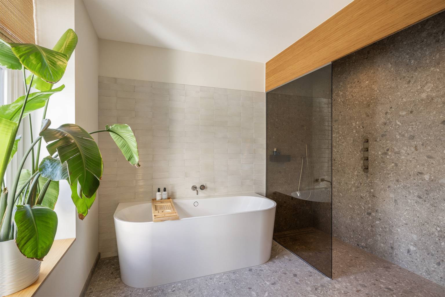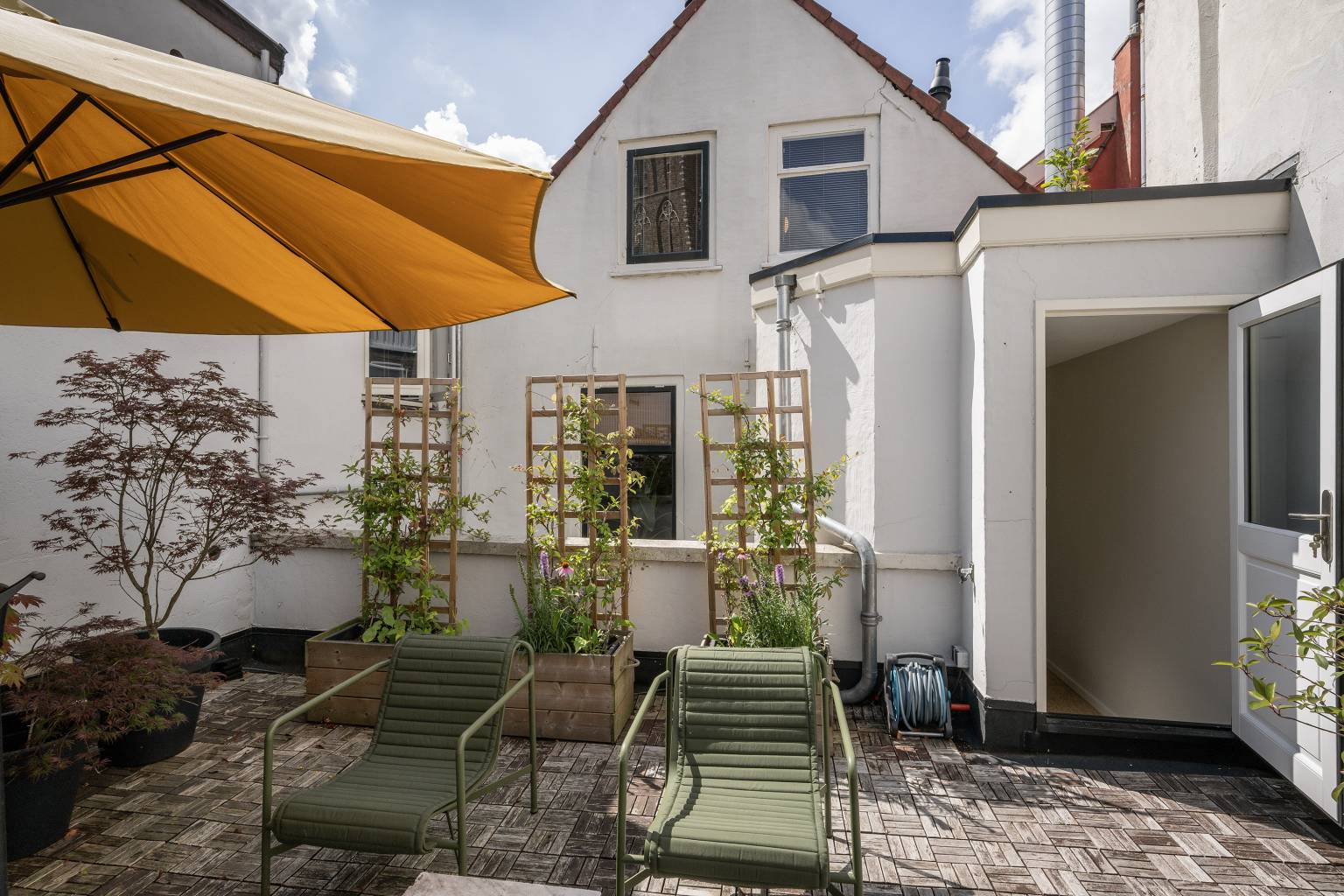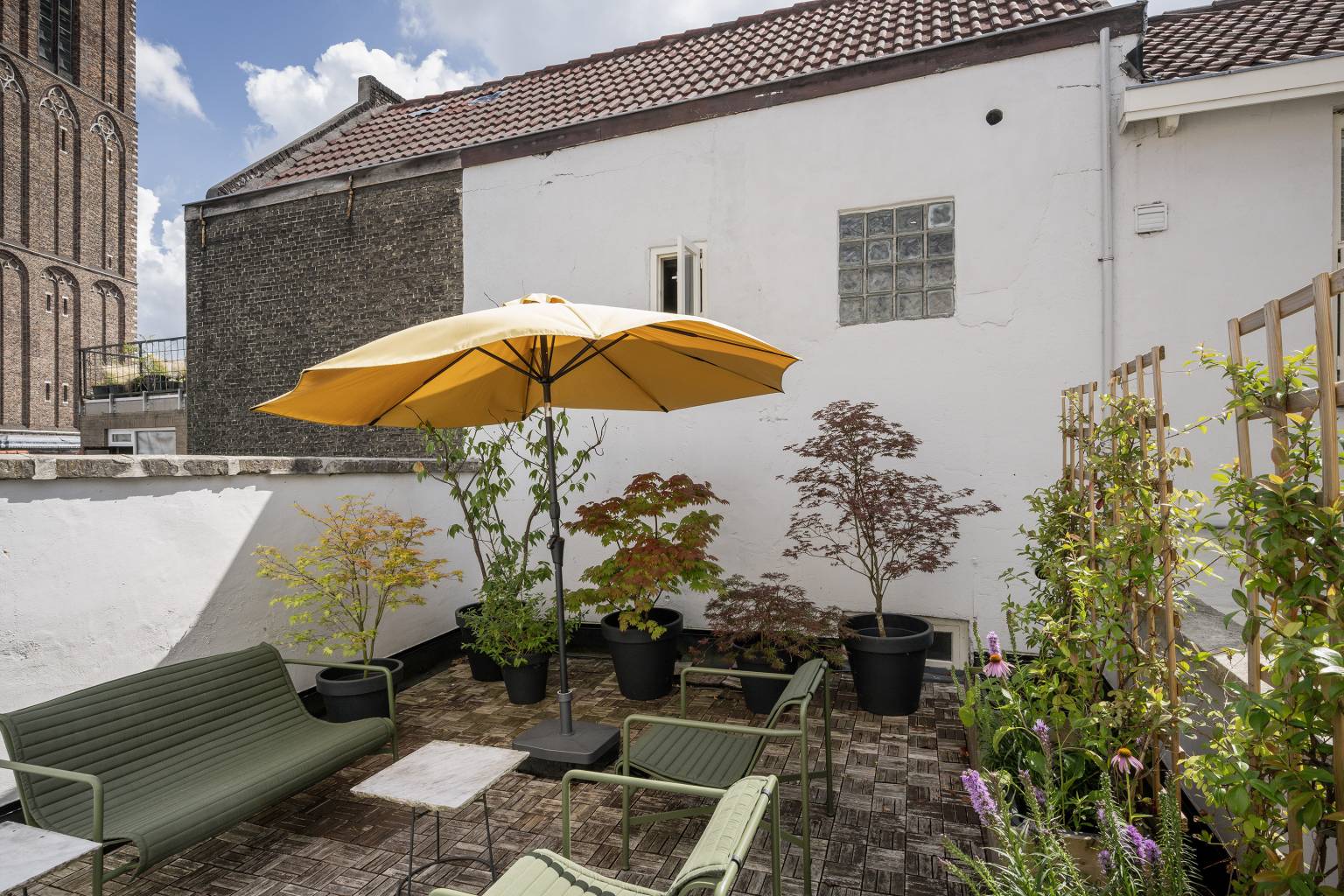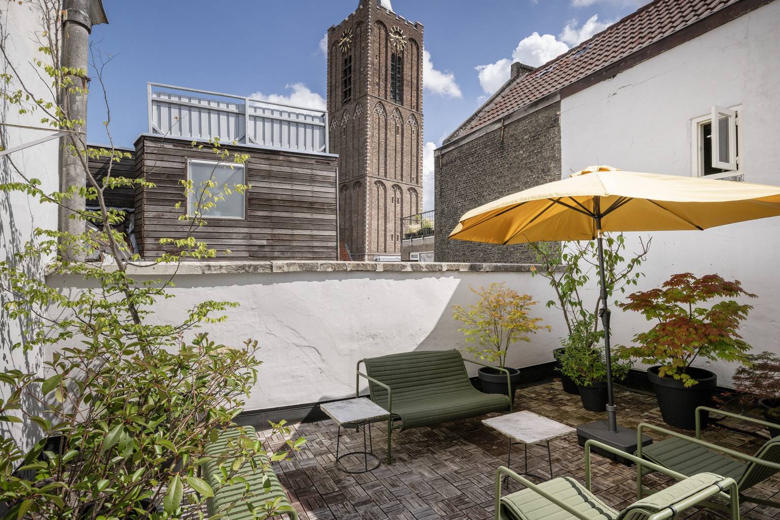 De luxe badkamer is uitgerust met een ruime inloopdouche, een ligbad, zwevend toilet en een handdoekradiator. De Ceppo di Gre tegels van de begane grond komen hier terug, net als fraai bamboehouten maatwerk. Een groot raam biedt zicht op het dakterras: een zonnige plek, voorzien van houten vlondertegels, stopcontacten en een waterkraantje. Hier is het heerlijk toeven met veel privacy en prachtig uitzicht op de Sint Janskerk.