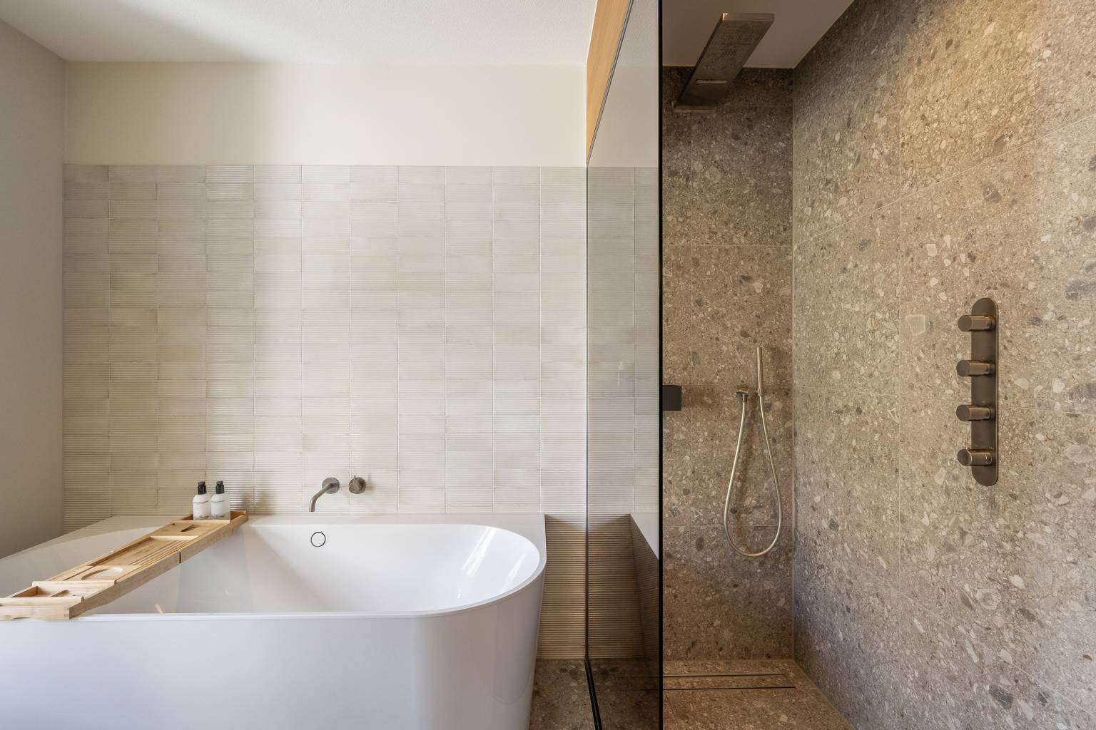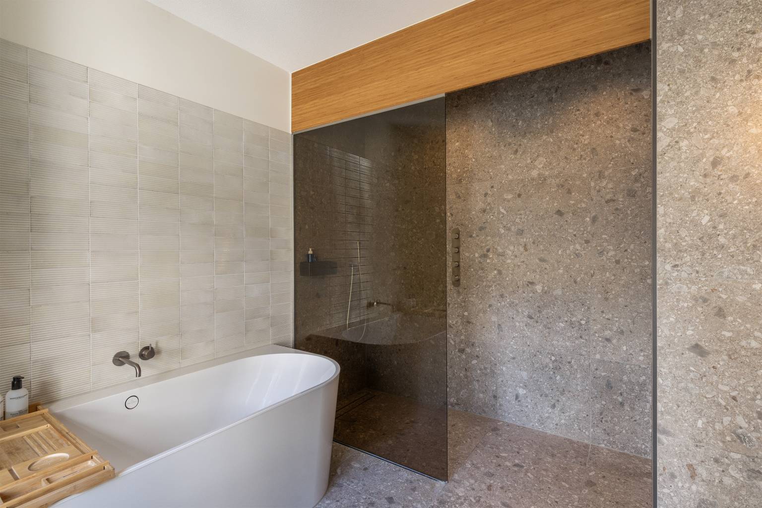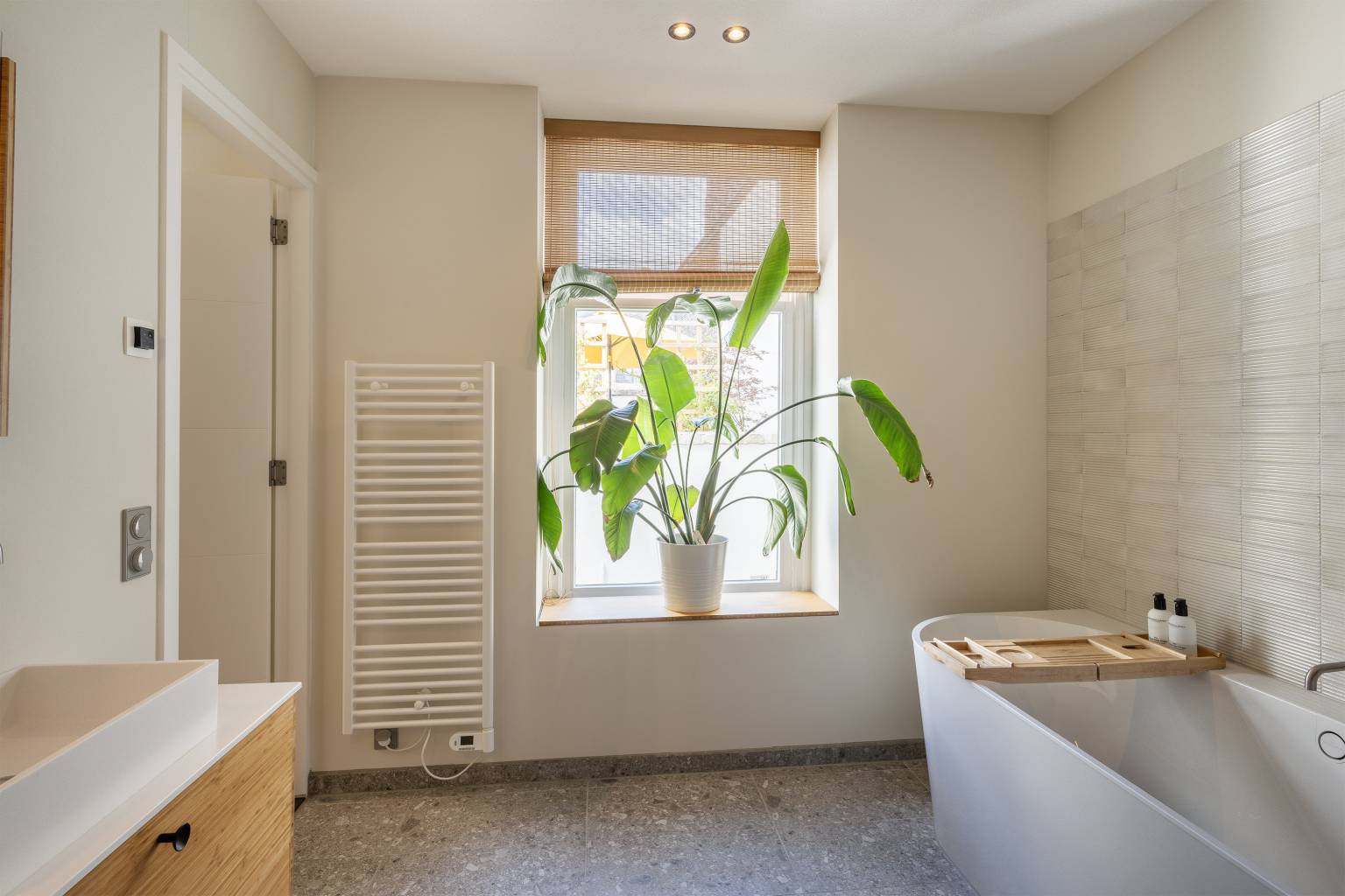 De luxe badkamer is uitgerust met een ruime inloopdouche, een ligbad, zwevend toilet en een handdoekradiator. De Ceppo di Gre tegels van de begane grond komen hier terug, net als fraai bamboehouten maatwerk. Een groot raam biedt zicht op het dakterras: een zonnige plek, voorzien van houten vlondertegels, stopcontacten en een waterkraantje. Hier is het heerlijk toeven met veel privacy en prachtig uitzicht op de Sint Janskerk.