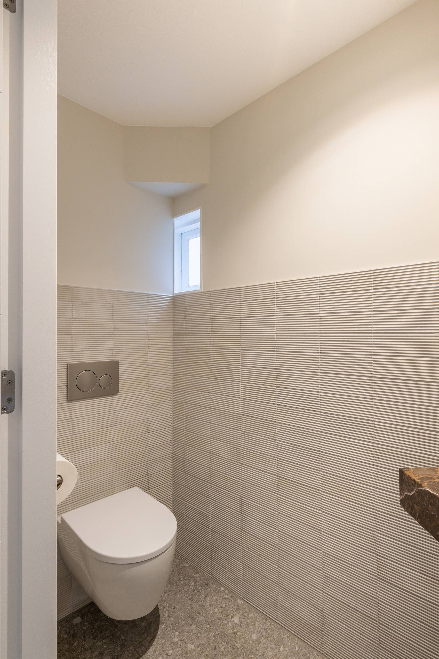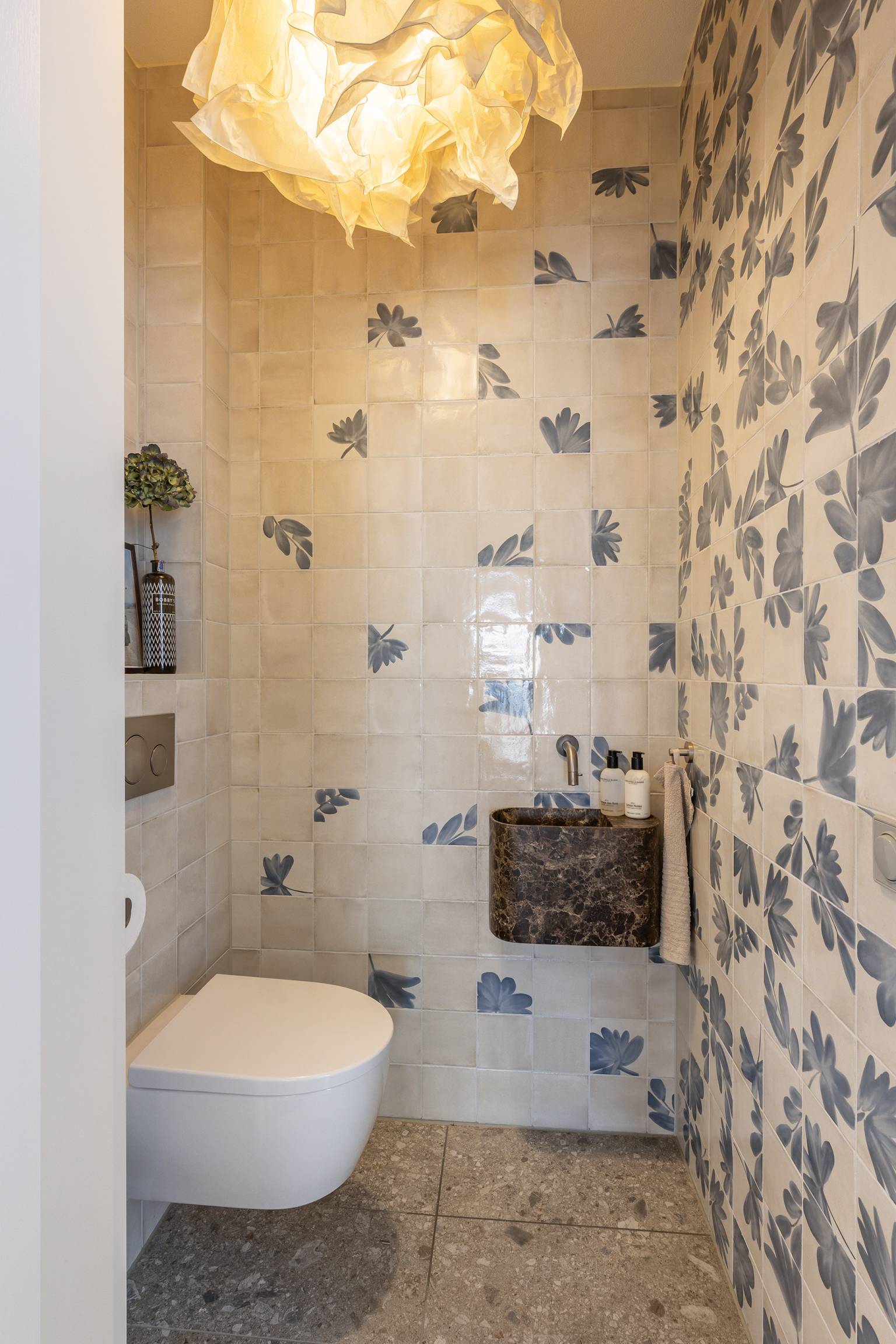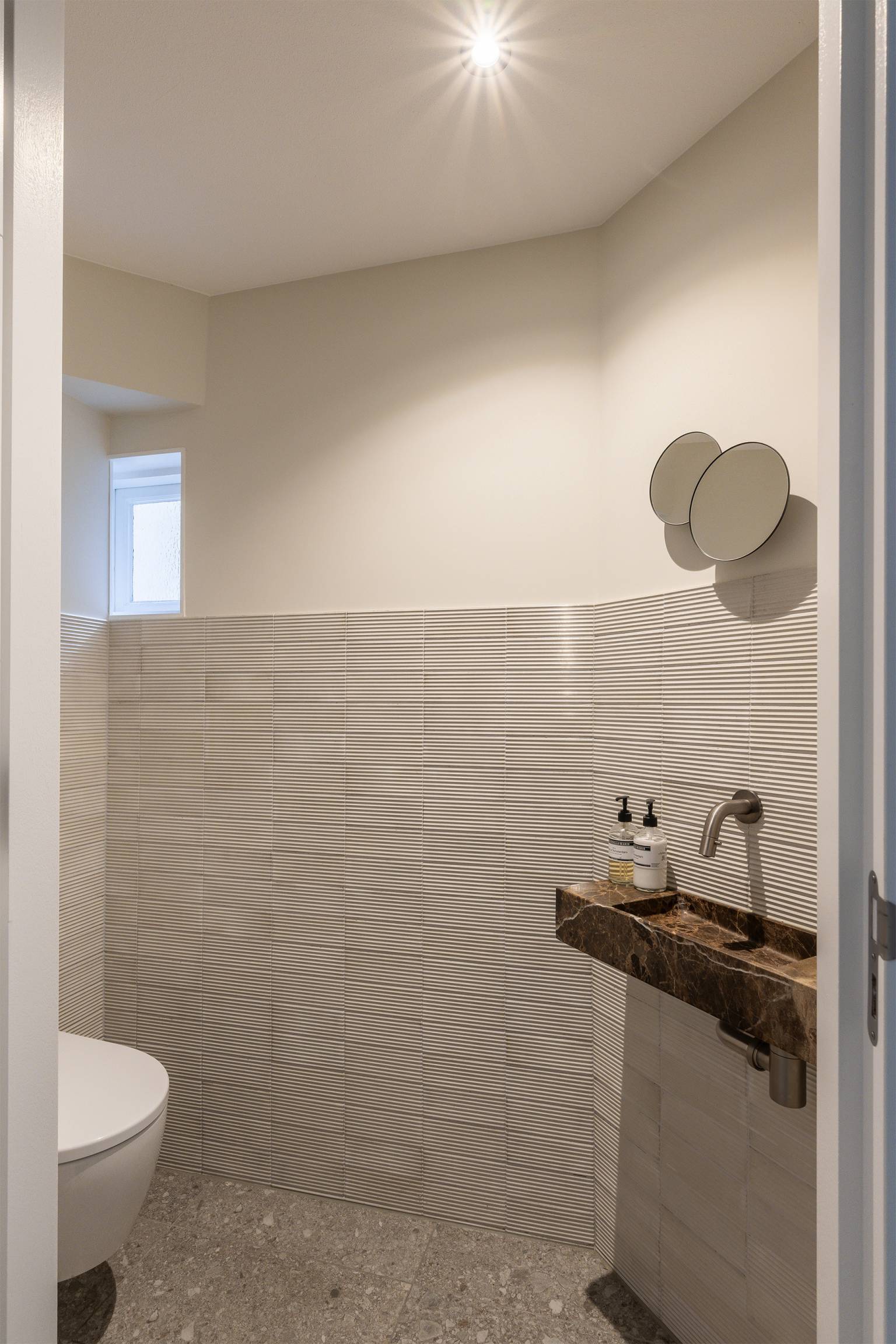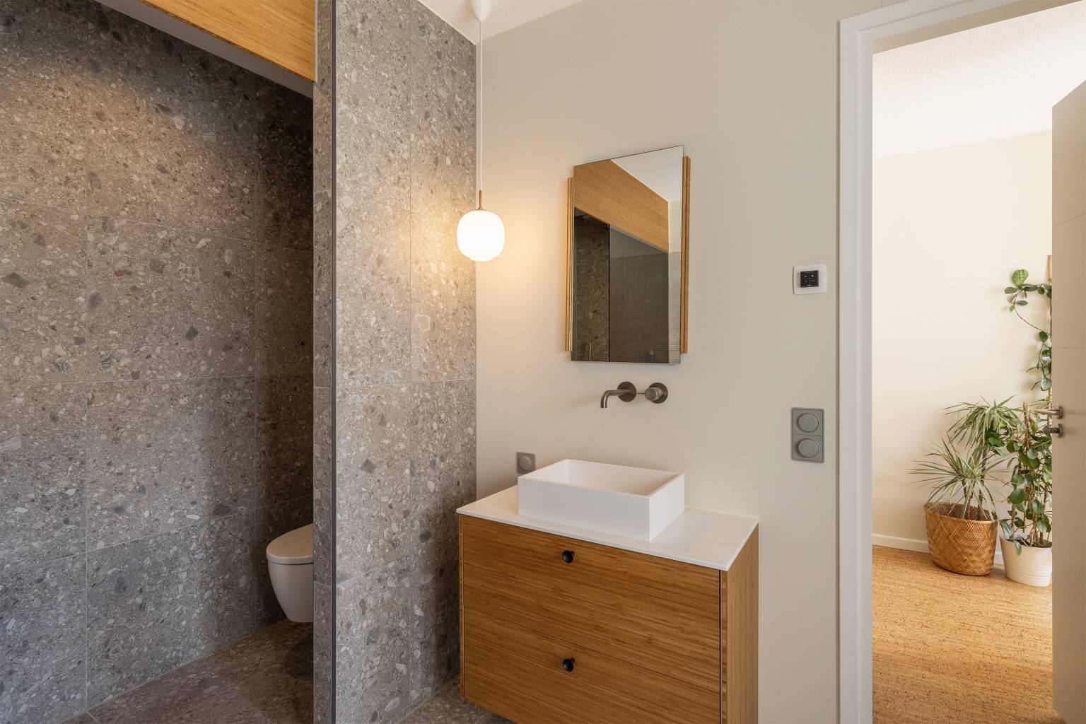 De luxe badkamer is uitgerust met een ruime inloopdouche, een ligbad, zwevend toilet en een handdoekradiator. De Ceppo di Gre tegels van de begane grond komen hier terug, net als fraai bamboehouten maatwerk. Een groot raam biedt zicht op het dakterras: een zonnige plek, voorzien van houten vlondertegels, stopcontacten en een waterkraantje. Hier is het heerlijk toeven met veel privacy en prachtig uitzicht op de Sint Janskerk.