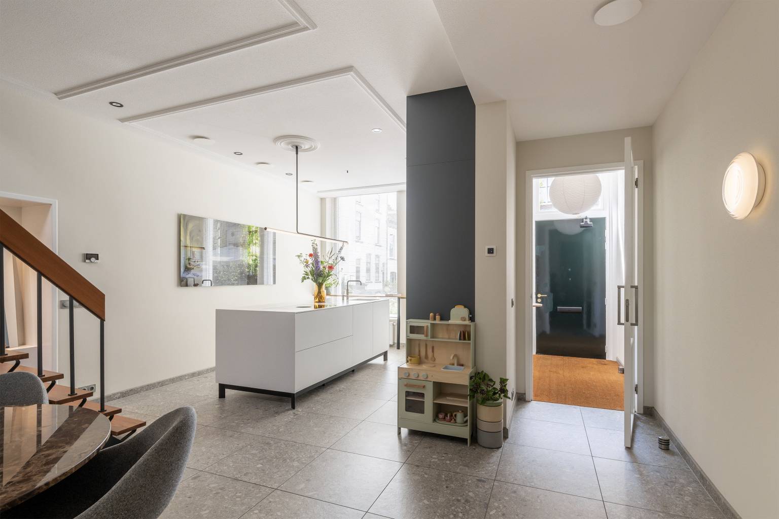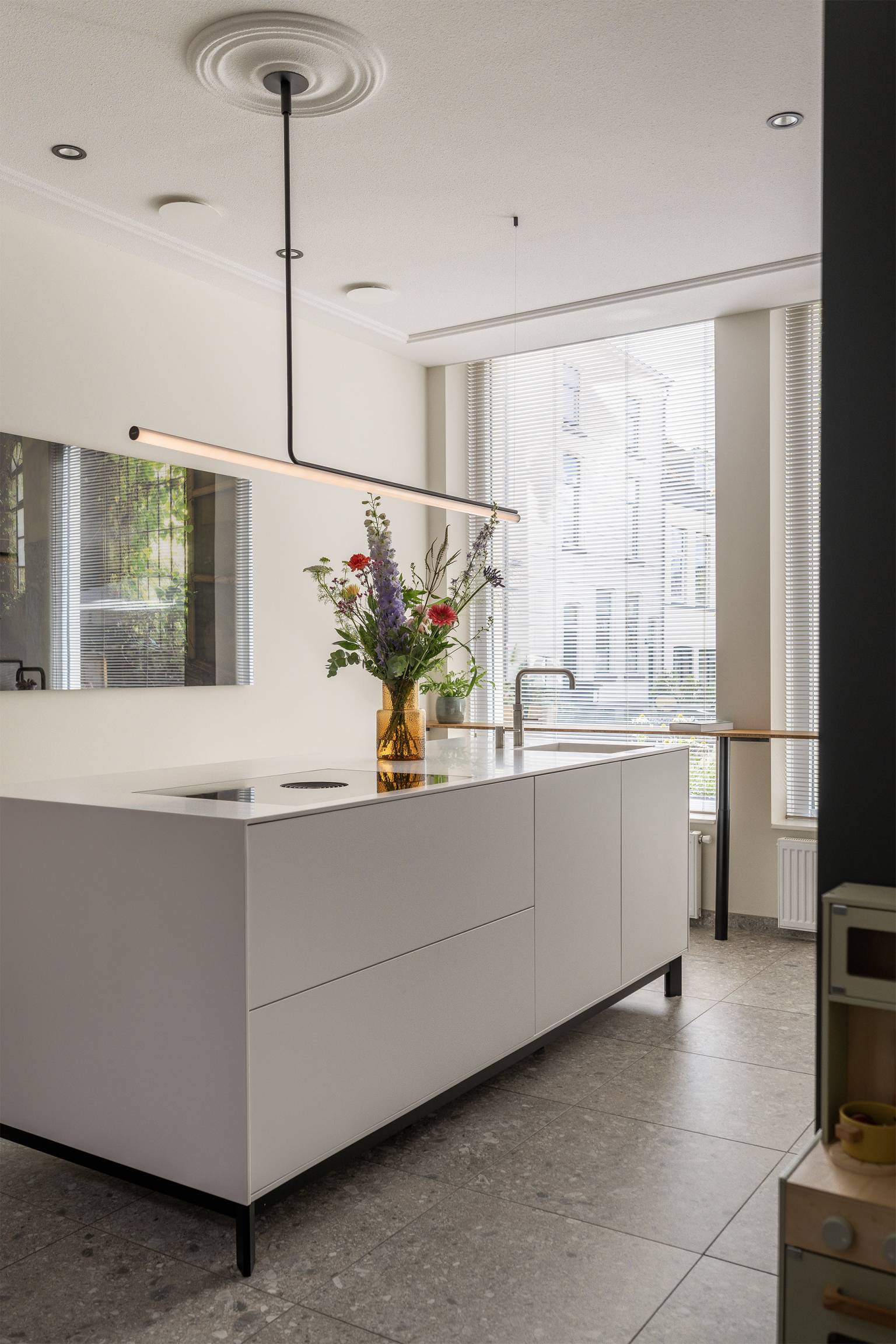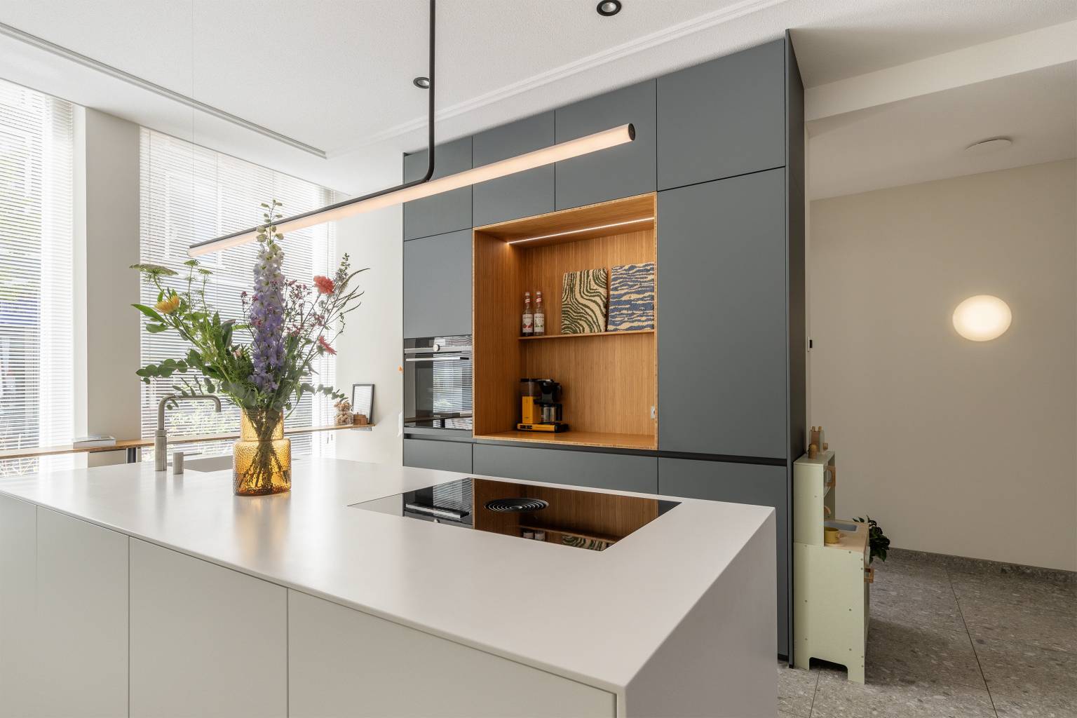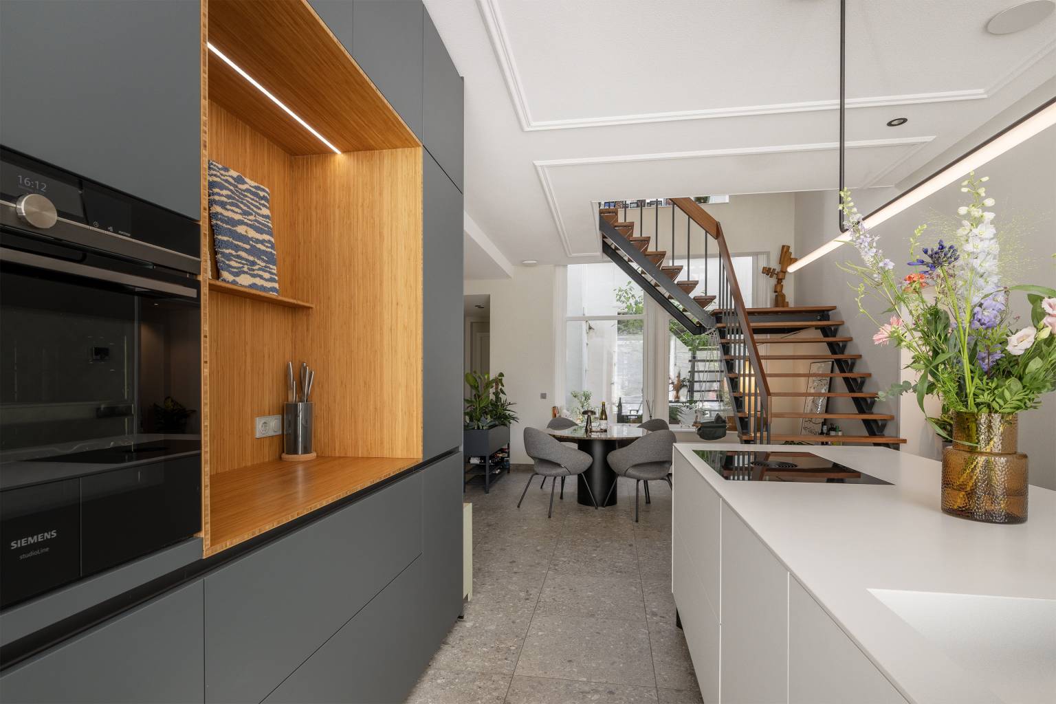 Via een lichte hal kom je in de woonkeuken; een plek die ruimtelijk voelt door het hoge plafond, de vide en open mahoniehouten trap. Een plek om heerlijk te eten met vrienden en familie. De luxe NEXT125 keuken bestaat uit een kookeiland, een hoge kastenwand met geïntegreerde koffiecorner en mooie bamboehouten bar met zicht op de Hoogstraat. De keuken is voorzien van een inductiekookplaat met een geïntegreerde afzuiging (Bora), een Quooker kraan, een koelkast, een vriezer, een combi stoomoven en vaatwasser (Siemens Studioline).
