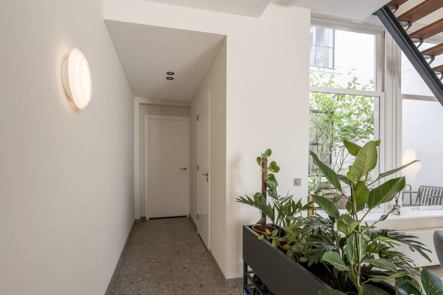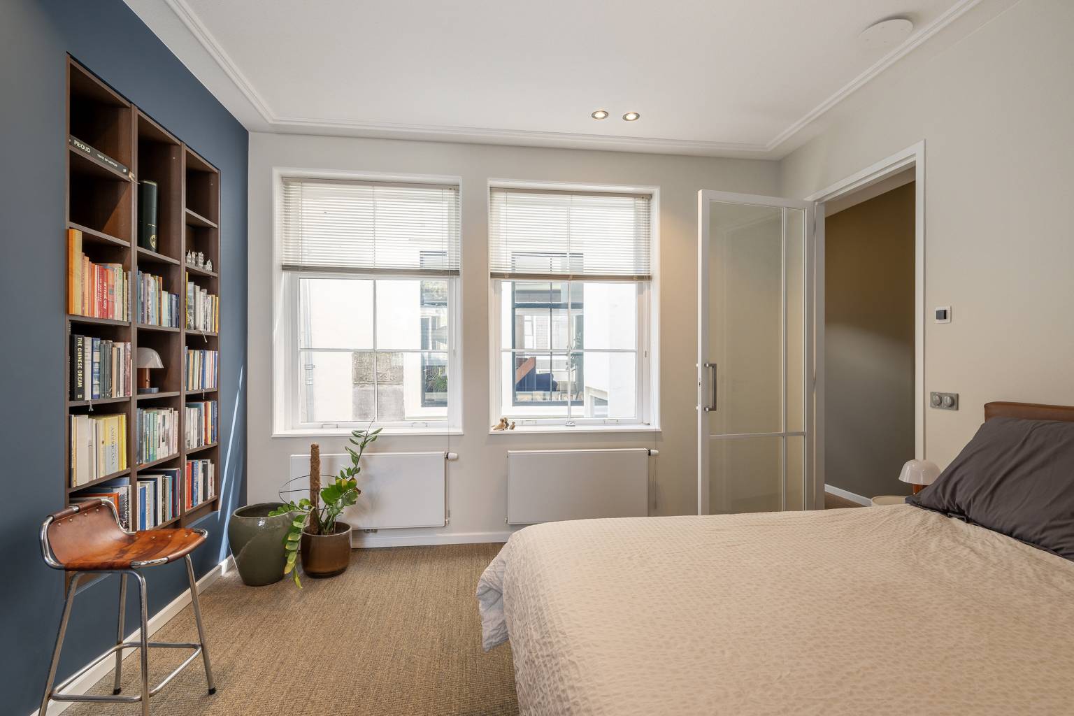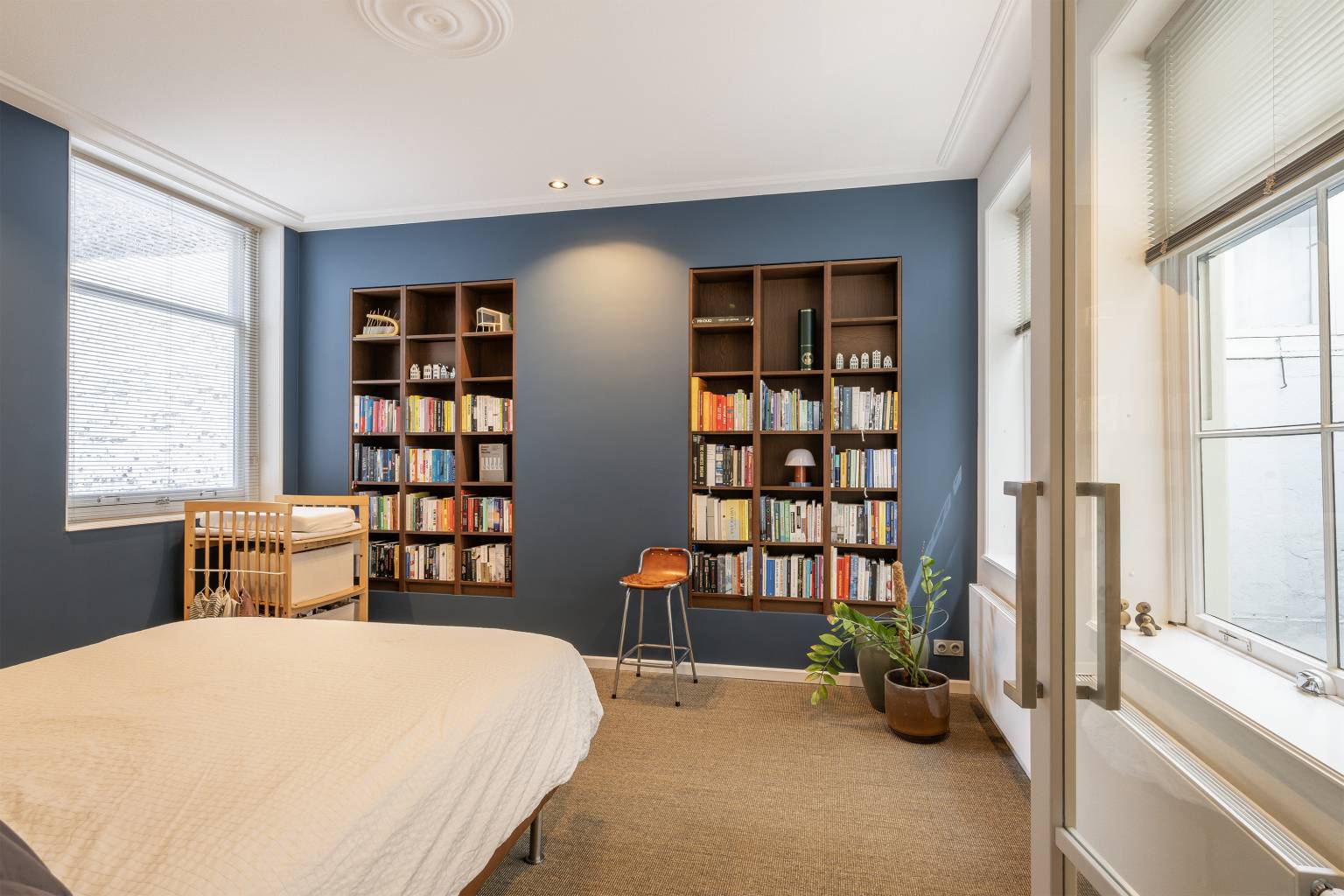 Aan de achterzijde bevinden zich een kamer en een toilet. De kamer heeft ramen aan weerszijden, met uitzicht op twee prachtige historische gevelstenen in de binnenplaats (1558 / 1854). In de wand zijn op fraaie wijze boekenkasten verwerkt en het plafond heeft sierlijsten. Er is een slimme inloopkast (met plek voor een 2e badkamer) en een aparte toilet met een marmeren fonteintje.