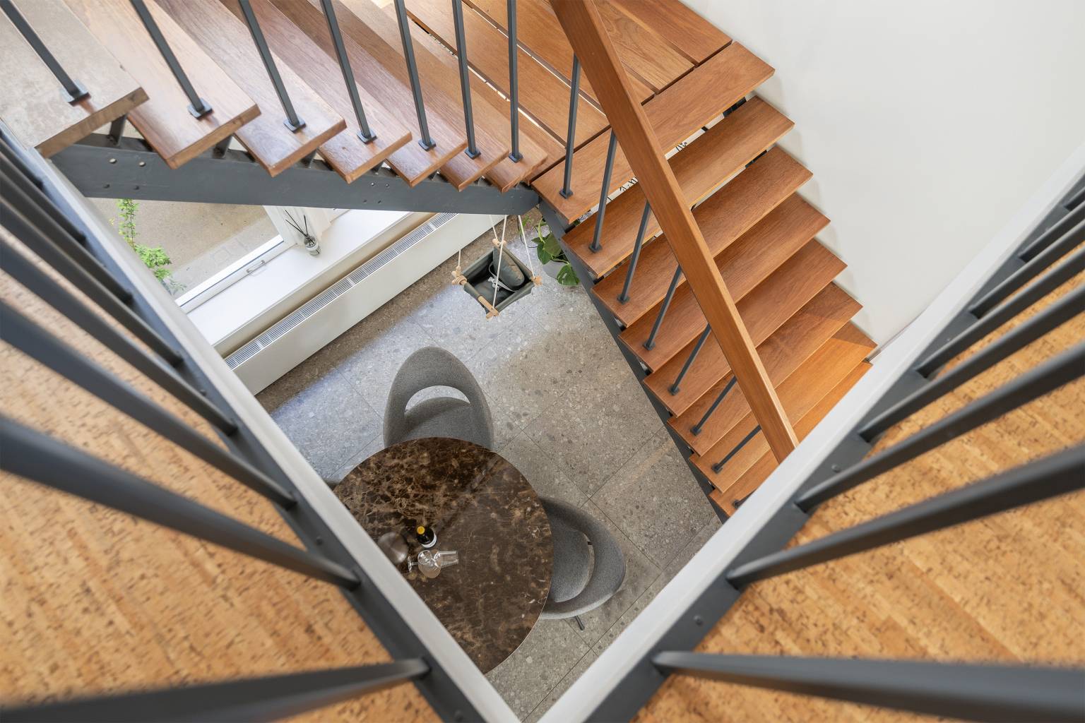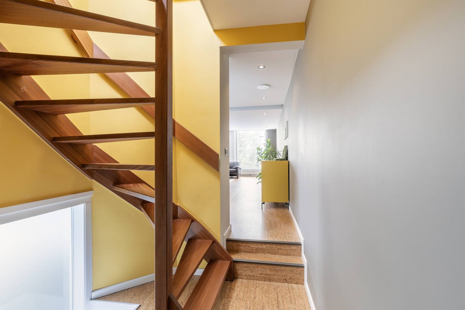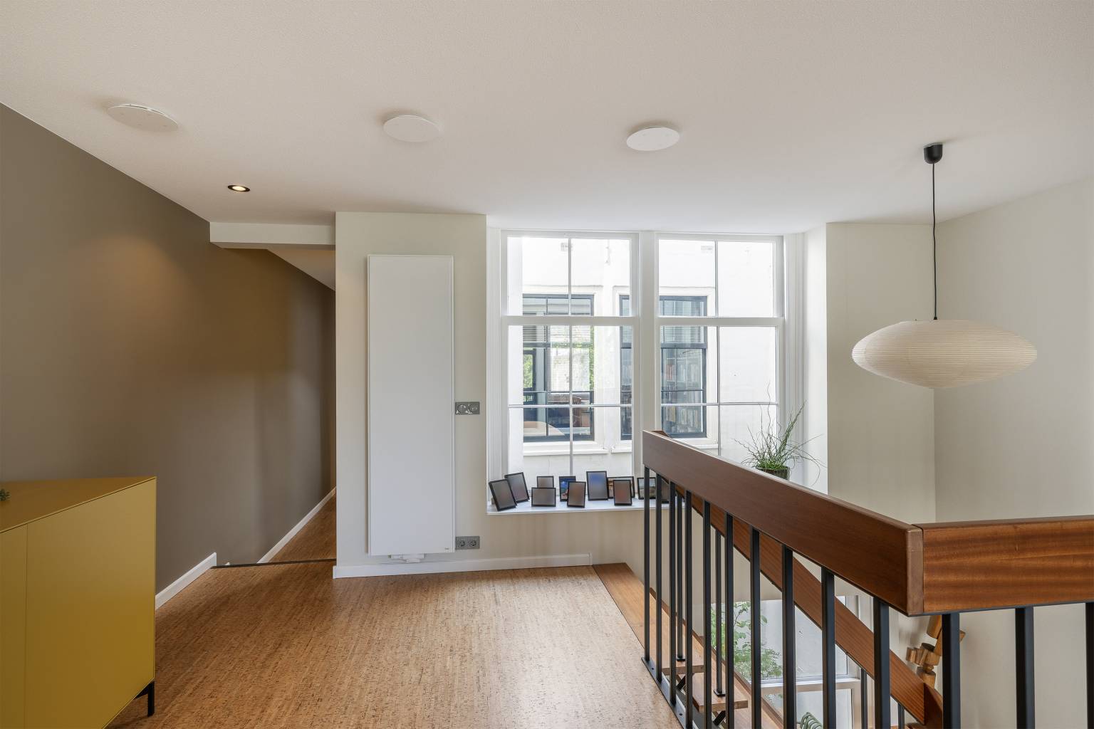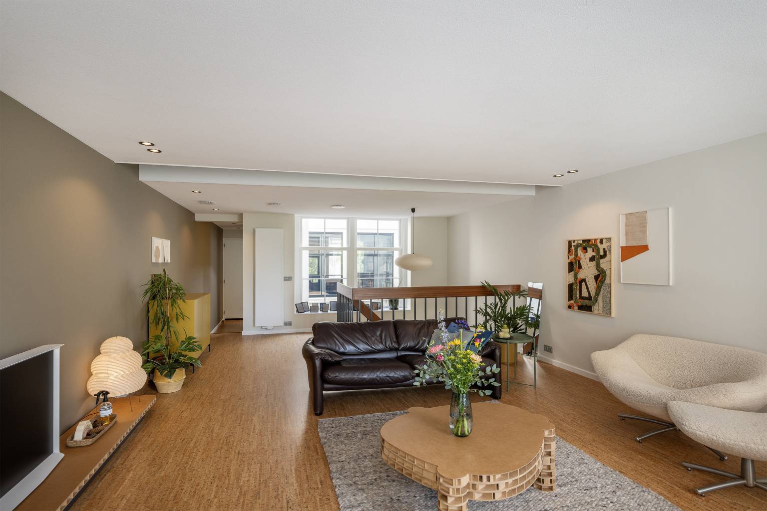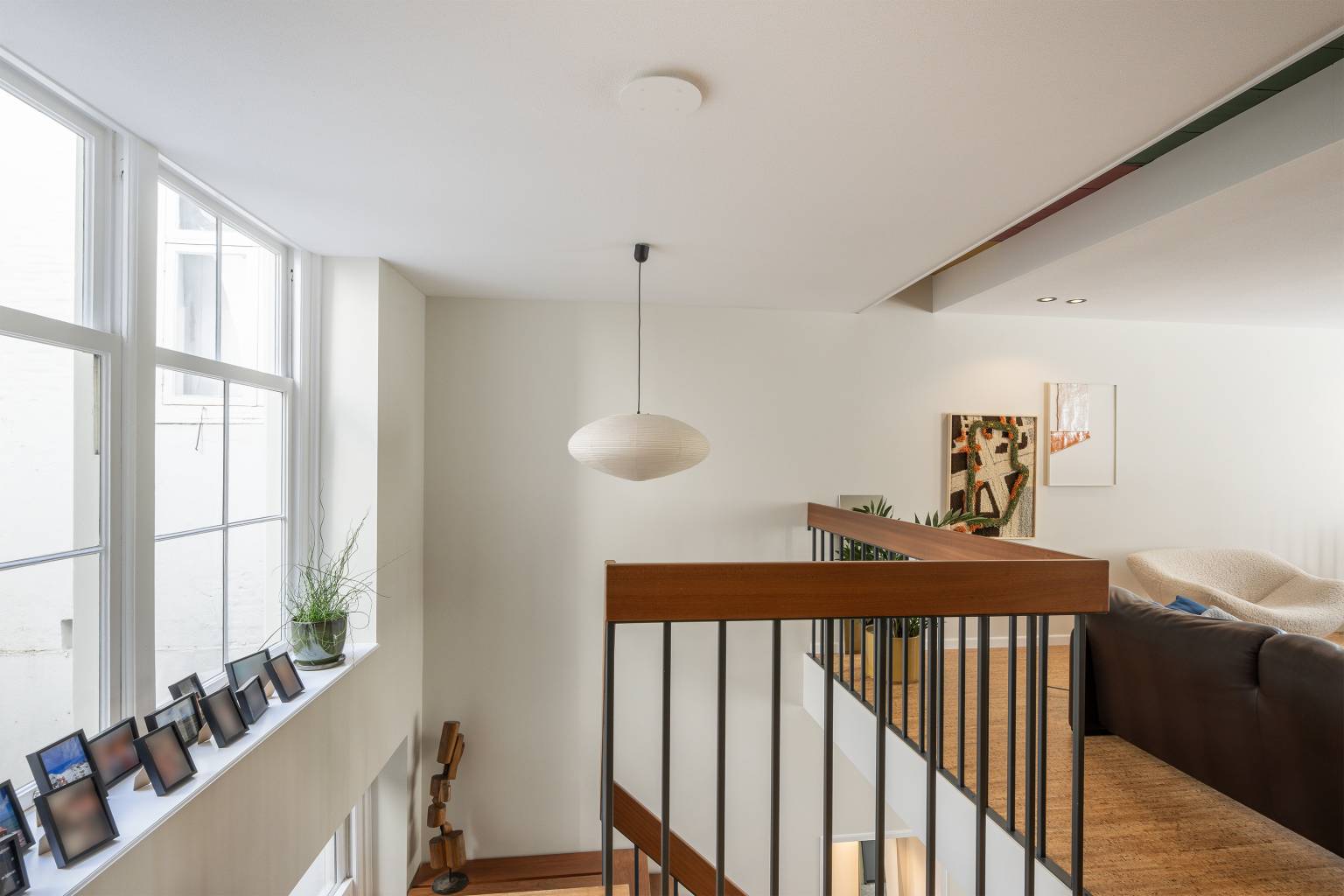 Via de fraaie mahoniehouten trap kom je in de living: een fijne zitruimte aan de voorzijde met kamerhoge ramen en geweldig uitzicht. De vide zorgt voor een open verbinding met de keuken beneden.