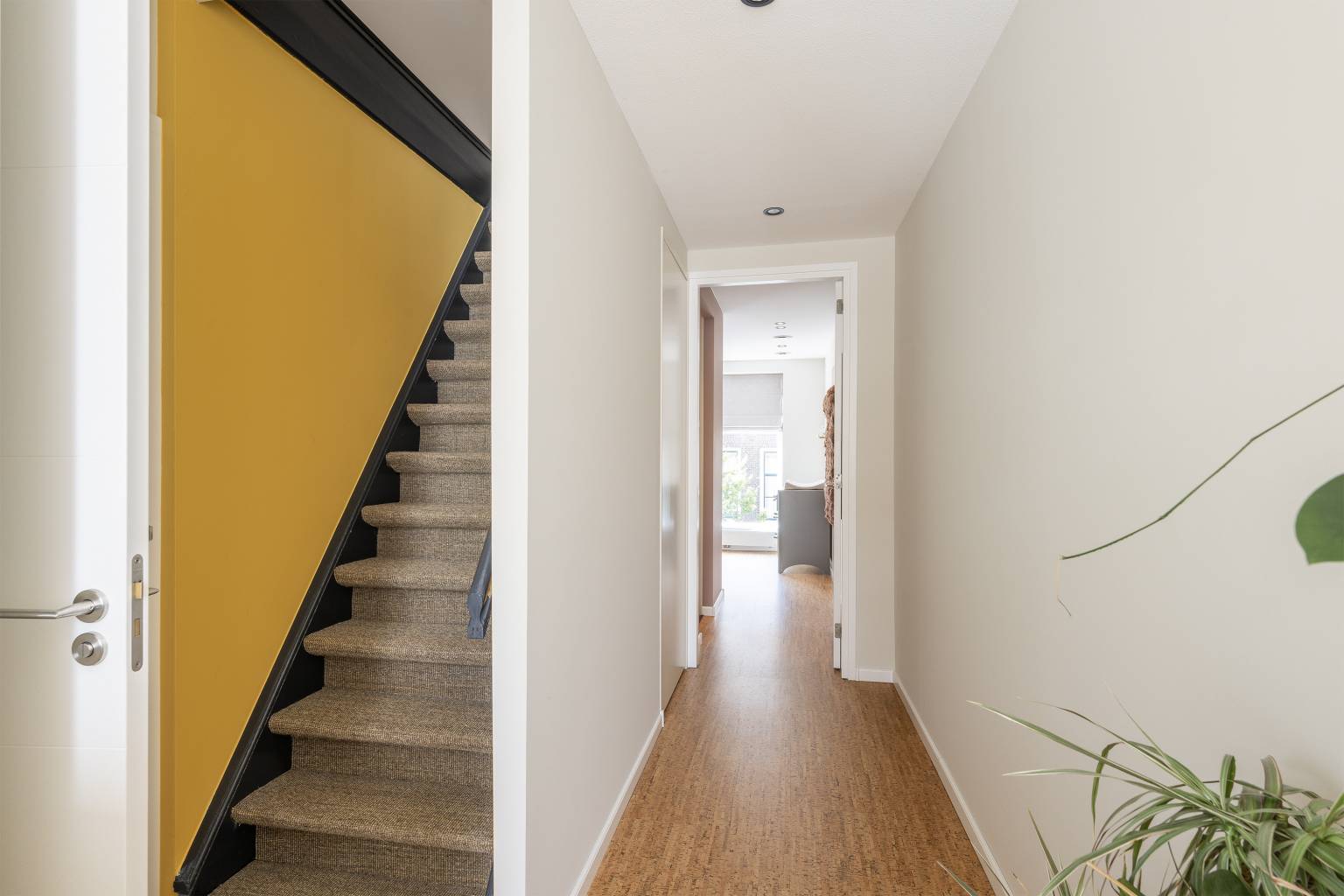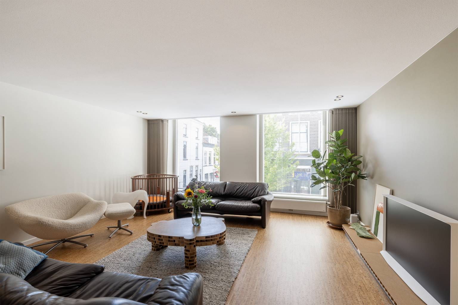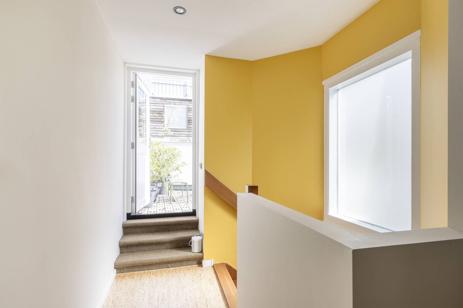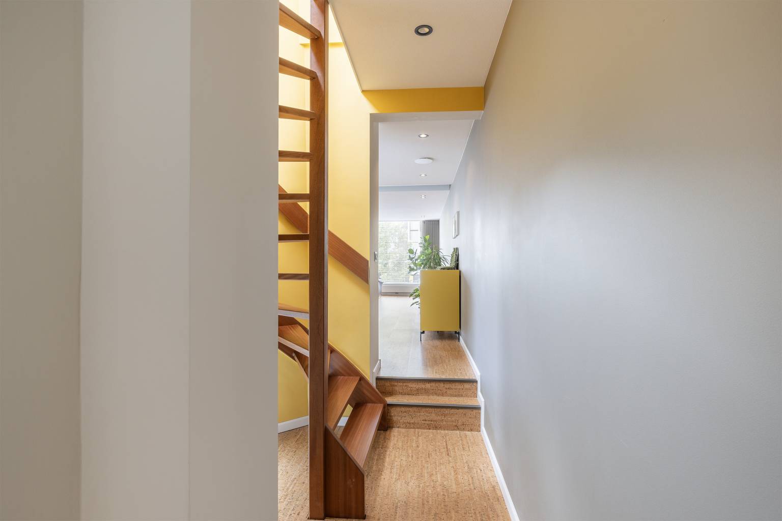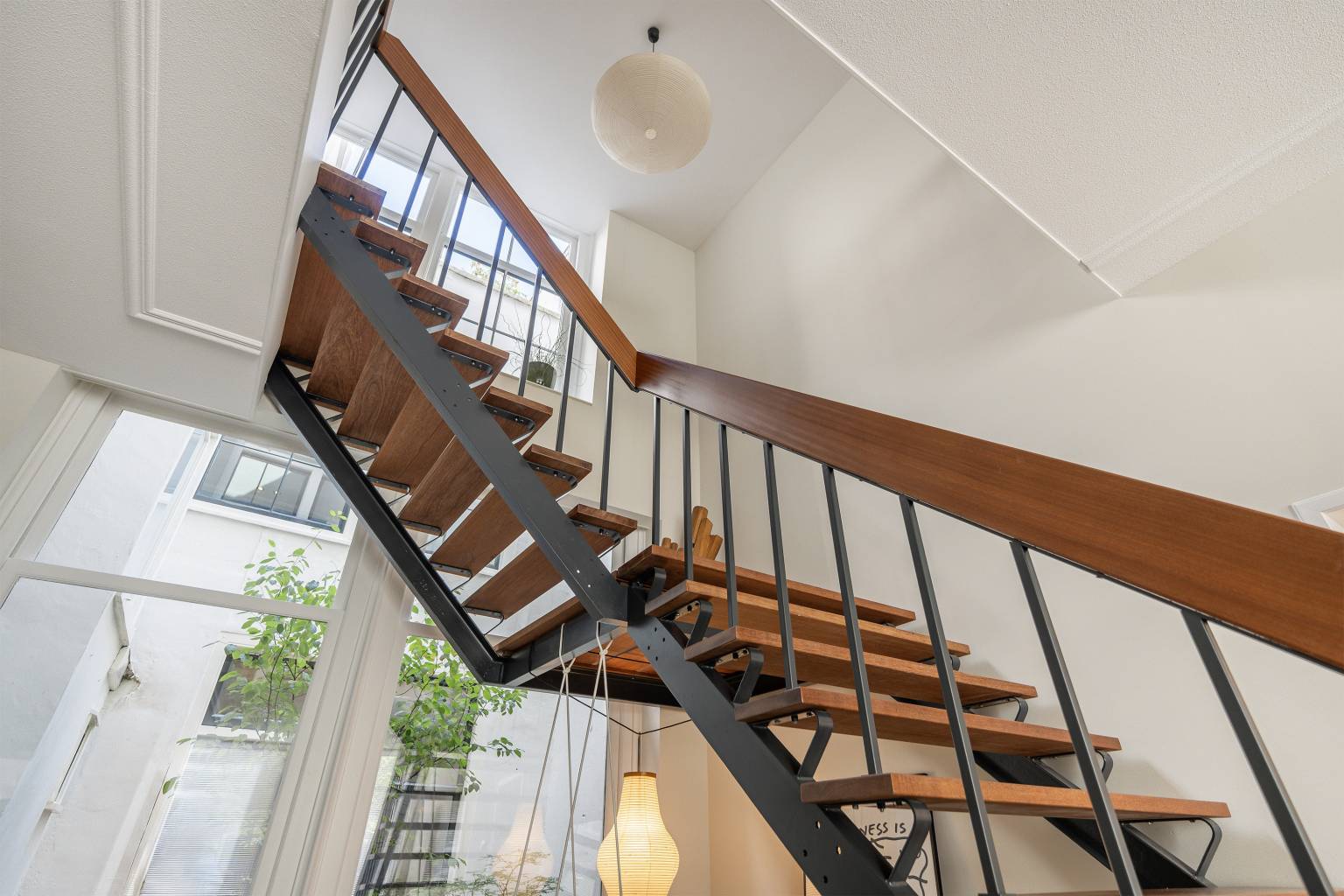 Via de fraaie mahoniehouten trap kom je in de living: een fijne zitruimte aan de voorzijde met kamerhoge ramen en geweldig uitzicht. De vide zorgt voor een open verbinding met de keuken beneden.