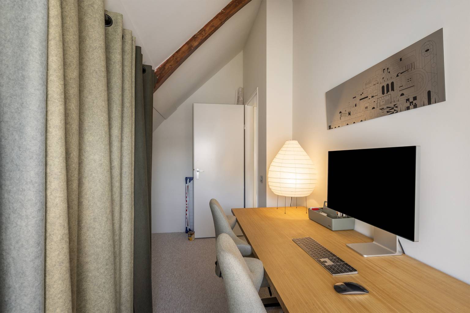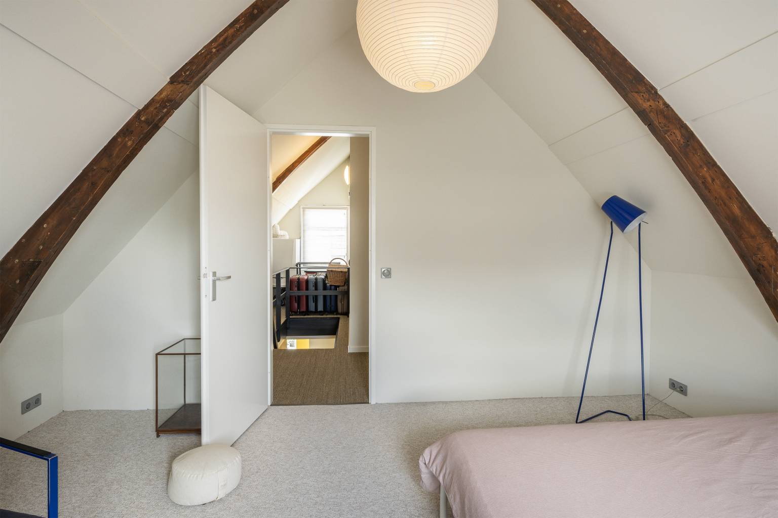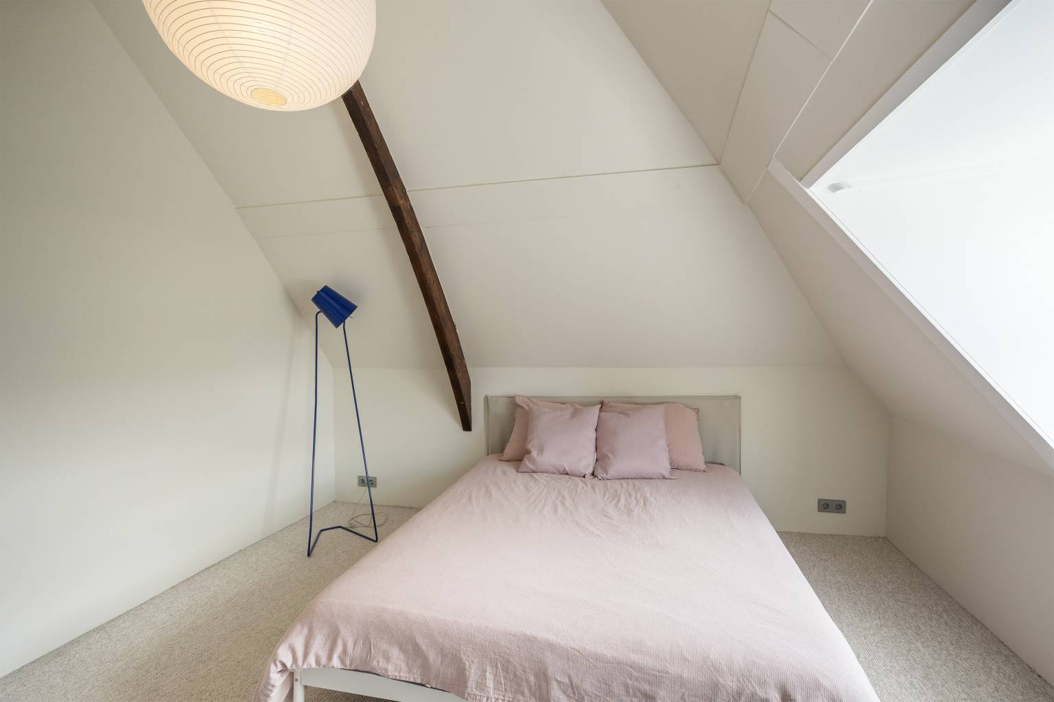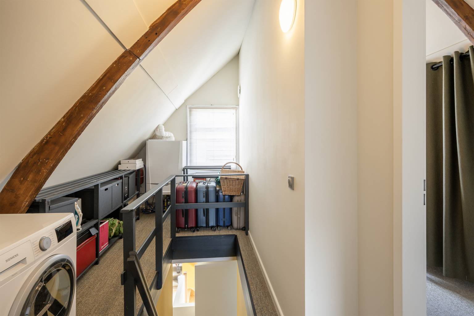 Deze verdieping onder de (recent geïsoleerde) kap heeft twee slaapkamers en een wasruimte met cv-opstelling. De originele balken zijn zichtbaar gebleven, en de kamers zijn flexibel te gebruiken als logeerkamer, werkruimte of speelkamer. Ook hier is plek voor een compacte 2e badkamer.