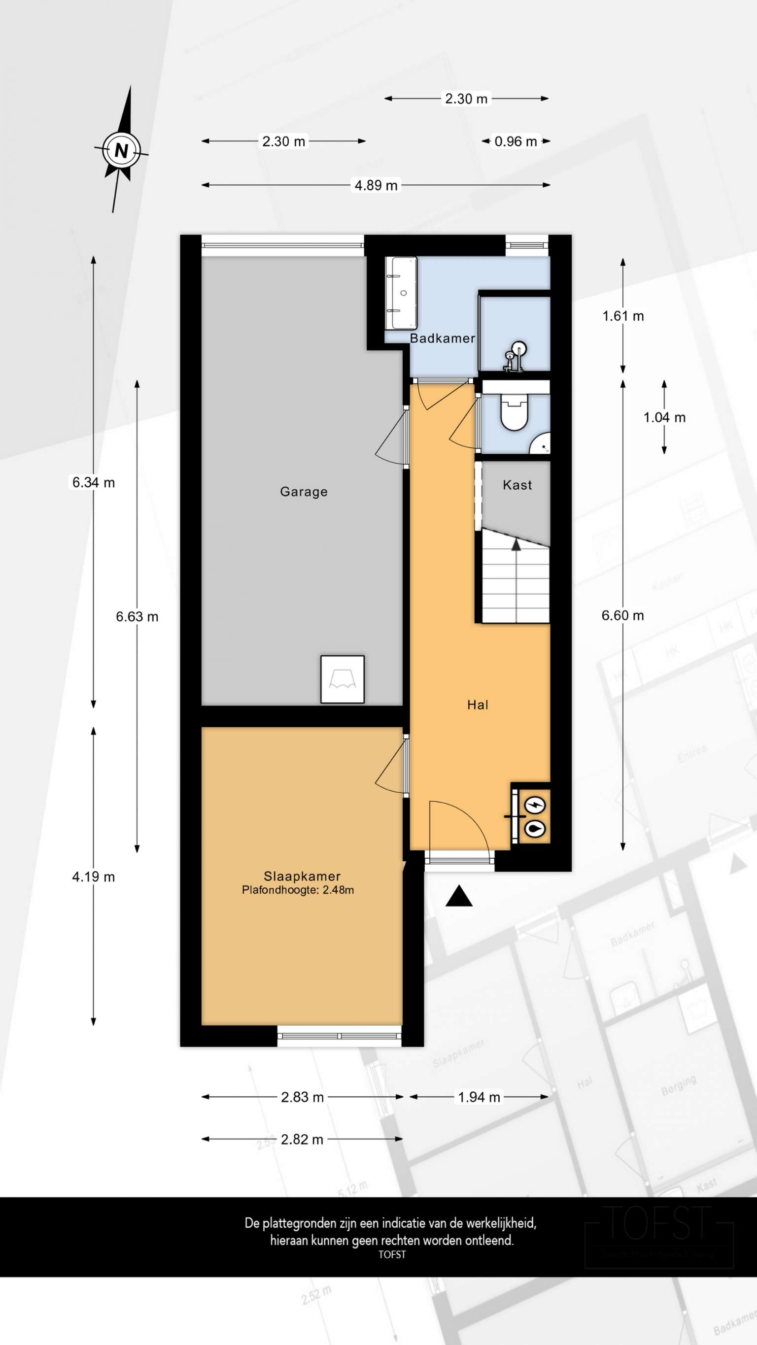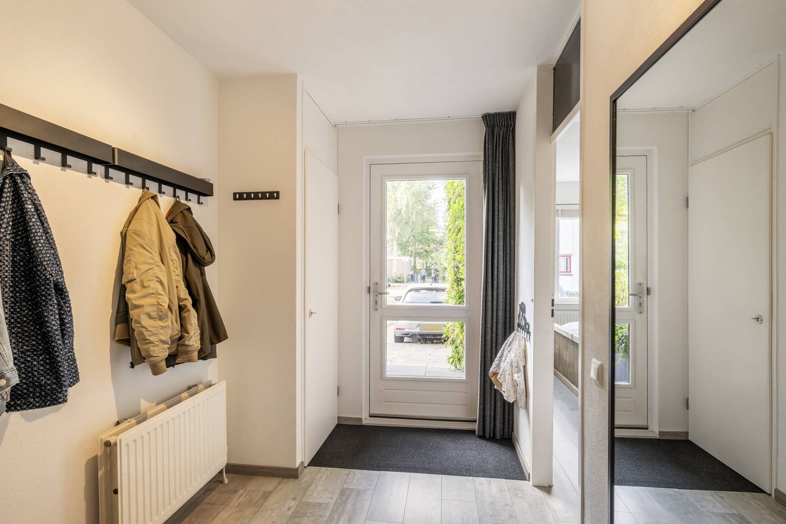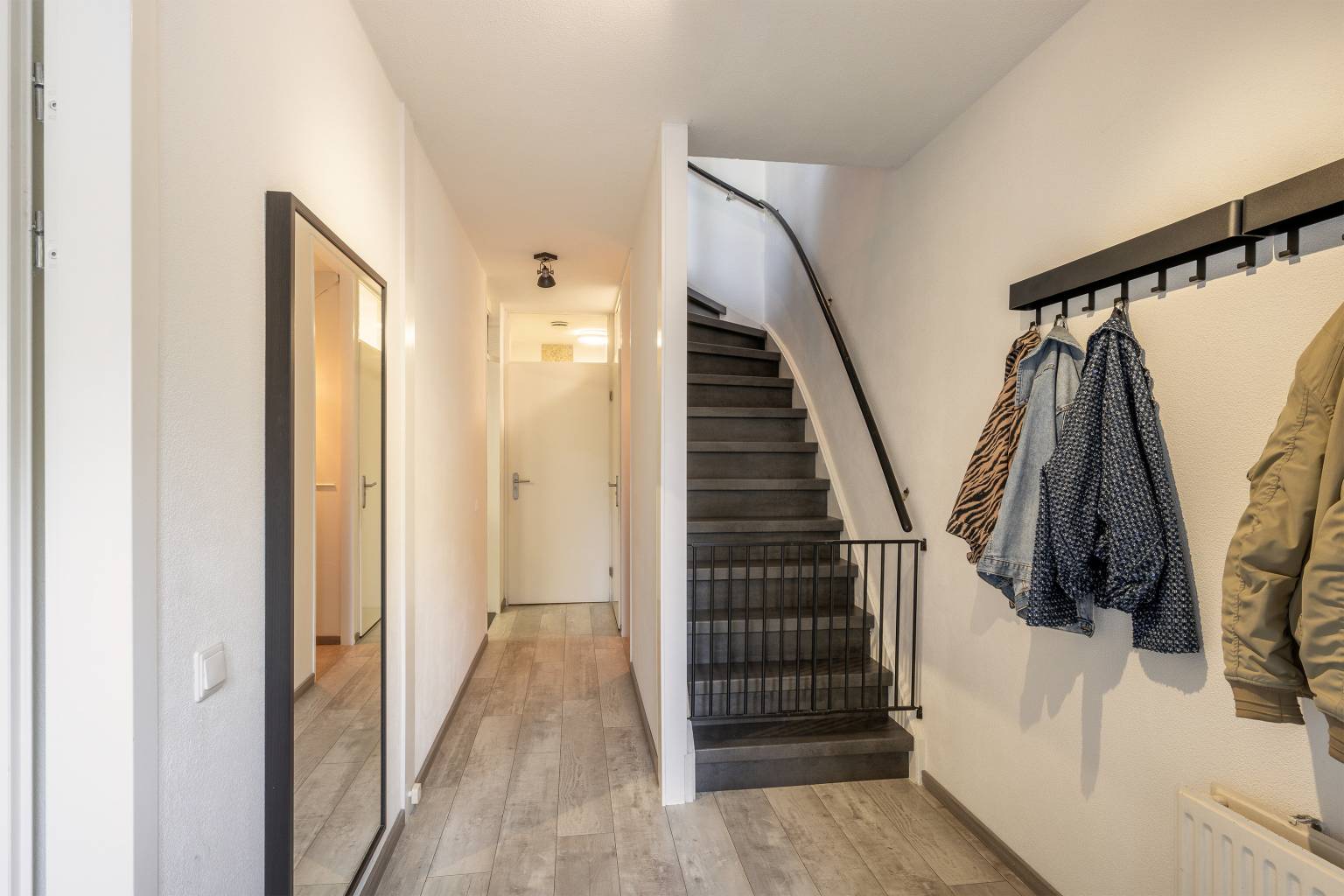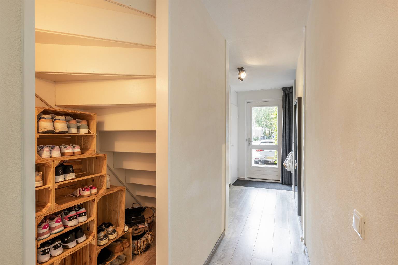 Na de voordeur is er toegang tot de entreehal. Deze is voorzien van een laminaatvloer en met spachtelputz afgewerkte wanden. Naast de voordeur bevindt zich de meterkast en onder de trap naar de verdieping is er een direct toegankelijke garderobekast. Daarnaast is er vanuit de hal toegang tot de eerste slaapkamer, de garage, de badkamer en het gedeeltelijk betegelde toilet, dat is voorzien van een zwevend toilet en een fonteintje.