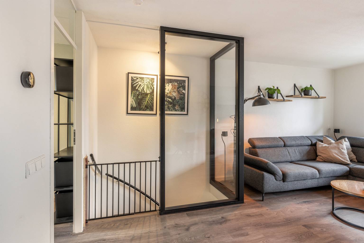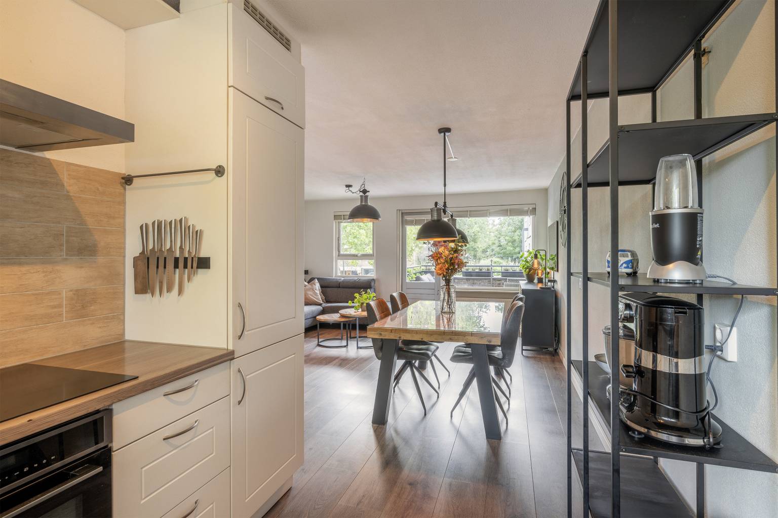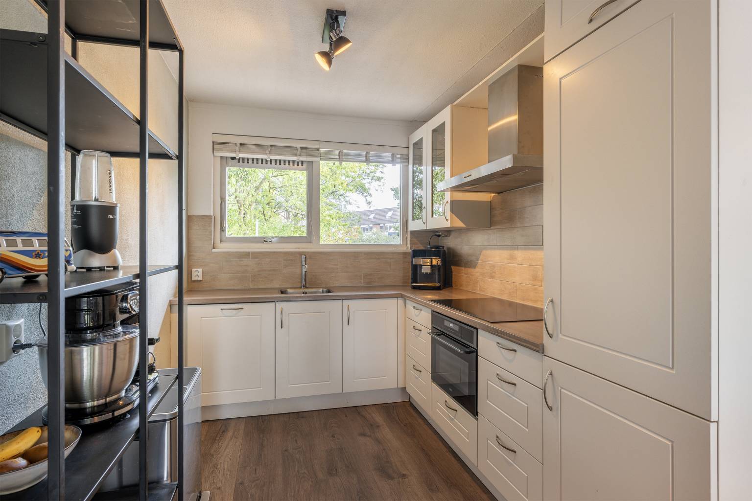 Deze woonverdieping heeft na de trapopgang een directe toegang tot de woonkamer. Het trapgat is mooi afgesloten met een glazen pui, wat zorgt voor een modern en strakke uitstraling. De wanden zijn afgewerkt met spachtelputz en op de vloer ligt laminaat. Dit alles is geheel terug te vinden op deze verdieping. De woonkamer is gesitueerd aan de voorzijde en heeft toegang tot het overdekte balkon, dat deels beschut is gelegen. In het verlengde van de woonkamer is de keuken geplaatst in een L-vorm. Deze is voorzien van een betegelde achterwand en bovenkasten. Daarnaast is er diverse apparatuur aanwezig, zoals een combi oven, een vaatwasser, een koel-/vriescombinatie, een inductiekookplaat en een afzuigkap.