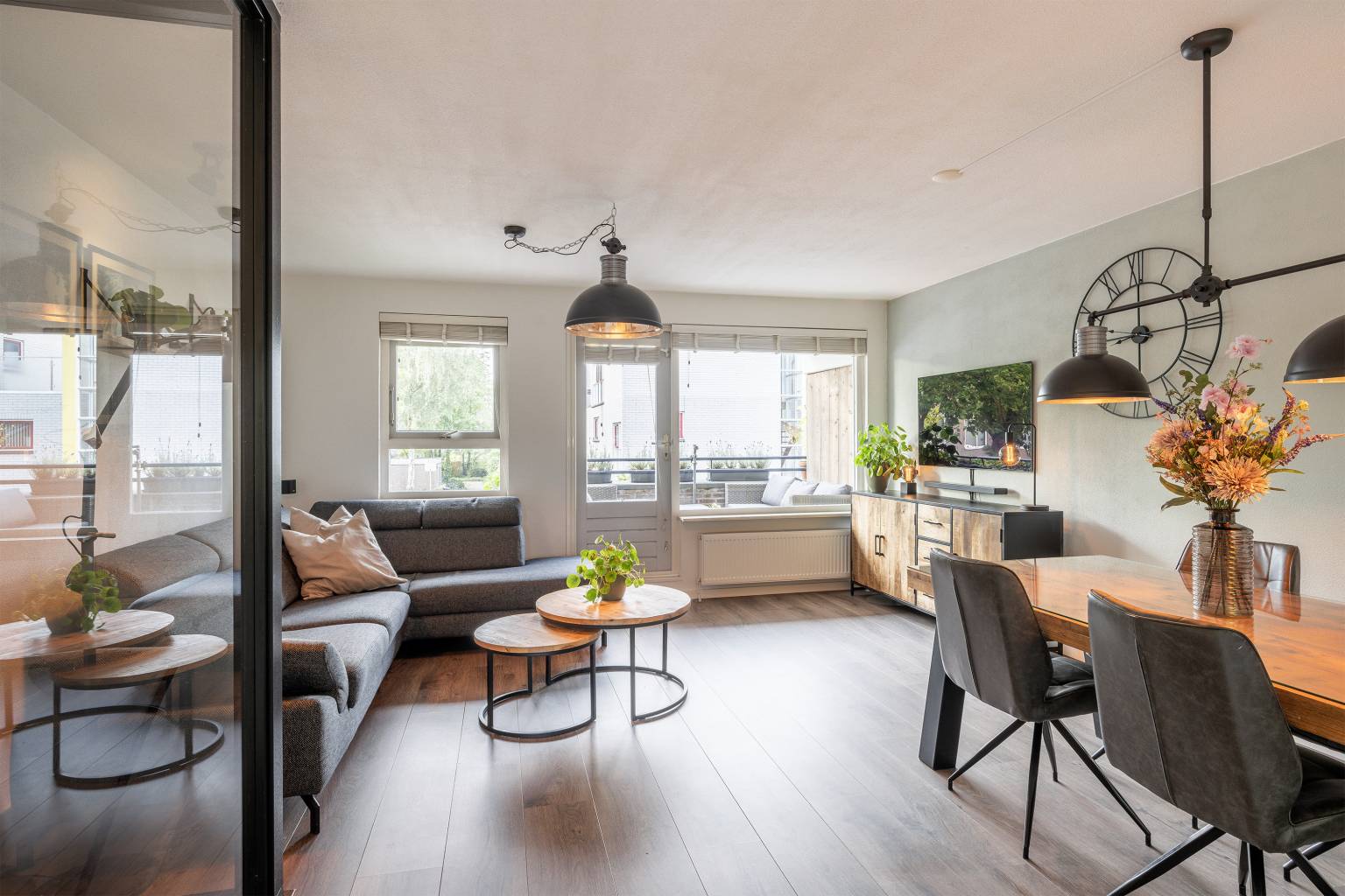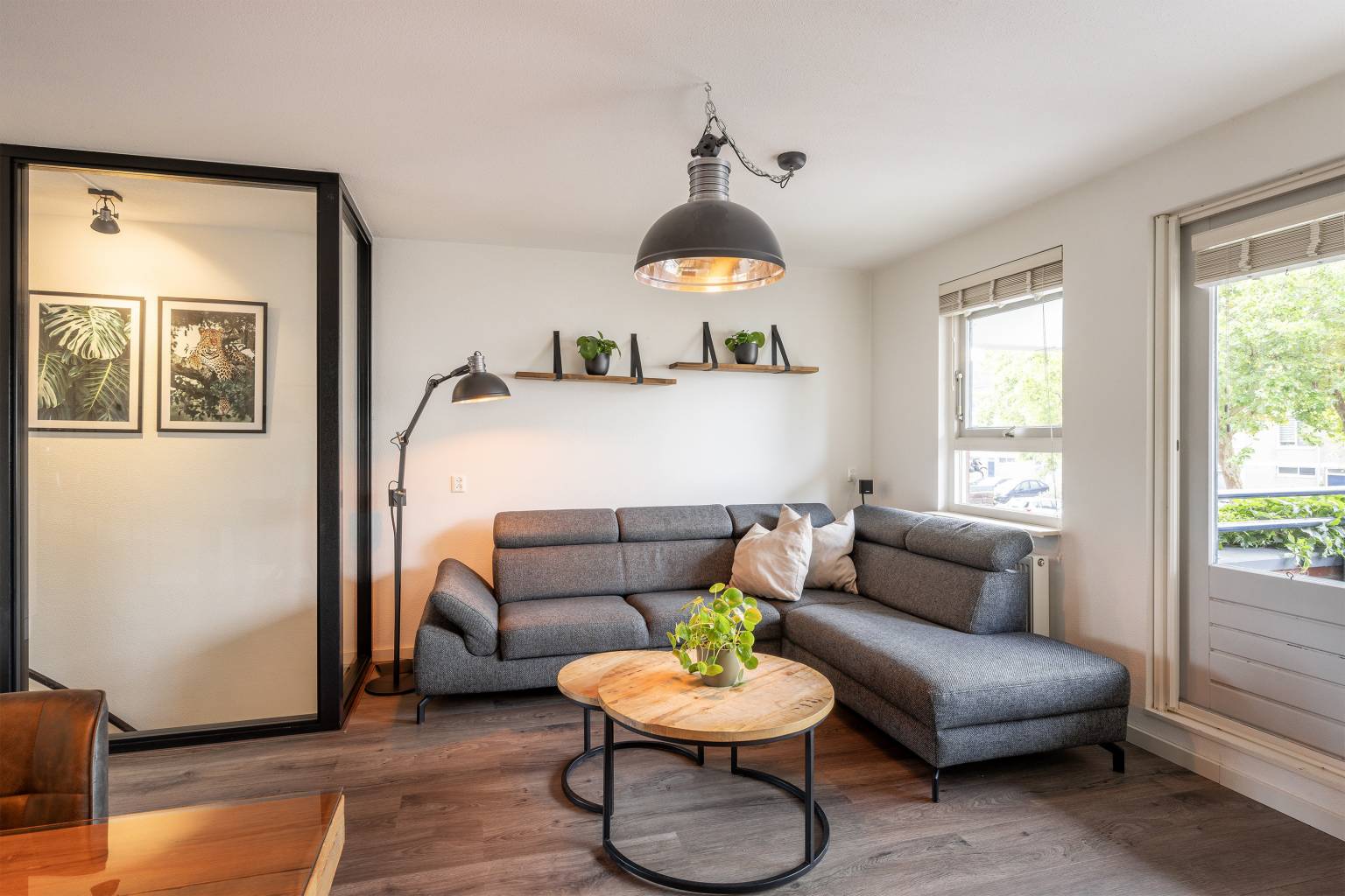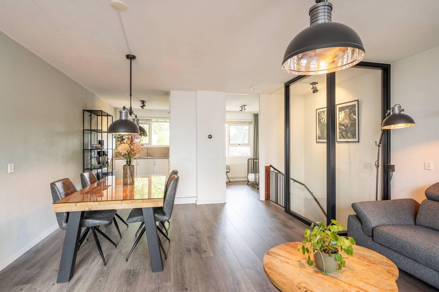 Deze woonverdieping heeft na de trapopgang een directe toegang tot de woonkamer. Het trapgat is mooi afgesloten met een glazen pui, wat zorgt voor een modern en strakke uitstraling. De wanden zijn afgewerkt met spachtelputz en op de vloer ligt laminaat. Dit alles is geheel terug te vinden op deze verdieping. De woonkamer is gesitueerd aan de voorzijde en heeft toegang tot het overdekte balkon, dat deels beschut is gelegen. In het verlengde van de woonkamer is de keuken geplaatst in een L-vorm. Deze is voorzien van een betegelde achterwand en bovenkasten. Daarnaast is er diverse apparatuur aanwezig, zoals een combi oven, een vaatwasser, een koel-/vriescombinatie, een inductiekookplaat en een afzuigkap.