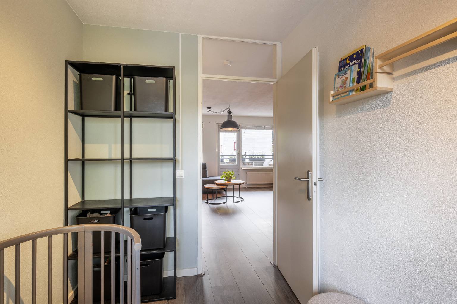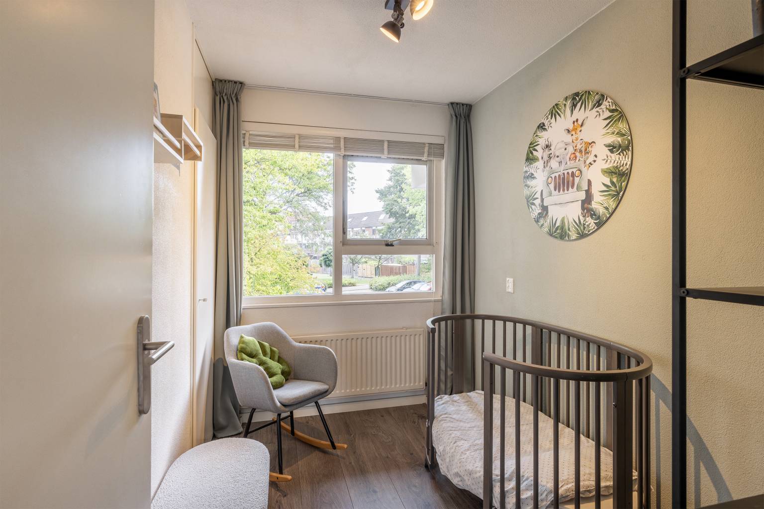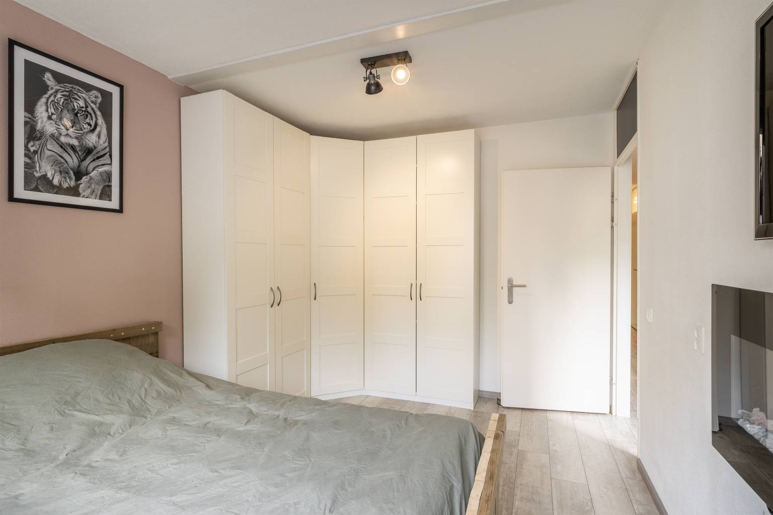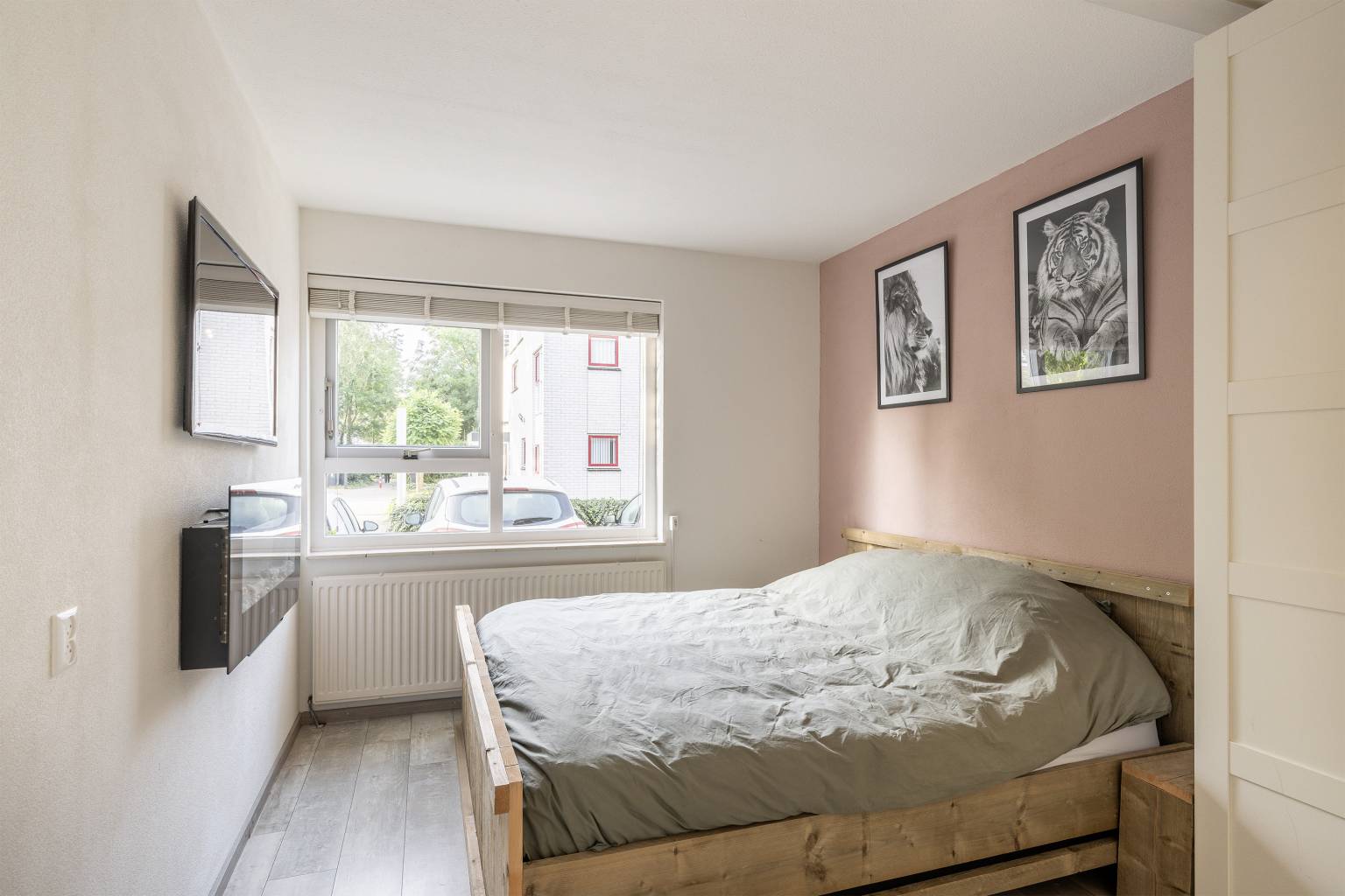 De eerste slaapkamer is een lichte kamer die is gelegen aan de voorzijde. Het beschikt over dezelfde laminaatvloer als de entreehal en heeft ook met spachtelputz afgewerkte wanden.