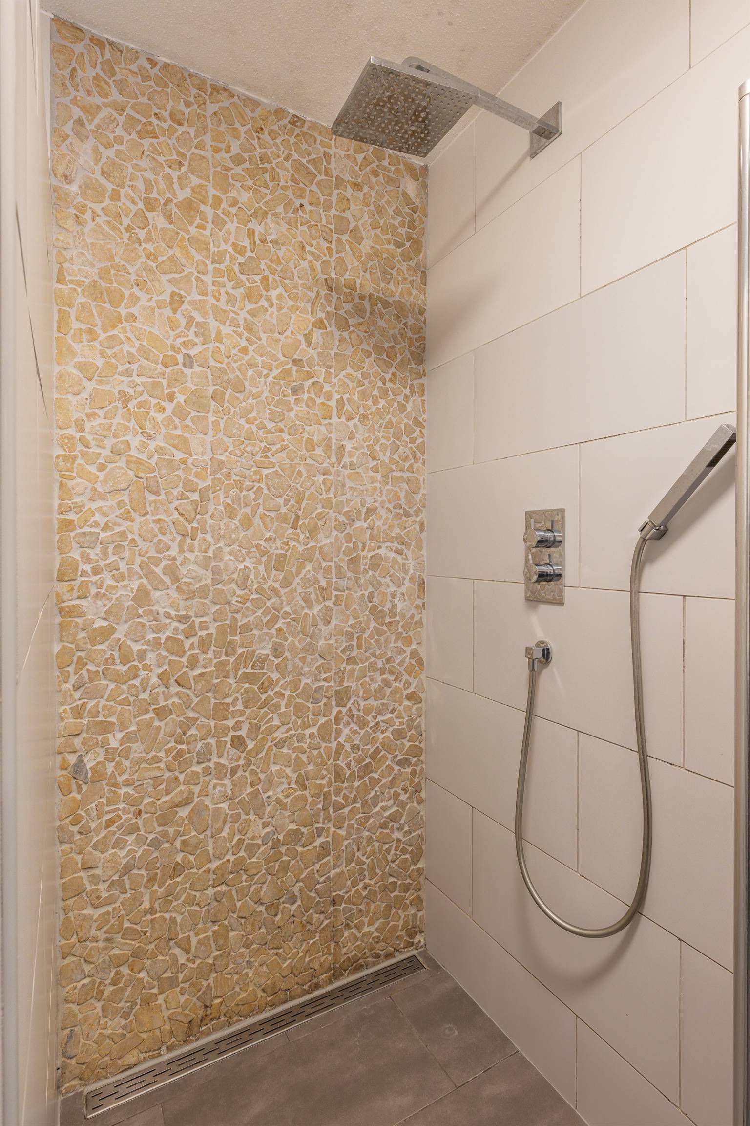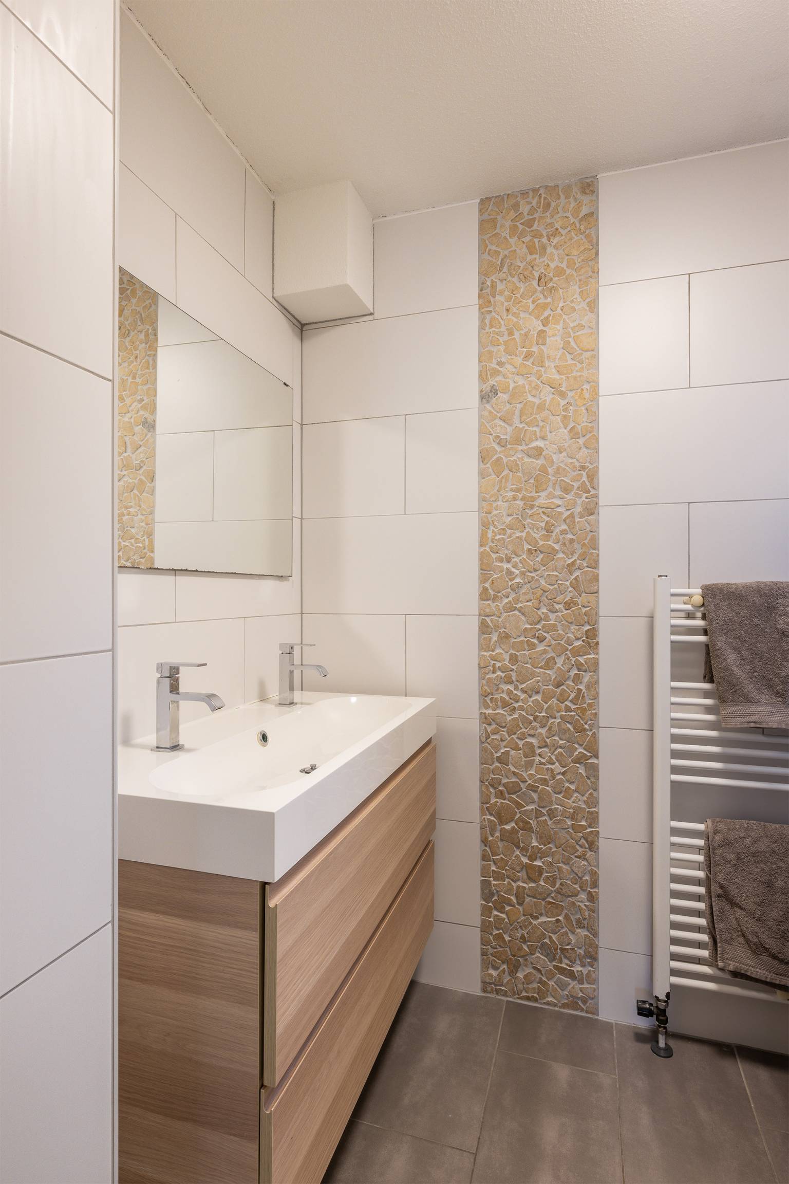 De badkamer is volledig betegeld en is uitgerust met een inloopdouche, een handdoeken radiator en een breed wastafelmeubel met twee kranen.