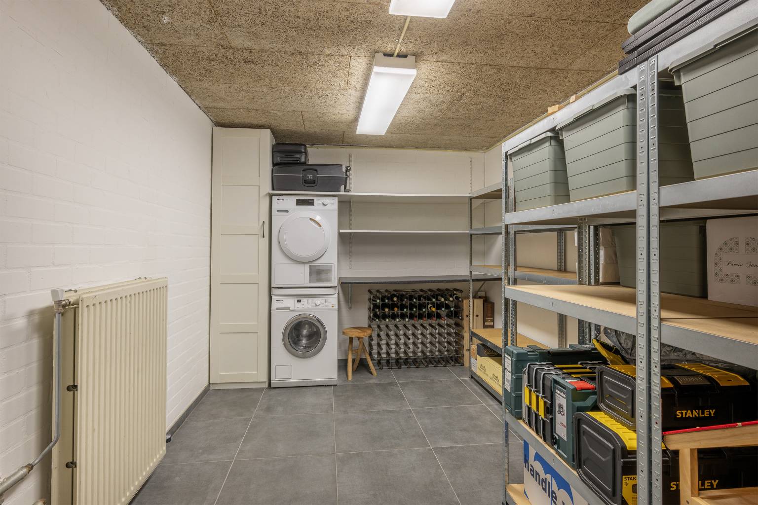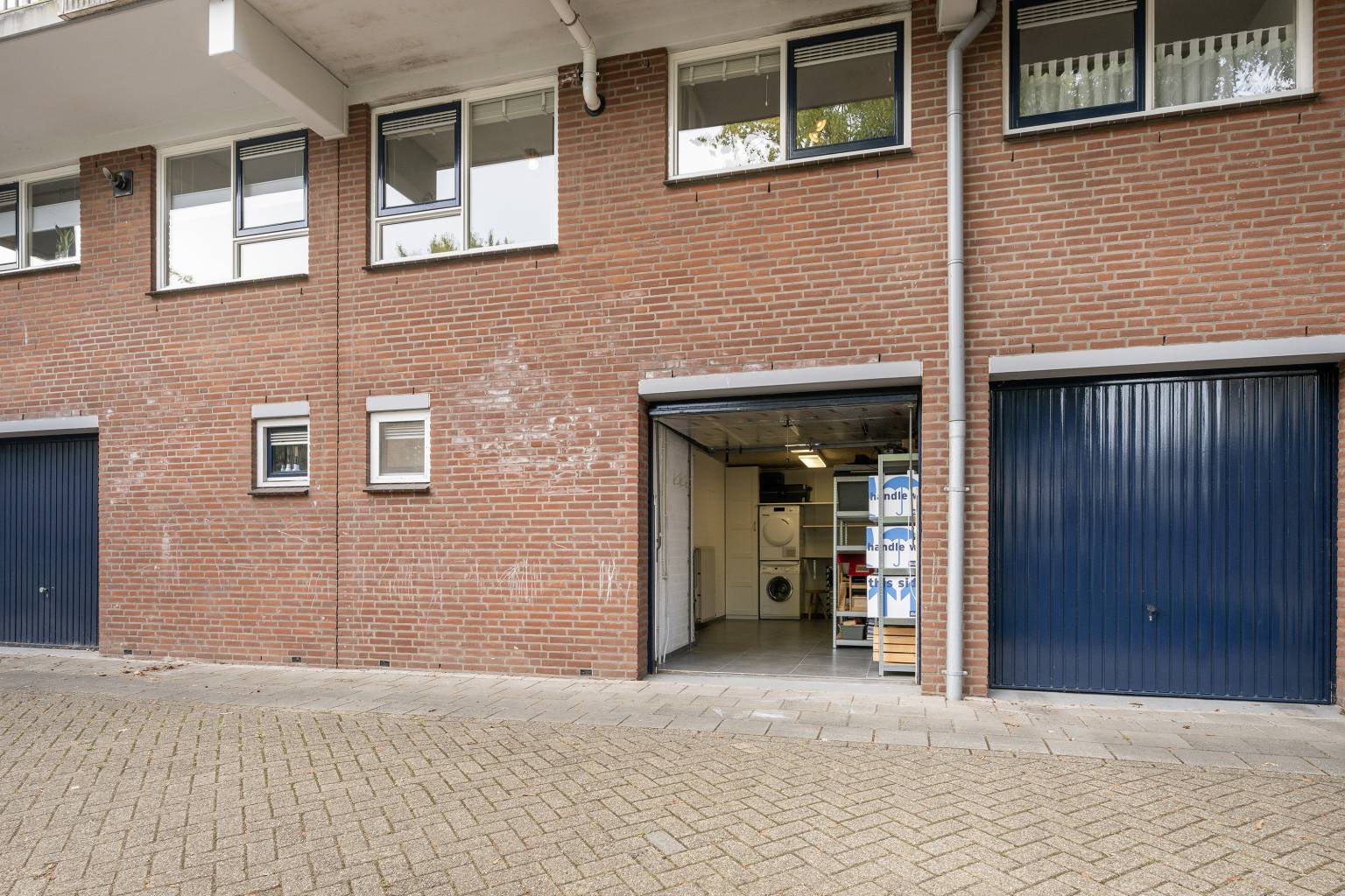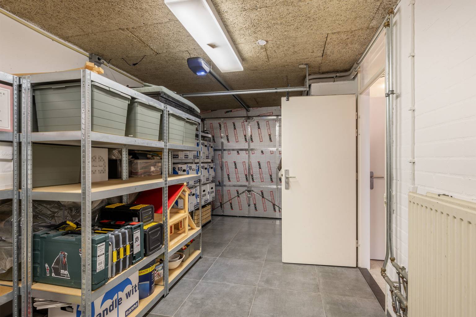 De garage heeft een roldeur en beschikt over elektra, verlichting, verwarming en een wasmachine aansluiting. De vloer is voorzien van tegels en de wanden zijn gesausd.