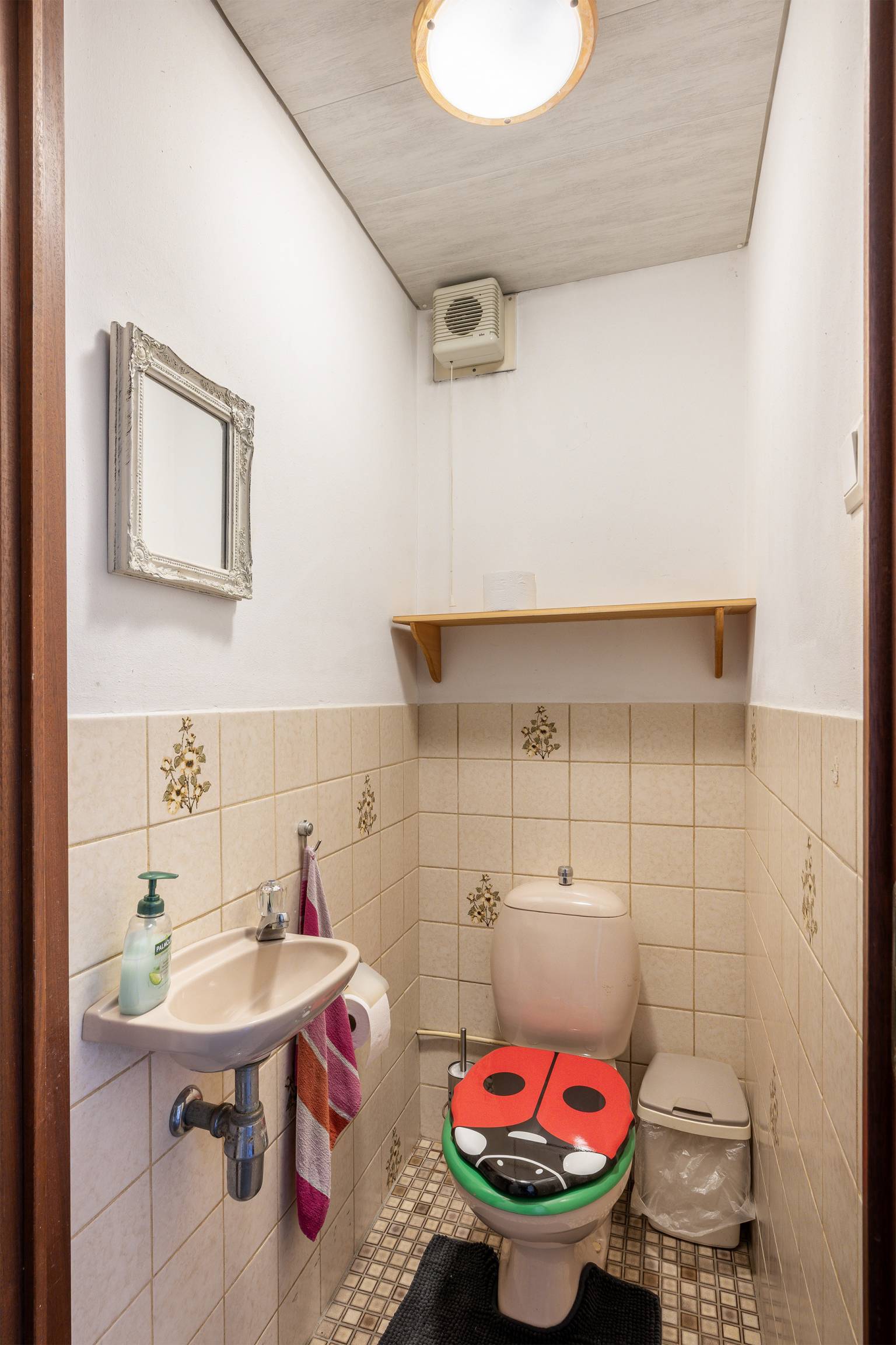 Het toilet is gedeeltelijk betegeld en voorzien van een staande toiletpot, een fonteintje en afzuiging.