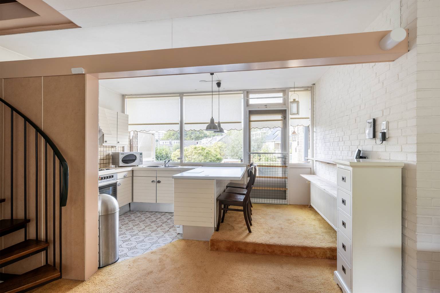 Na de trapopgang is er een open toegang tot deze woonverdieping, waarbij de woonkamer is gesitueerd aan de voorzijde en aan de achterzijde bevindt zich de open keuken. De vloer is voorzien van vloerbedekking en de wanden zijn deels behangen en deels voorzien van spachtelputz. Aan de voorzijde is het hardhouten kozijnen voorzien van dubbel glas en aan de achterzijde is het voorzien van enkel glas.