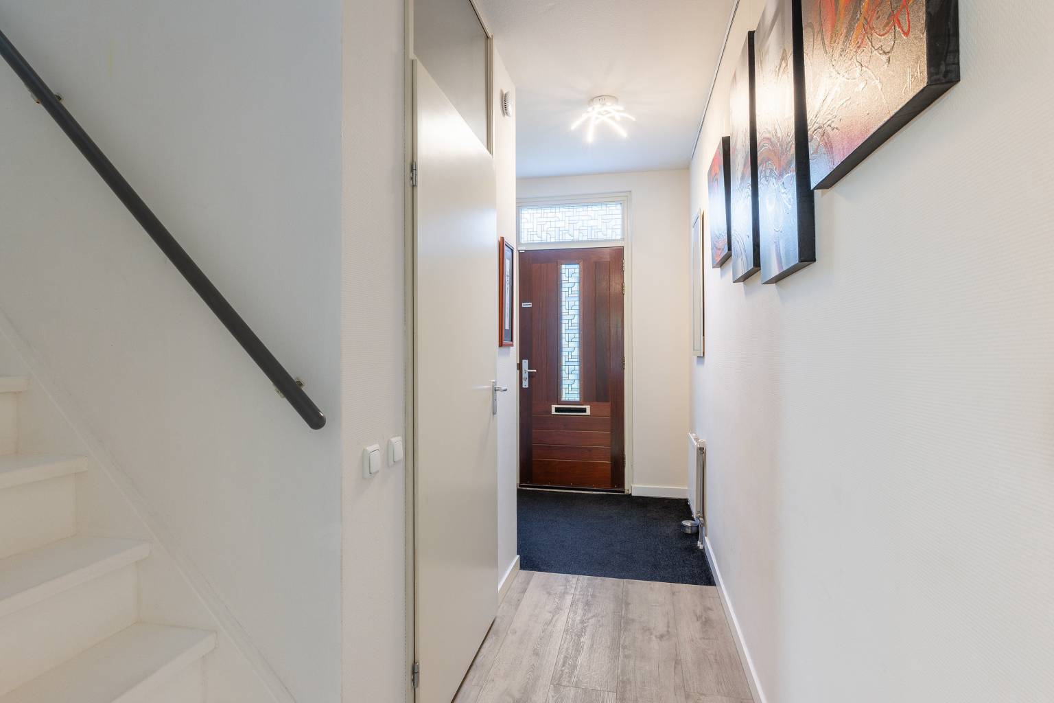 Na de voordeur is er een binnenkomst in de entreehal. Hier zijn de wanden afgewerkt met overschilderd glasweefsel behang en er ligt een PVC vloer. Dit alles is doorgetrokken naar de woonkamer met open keuken. In de hal bevindt zich de meterkast, de trap naar de 1e verdieping en het gedeeltelijk betegelde toilet, dat extra is voorzien van een fonteintje.