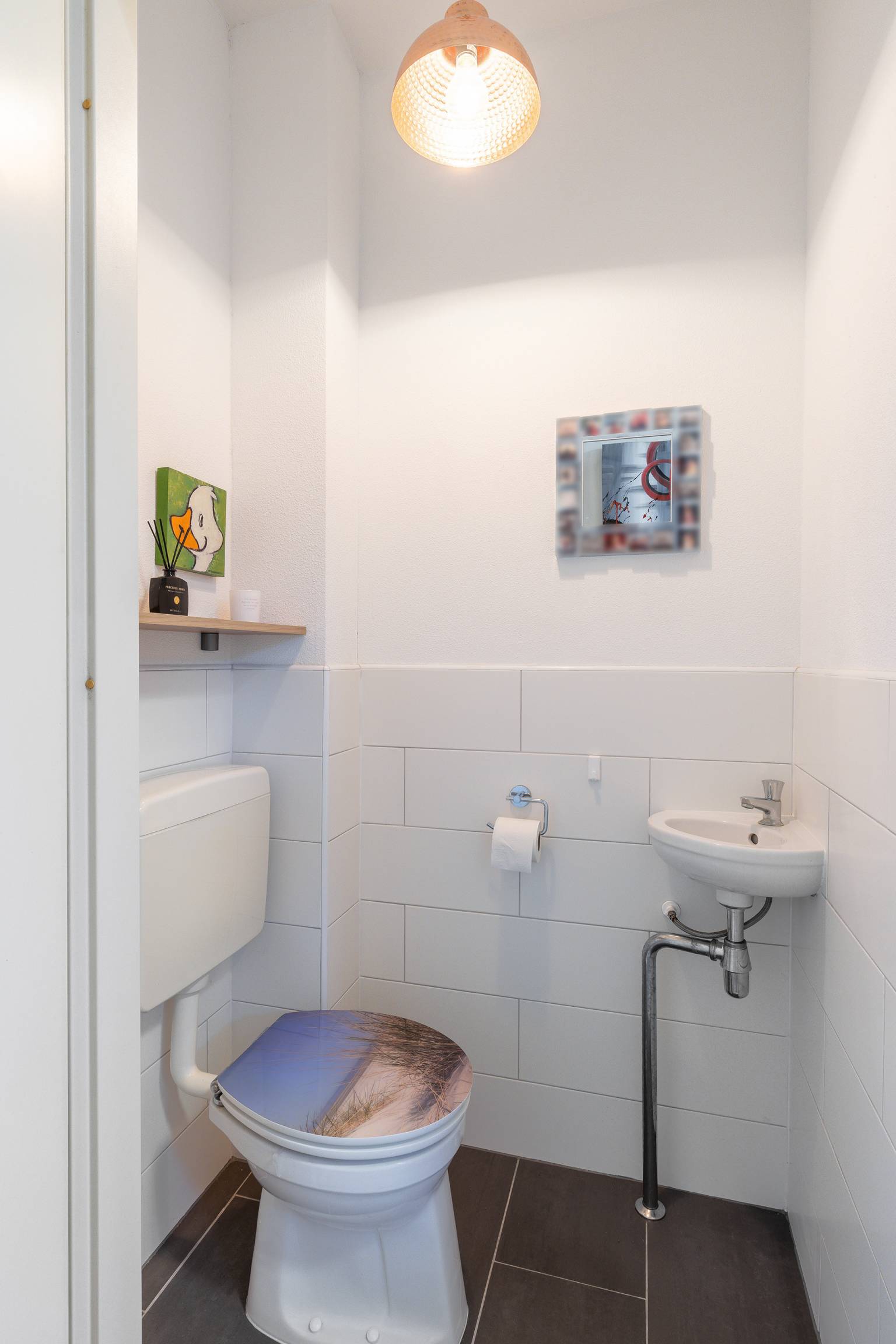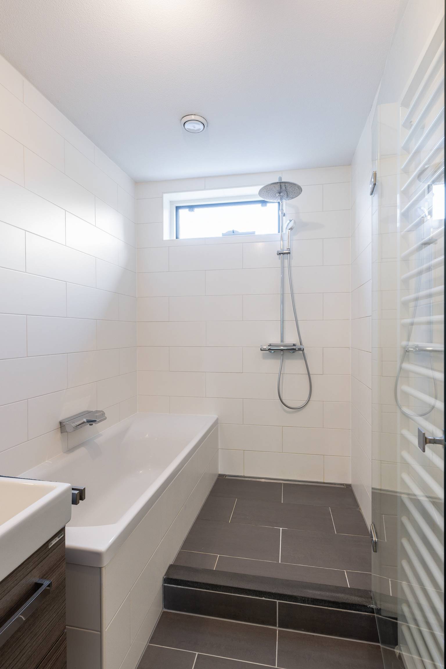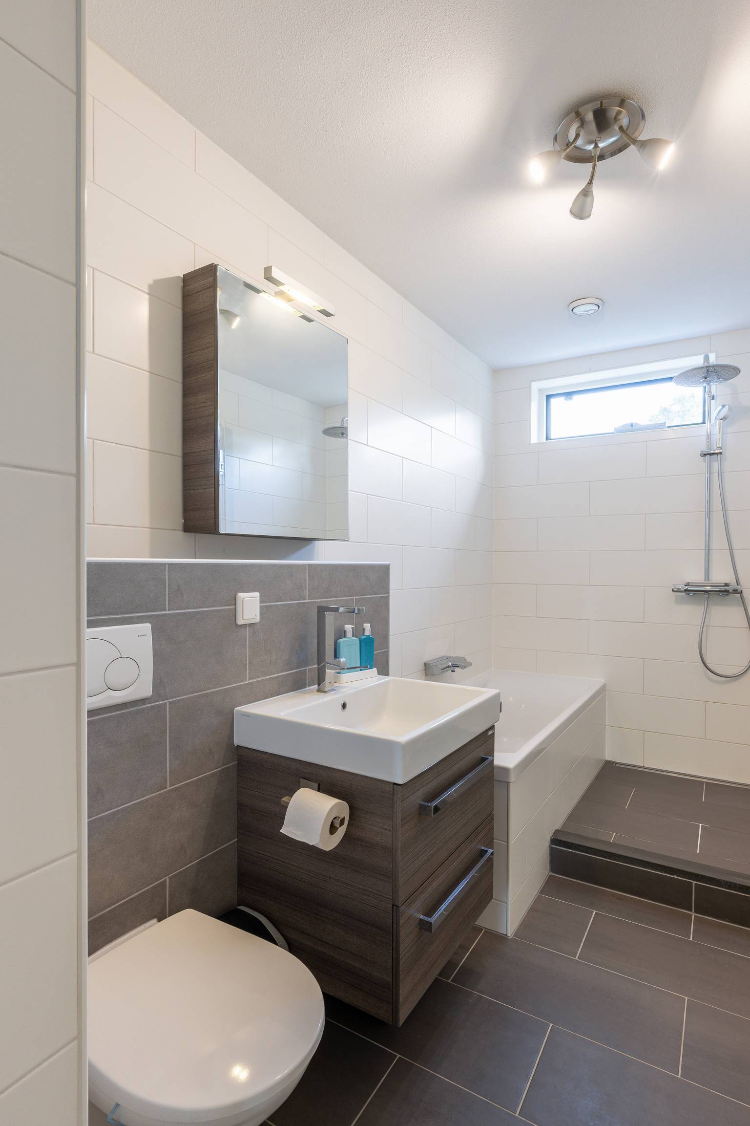 De volledig betegelde badkamer is compleet uitgerust met een ligbad, een inloopdouche, een wastafelmeubel met daarboven een spiegelkast en een toilet. Daarnaast is er een te openen raam en hangt er een design radiator.