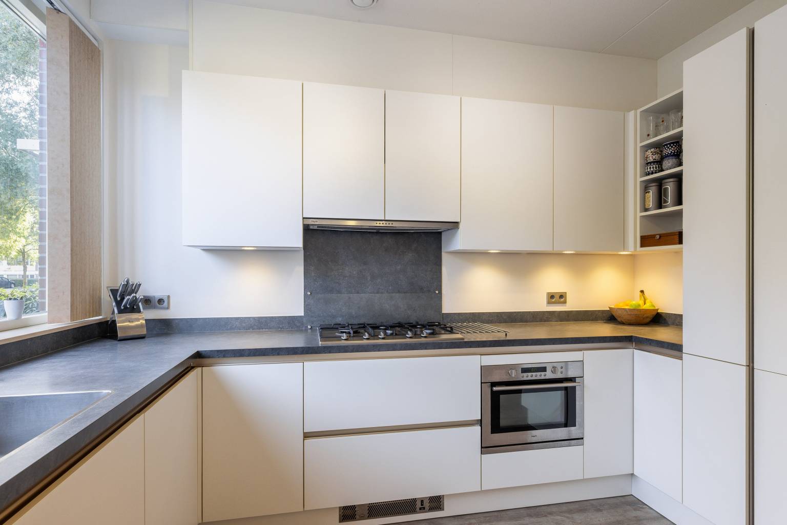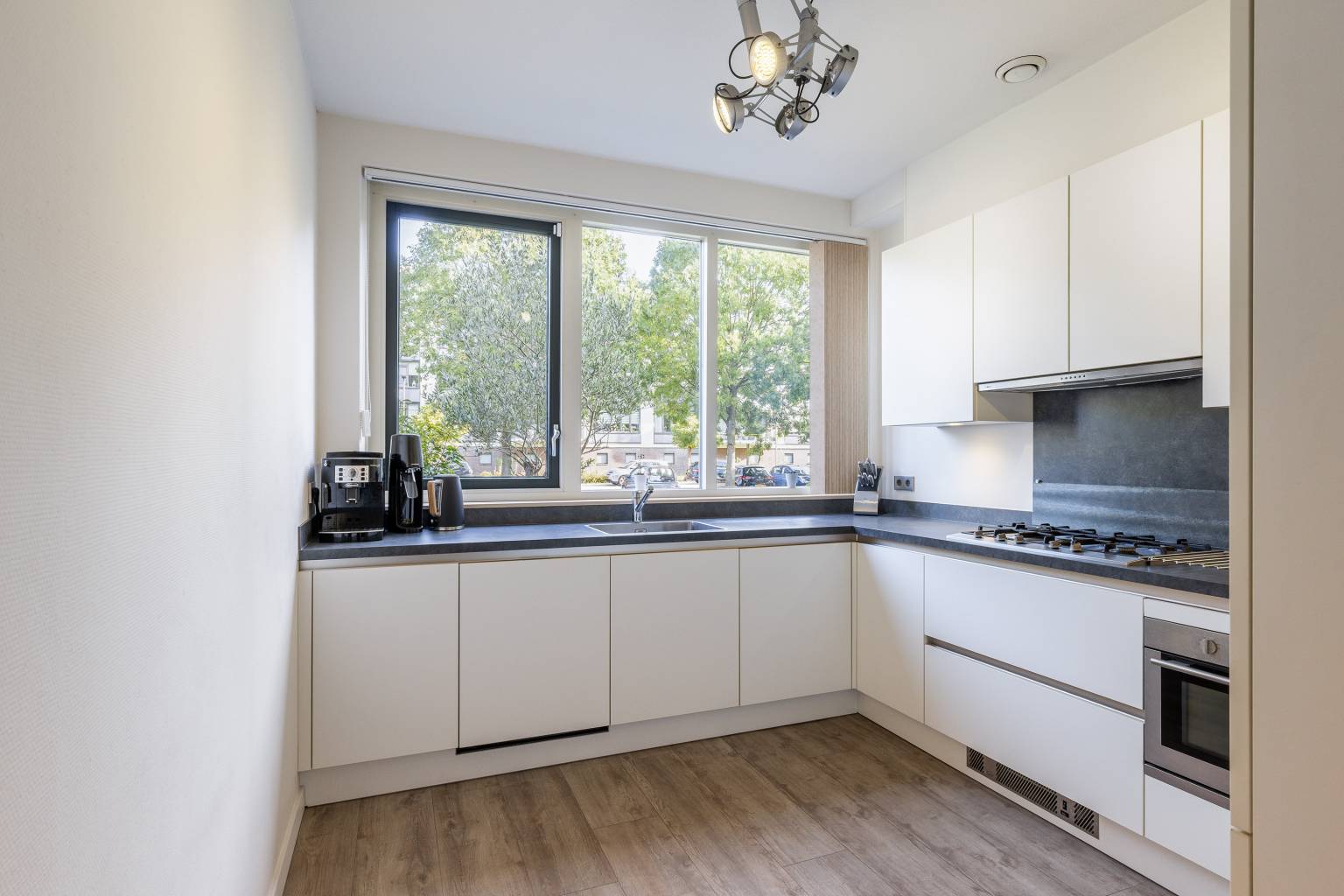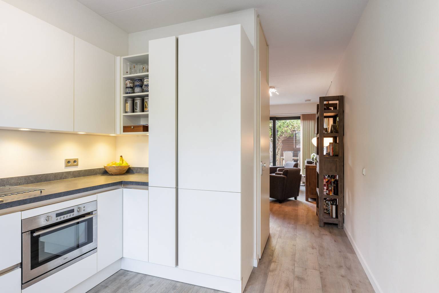 De woonkamer is tuingericht en beschikt over een grote schuifpui die toegang geeft tot de tuin. Er is een extra raam tot aan de vloer en vanuit de woonkamer is er een open verbinding naar de keuken, die gesitueerd is aan de voorzijde. De moderne keuken heeft een strakke uitvoering en is naast bovenkasten met verlichting ook voorzien van diverse inbouwapparatuur, zoals een vaatwasser, een koel-/vriescombinatie, een combioven, een 5-pits gaskookplaat en een afzuigkap die netjes is weggewerkt in de bovenkasten.