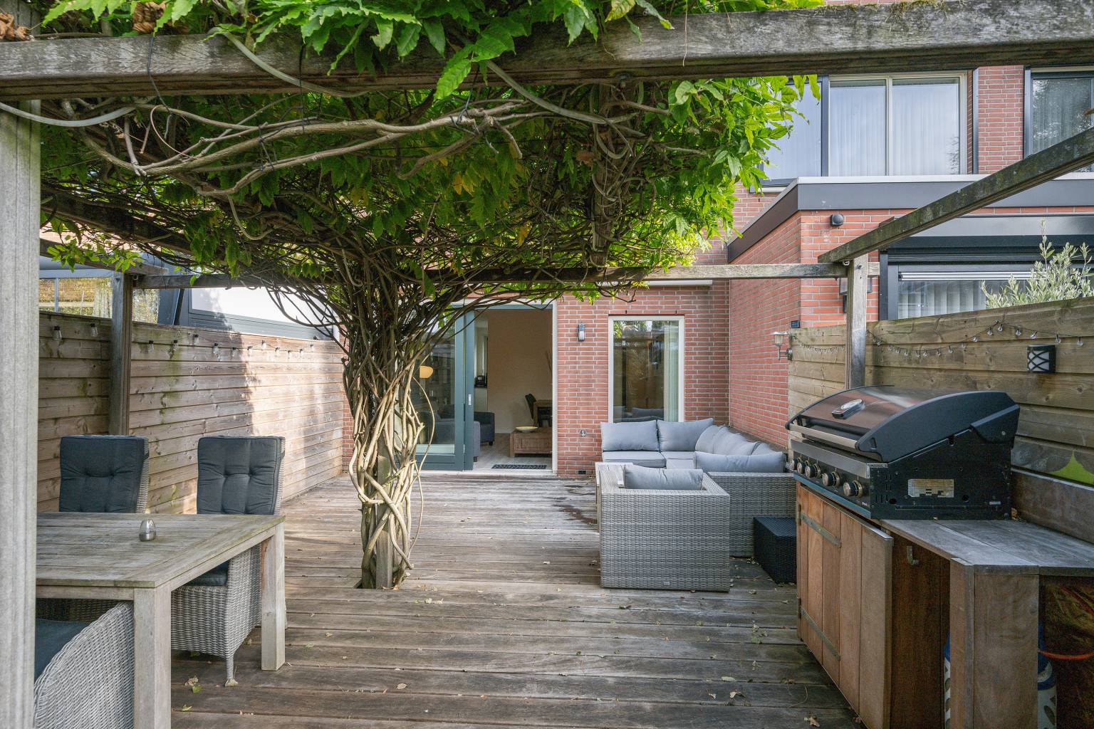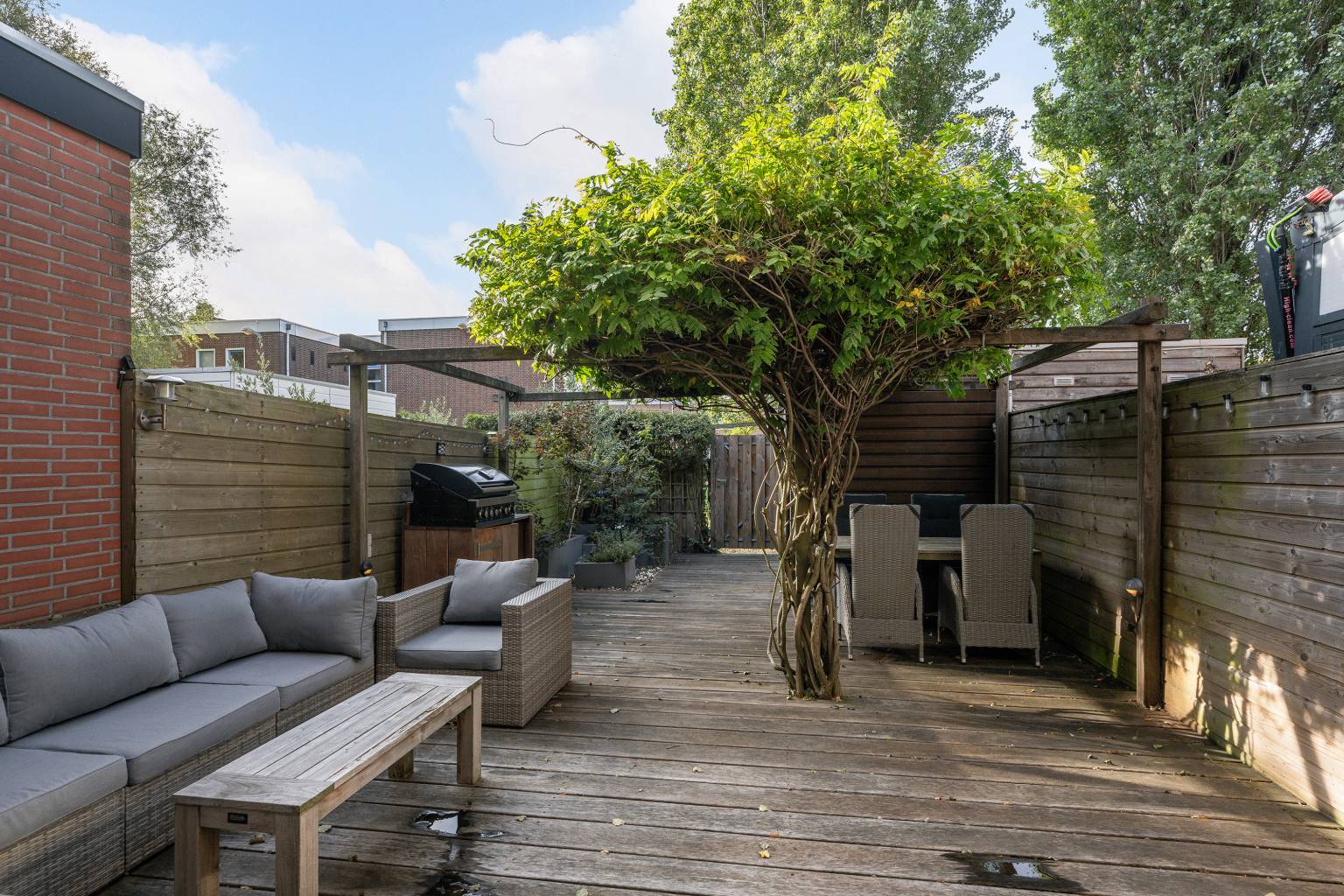 De diepe achtertuin is een fraai geheel door de houten vlonderplanken en schuttingen rondom. Temidden van de tuin staat een pergola met een blauwe regen en achterin de tuin staat een houten berging. Er is een poort naar het achterpad en aan de gevel hangt een elektrisch bedienbaar zonnescherm. Verder is er een waterkraantje aanwezig en hangt er verlichting.