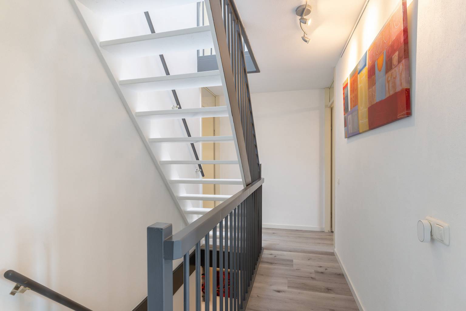 Na de trapopgang is er toegang tot de overloop. Hier zijn de wanden gesausd en ligt er een PVC vloer, die is doorgetrokken naar de drie slaapkamers op deze verdieping. Naast dat de overloop toegang biedt tot de drie slaapkamers, is er ook een trap naar de 2e verdieping en is er toegang tot de badkamer.
