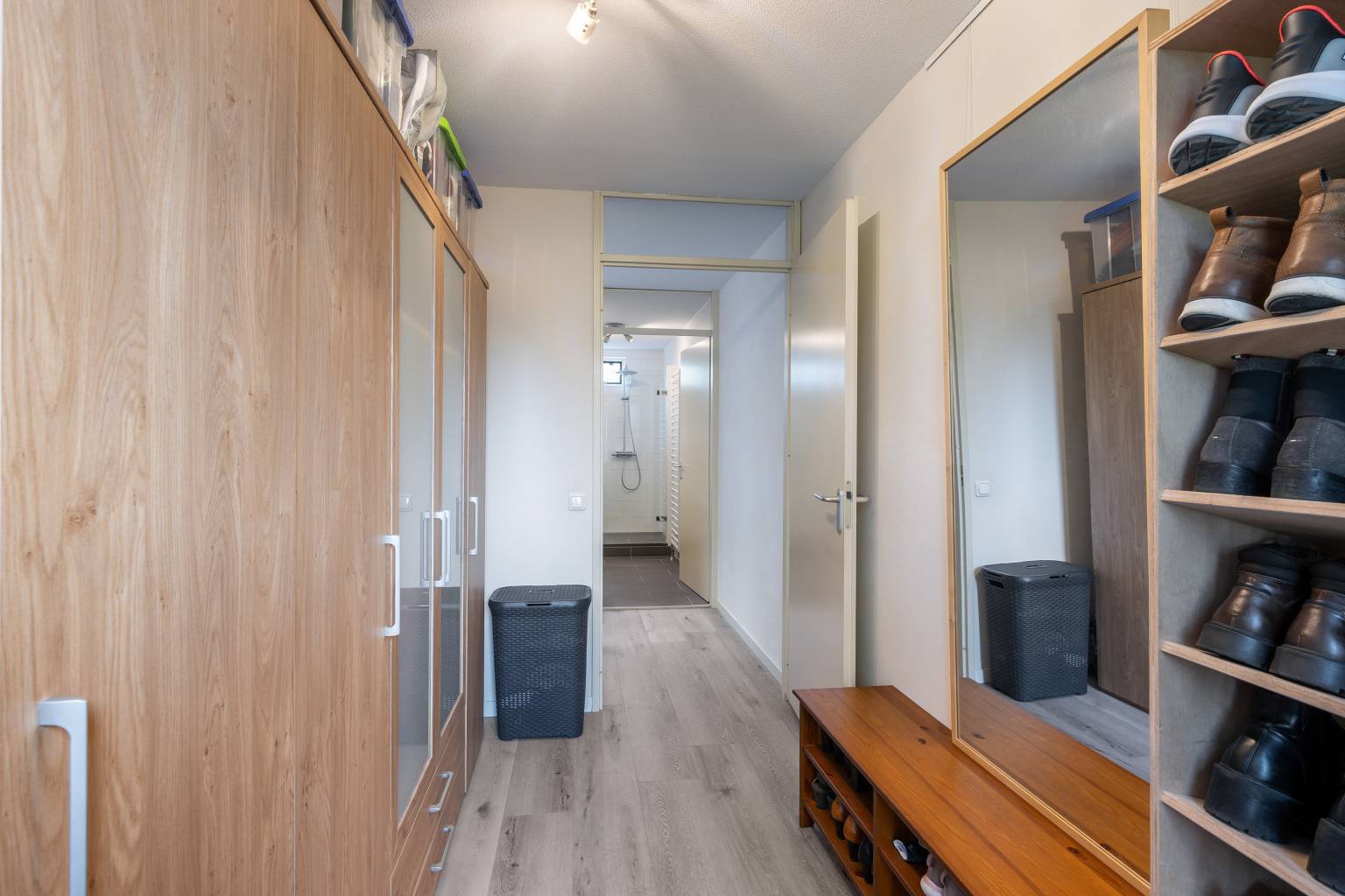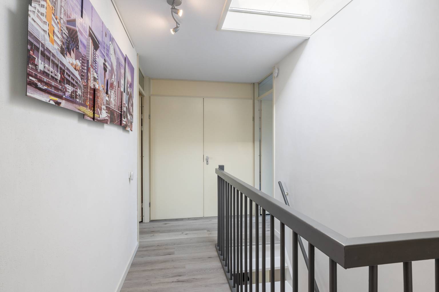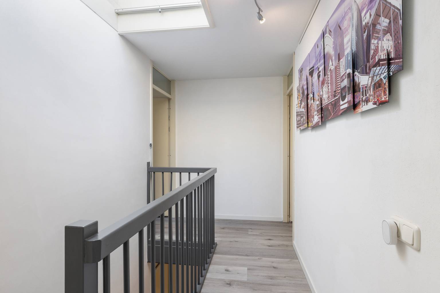 Ook hier is er na de trapopgang toegang tot de overloop, die eveneens is voorzien van een PVC vloer, die volledig is doorgetrokken over de gehele verdieping. De wanden zijn hier gesausd en boven het trapgat is een daklicht aanwezig. Daarnaast is er nog een vaste kast aanwezig, waarin zich o.a. de opstelling van de Cv-ketel bevindt. Vanaf de overloop is er toegang tot de vierde en vijfde slaapkamer en de wasruimte.
