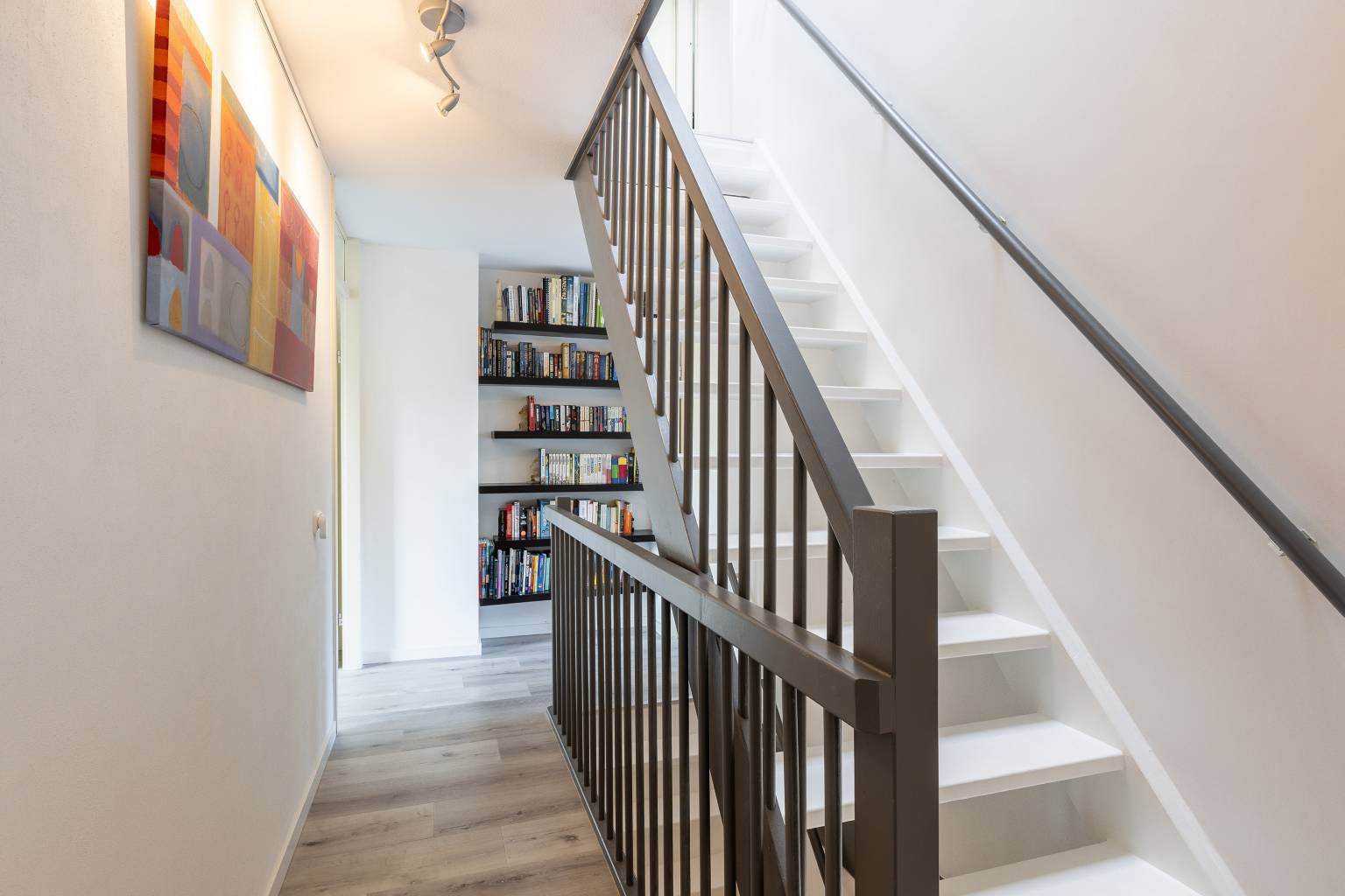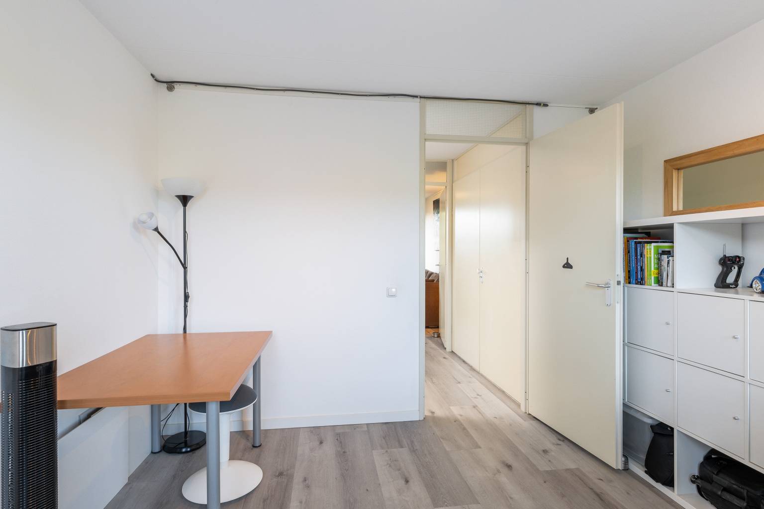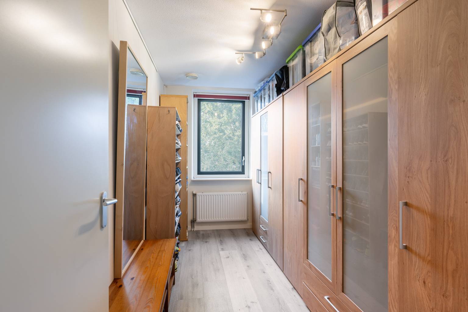 Ook hier is er na de trapopgang toegang tot de overloop, die eveneens is voorzien van een PVC vloer, die volledig is doorgetrokken over de gehele verdieping. De wanden zijn hier gesausd en boven het trapgat is een daklicht aanwezig. Daarnaast is er nog een vaste kast aanwezig, waarin zich o.a. de opstelling van de Cv-ketel bevindt. Vanaf de overloop is er toegang tot de vierde en vijfde slaapkamer en de wasruimte.